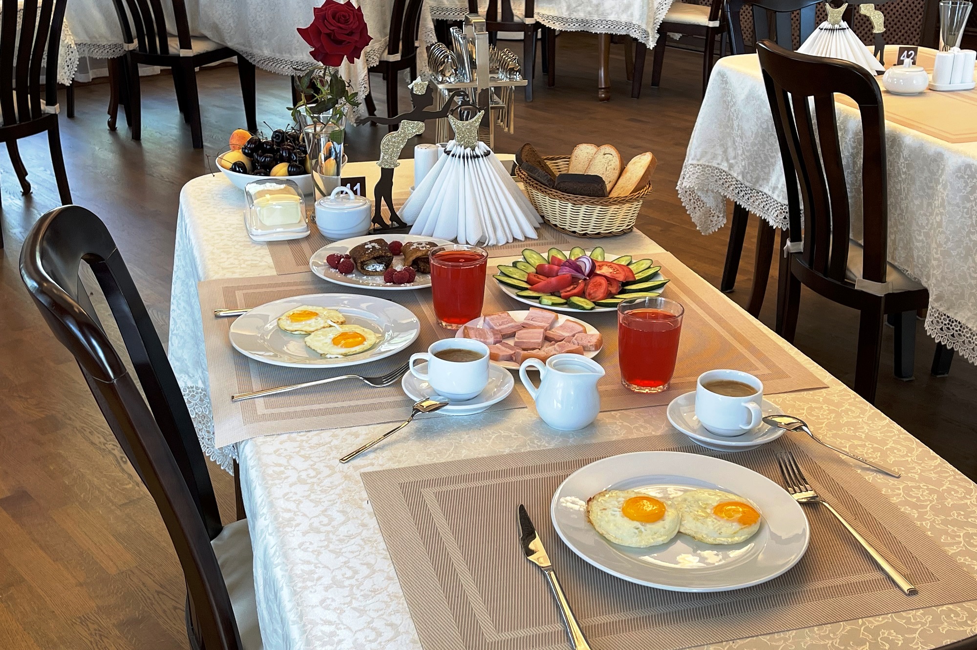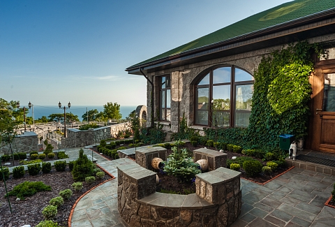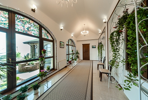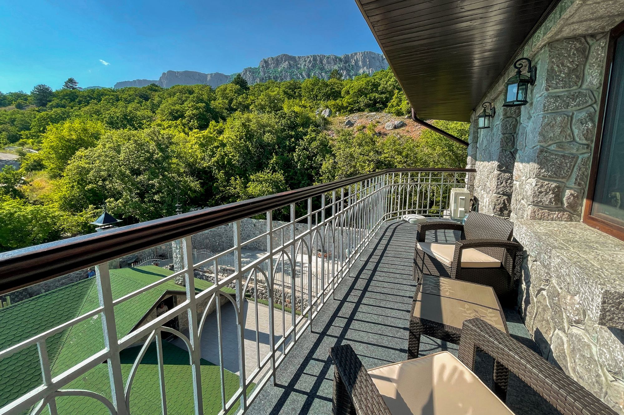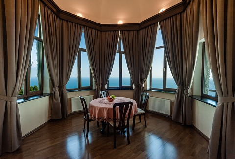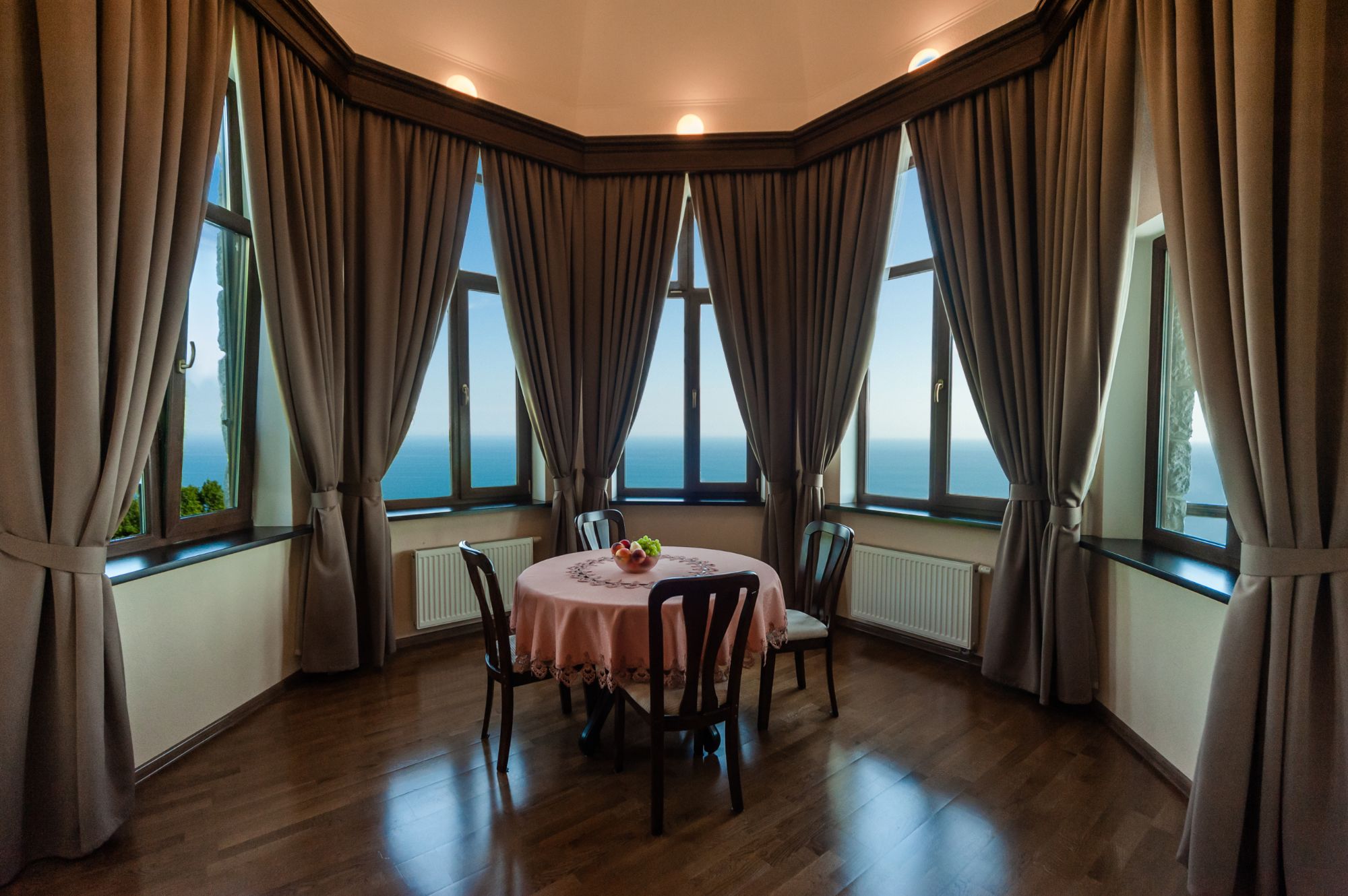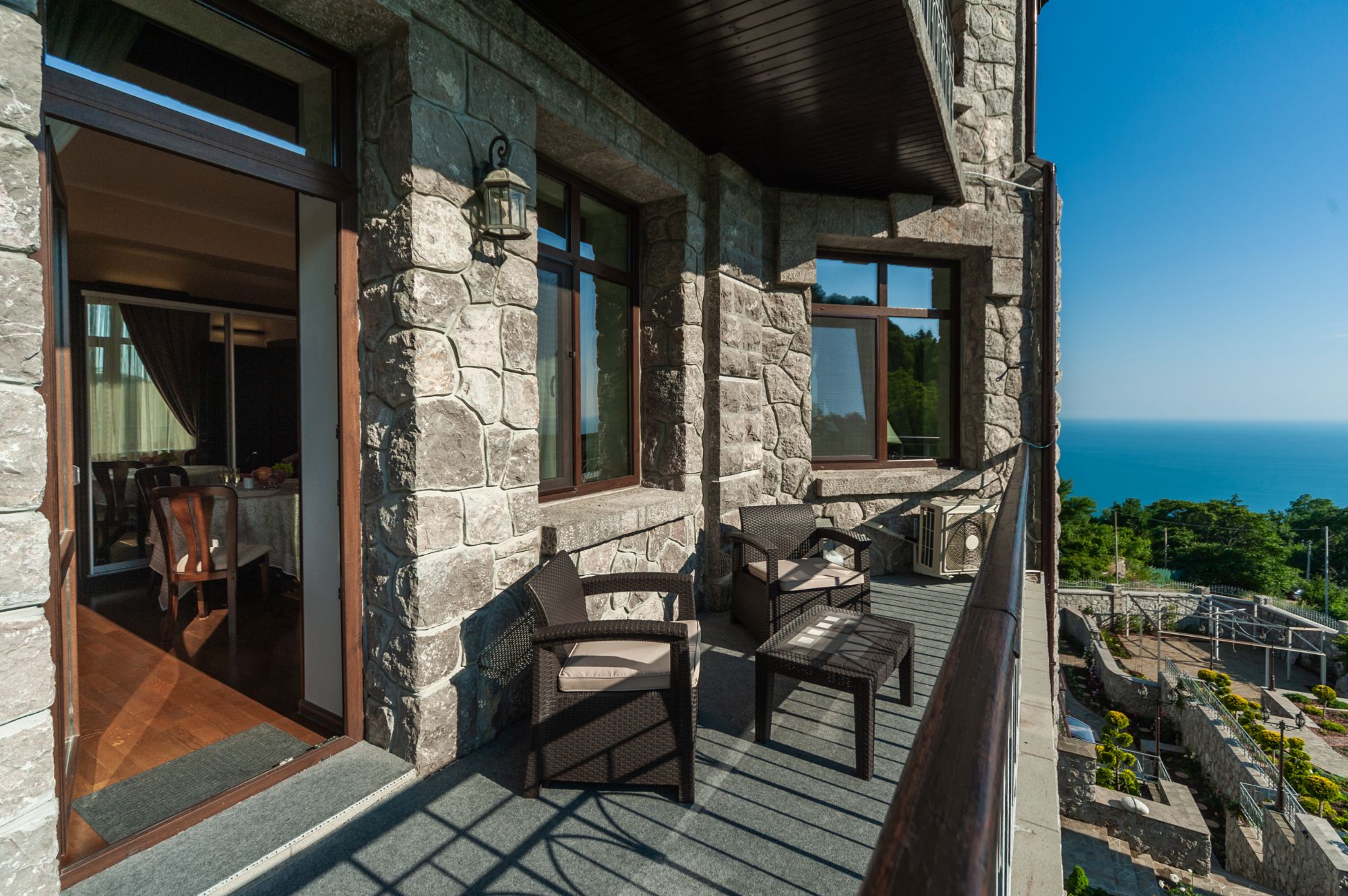 На втором, третьем и четвертом этажах располагаются комфортабельные номера, названные в честь природных достопримечательностей Крыма. В каждом номере предусмотрен индивидуальный санузел, есть кондиционер, плазменный телевизор, набор посуды, подключен интернет. В гостевом доме работает ресторан, на территории организован открытый бассейн с зоной для отдыха и загара. На территории «Замка» расположена летняя площадка для пикников под открытым небом. Здесь есть мангал приготовления шашлыков, где гости могут готовить себе, как самостоятельно, так и с нашей помощью. Оборудован небольшой тренажерный зал с беговыми дорожками. Посещая тренажерный зал «Замка», наши гости могут поддерживать спортивную форму даже в дождливую или снежную погоду.При желании гости могут заняться виндсерфингом, вейкбордингом, дайвингом, полетать на параплане, покататься на гидроциклах или водных лыжах. Все эти развлечения предоставляет пятизвёздочный отель «Мрия», расположенный на берегу в 10 км от гостевого дома.