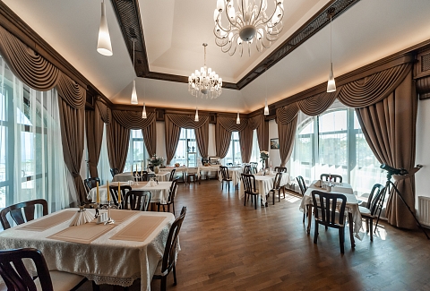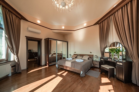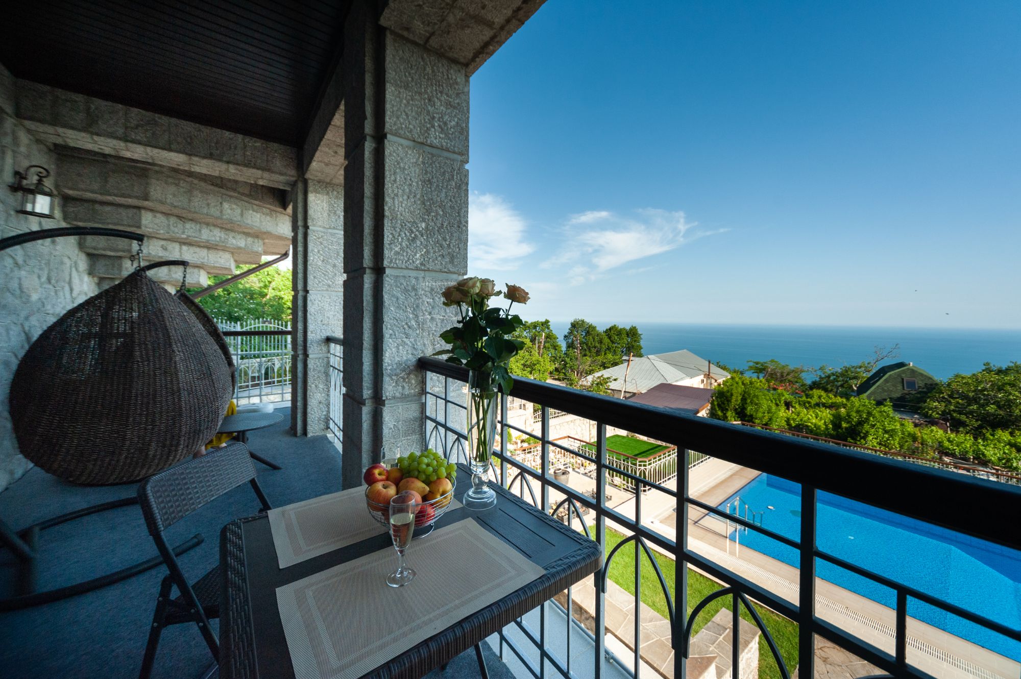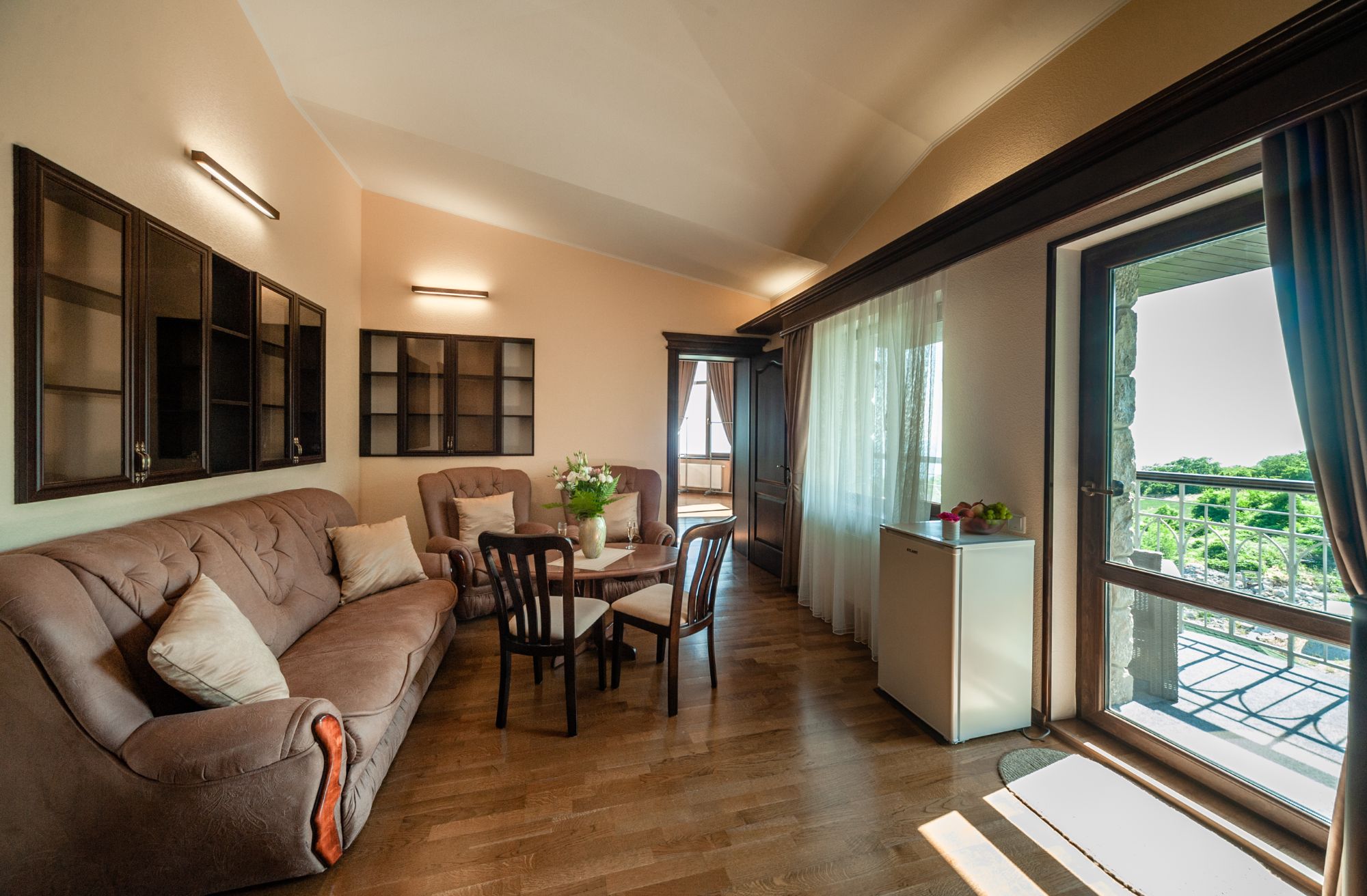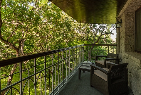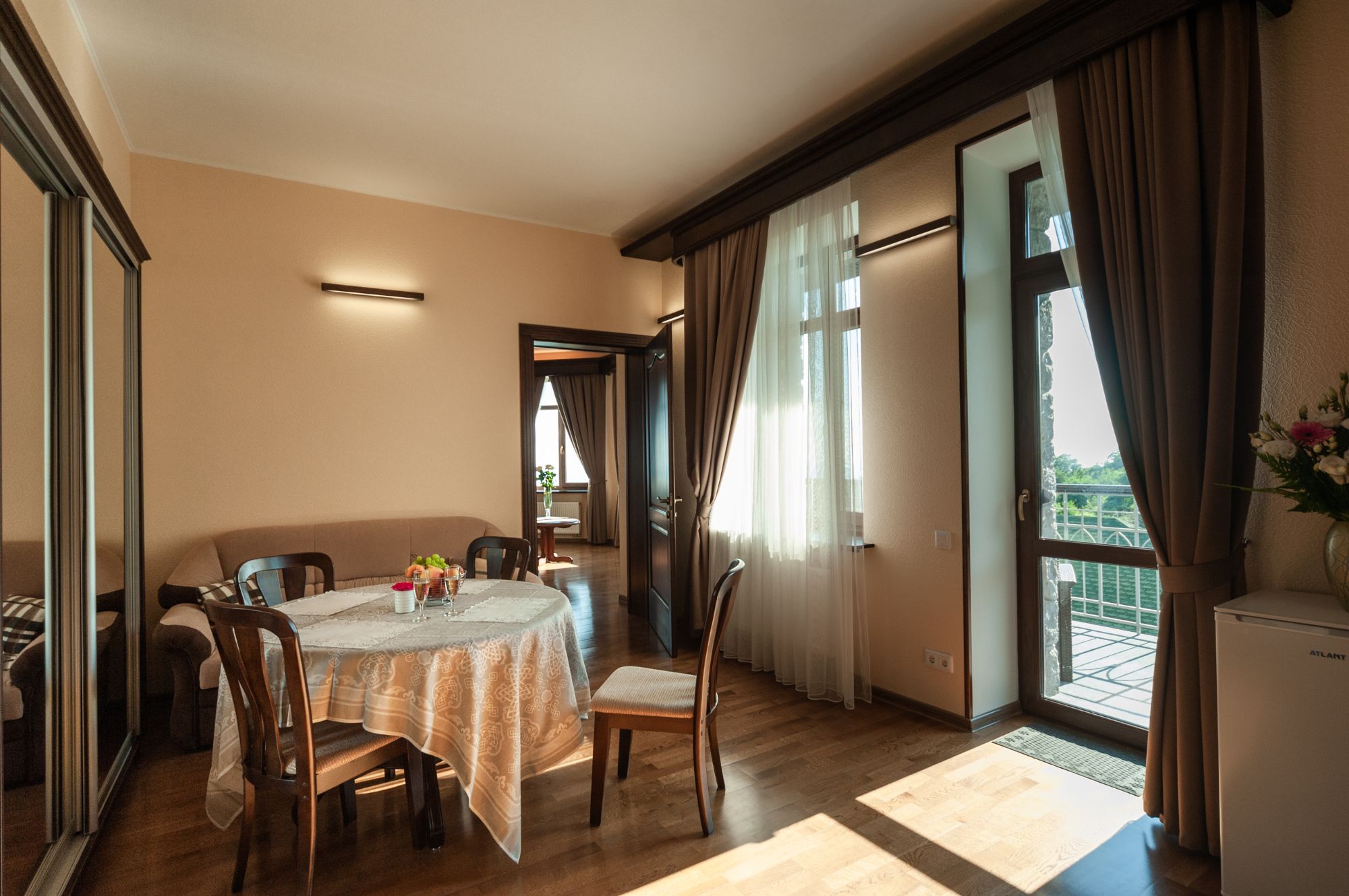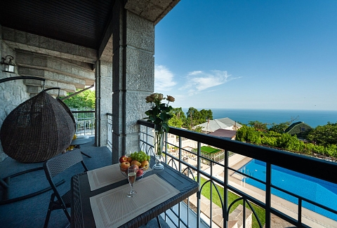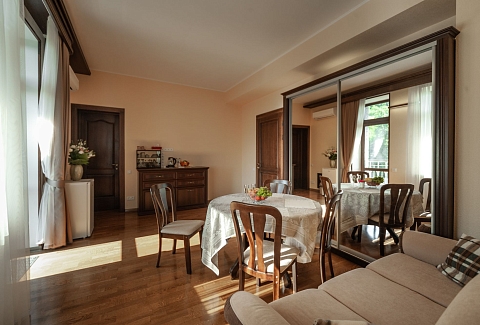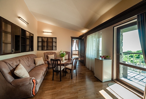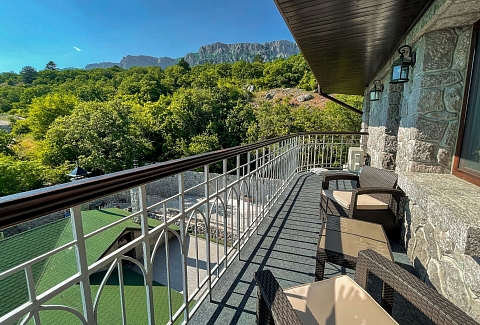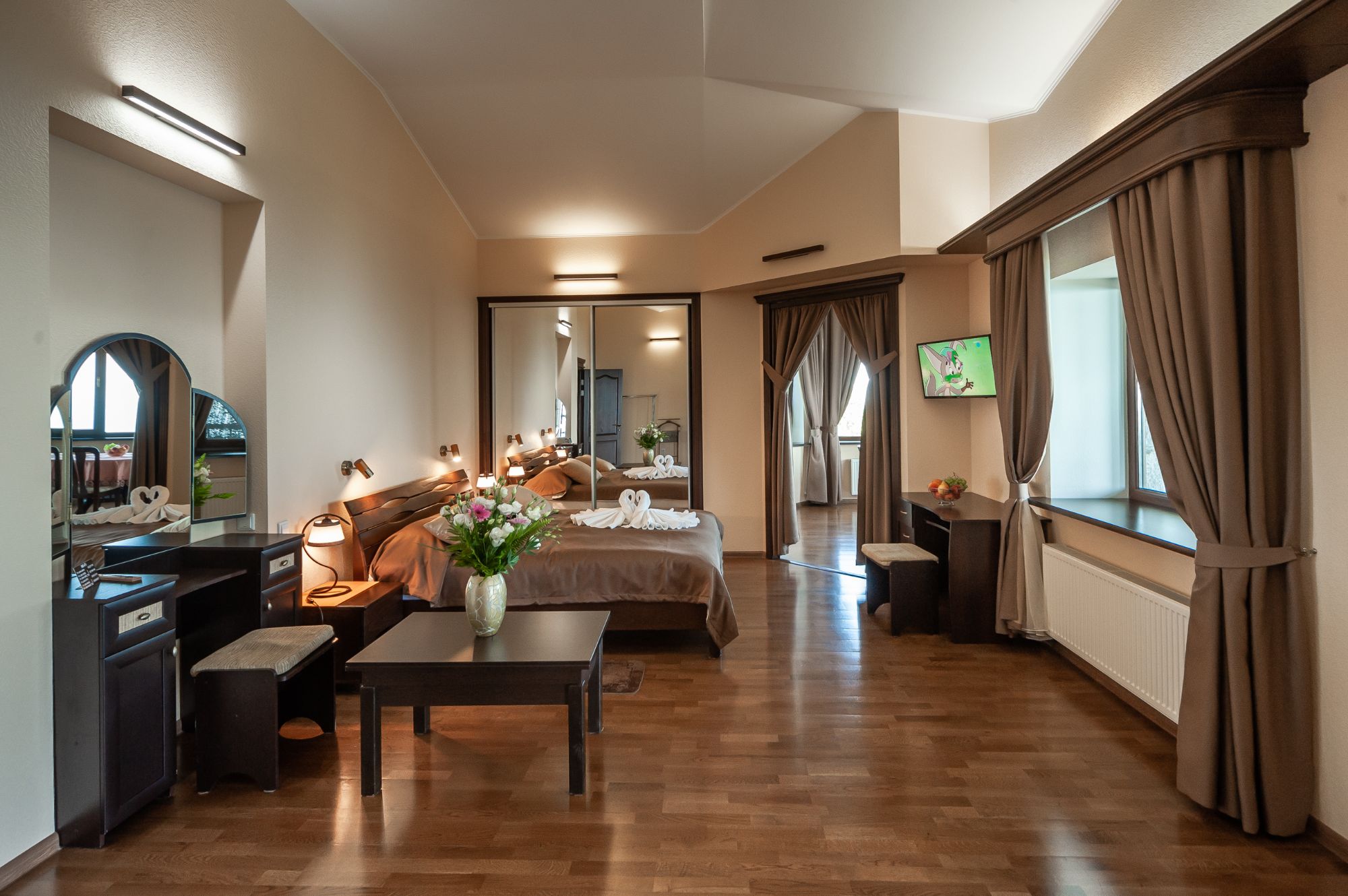 В номере: вешалка, диван, зеркало, кресла, кровать двуспальная, прикроватные тумбочки, стол, столик туалетный, стул, тумба, шкаф, гладильная доска, кондиционер, мини-холодильник, набор посуды, сейф, телевизор, утюг, электрочайник