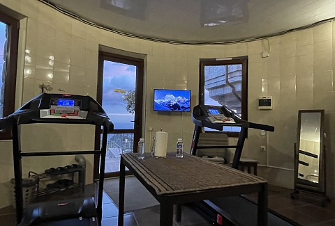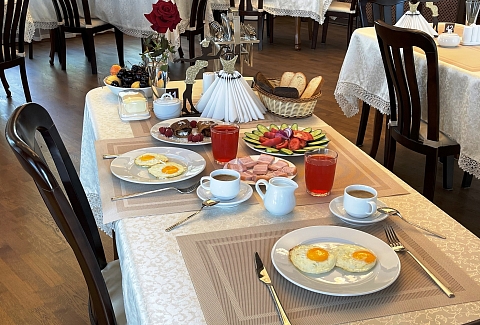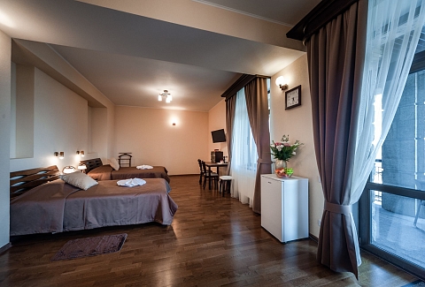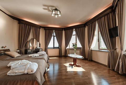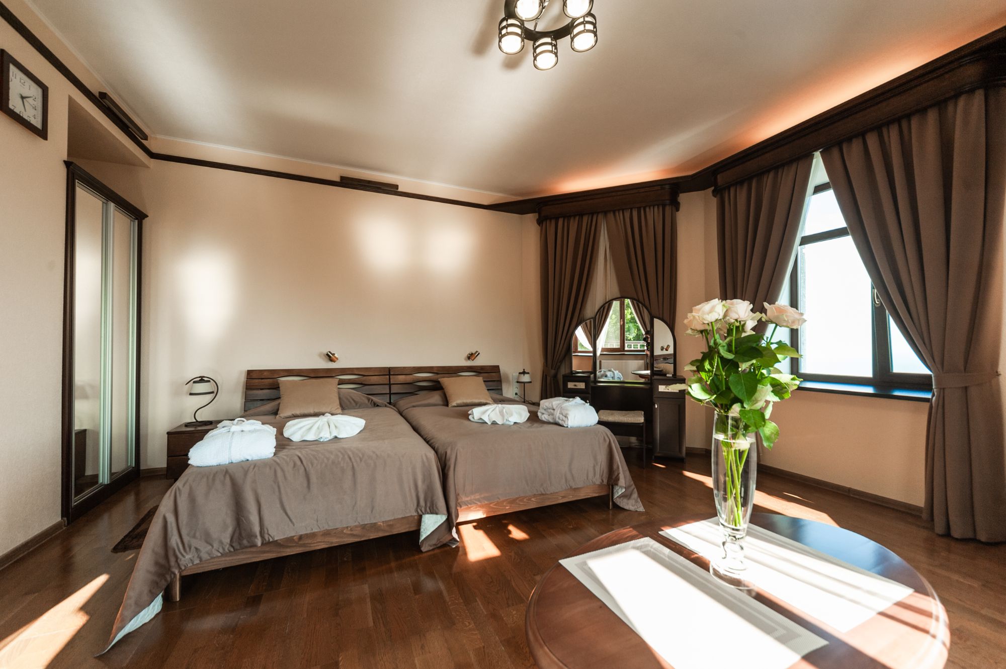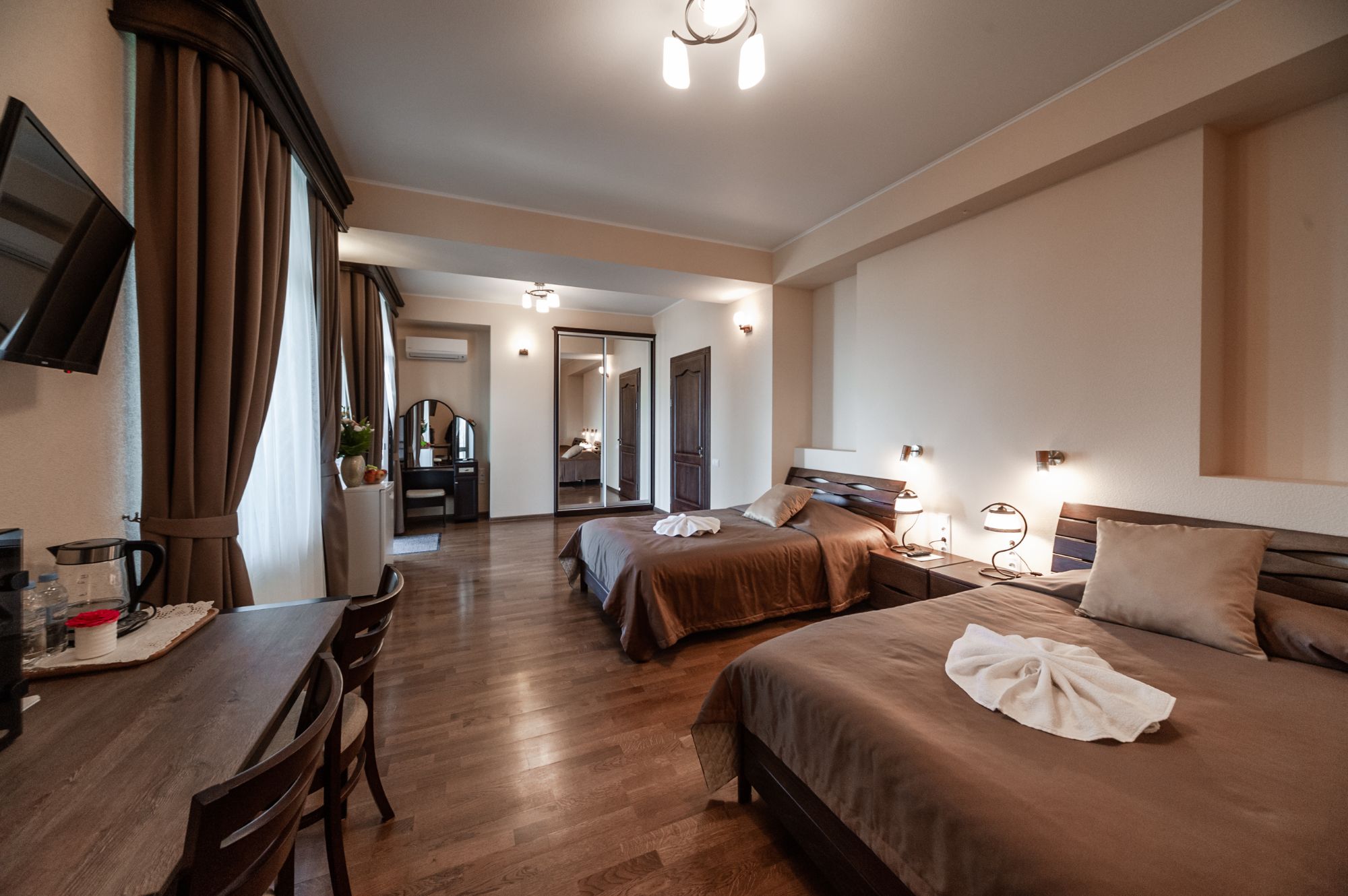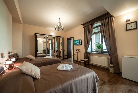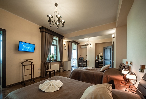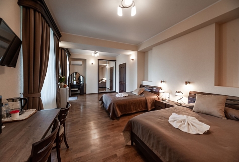 В номере: вешалка, диван, зеркало, кровати полутороспальные, прикроватные тумбочки, стол, столик журнальный, столик туалетный, стулья, шкаф, гладильная доска, кондиционер, мини-холодильник, набор посуды, сейф, телевизор, утюг, электрочайник