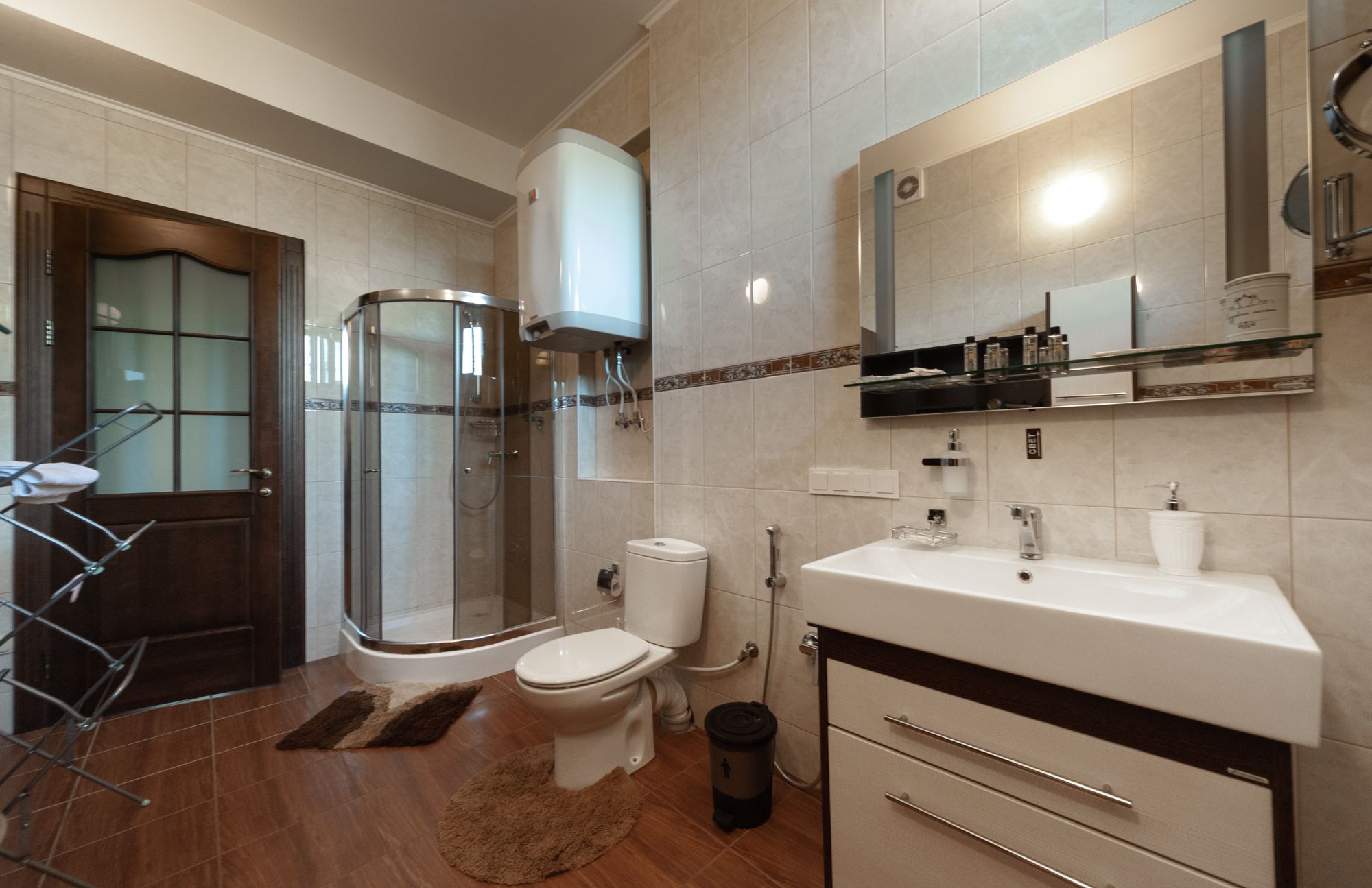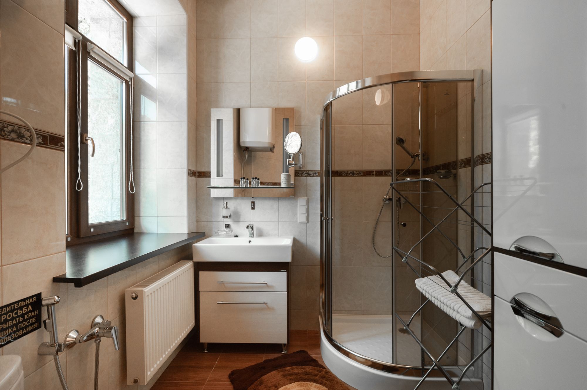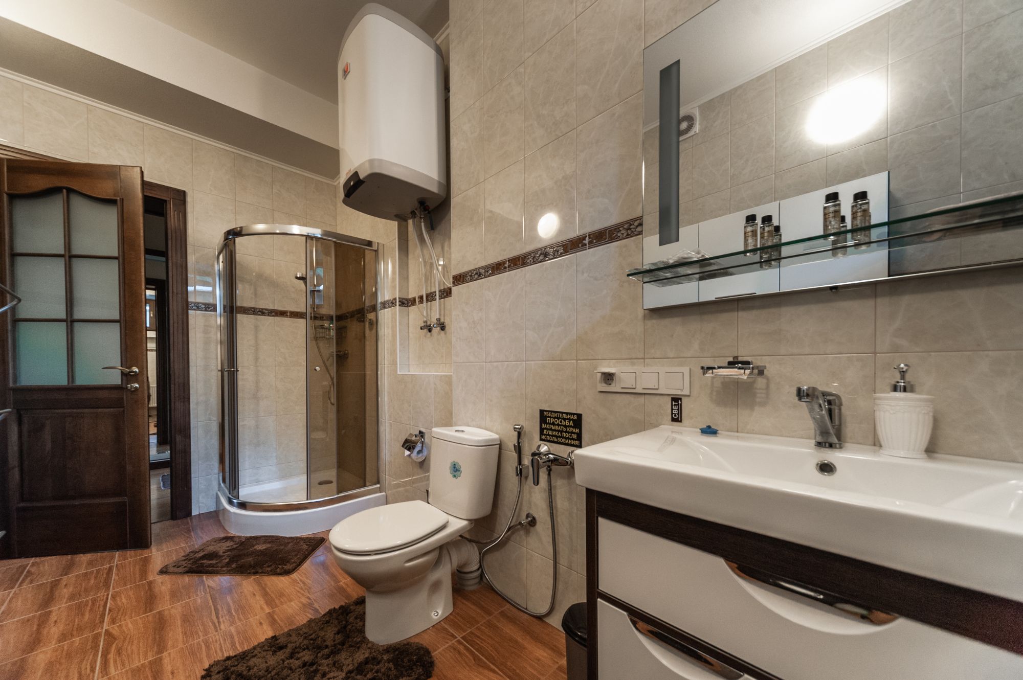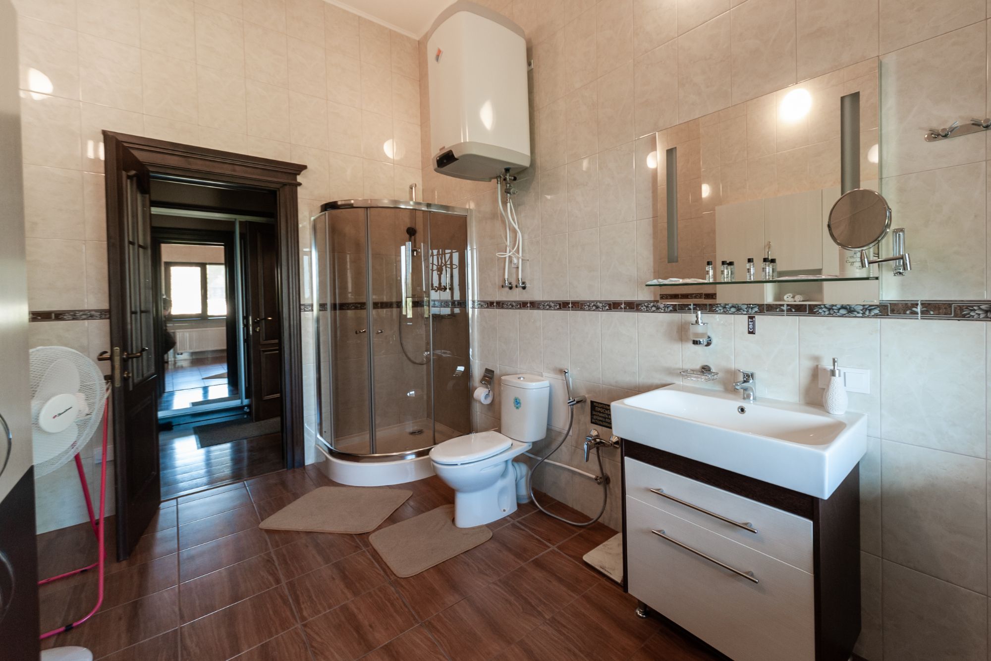 Санузел: с душем, туалетные принадлежности, фен, халат