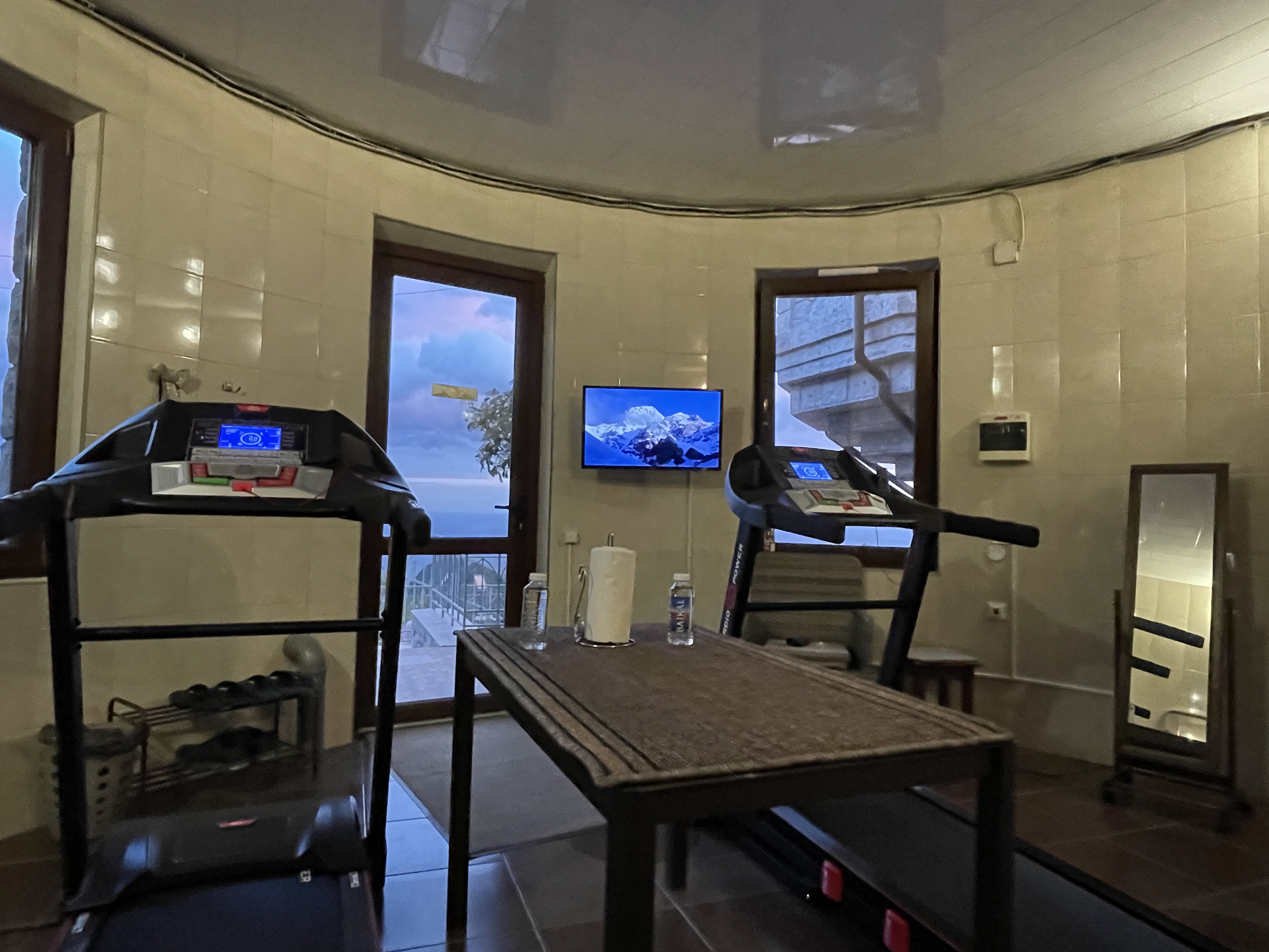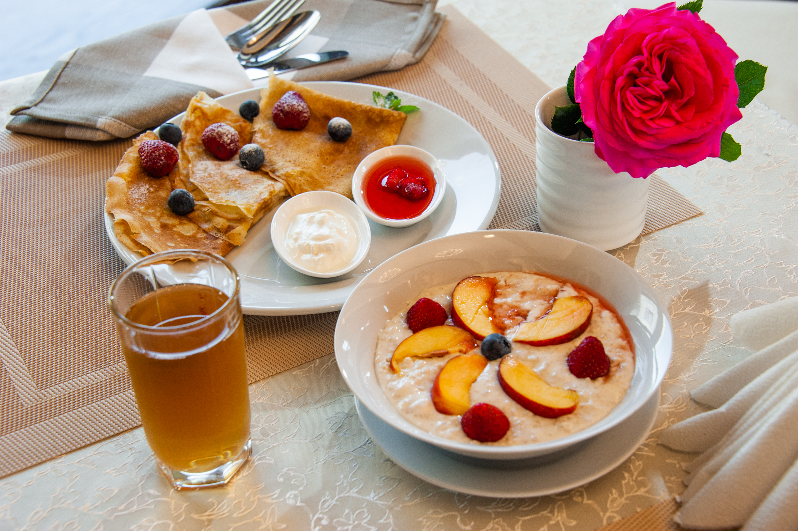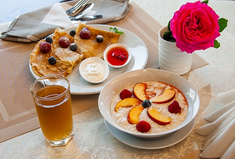 В номере: вешалка, зеркало, кровать двуспальная, прикроватные тумбочки, стол, столик туалетный, стулья, тумба, шкаф, гладильная доска, кондиционер, мини-холодильник, набор посуды, сейф, телевизор, утюг, электрочайник