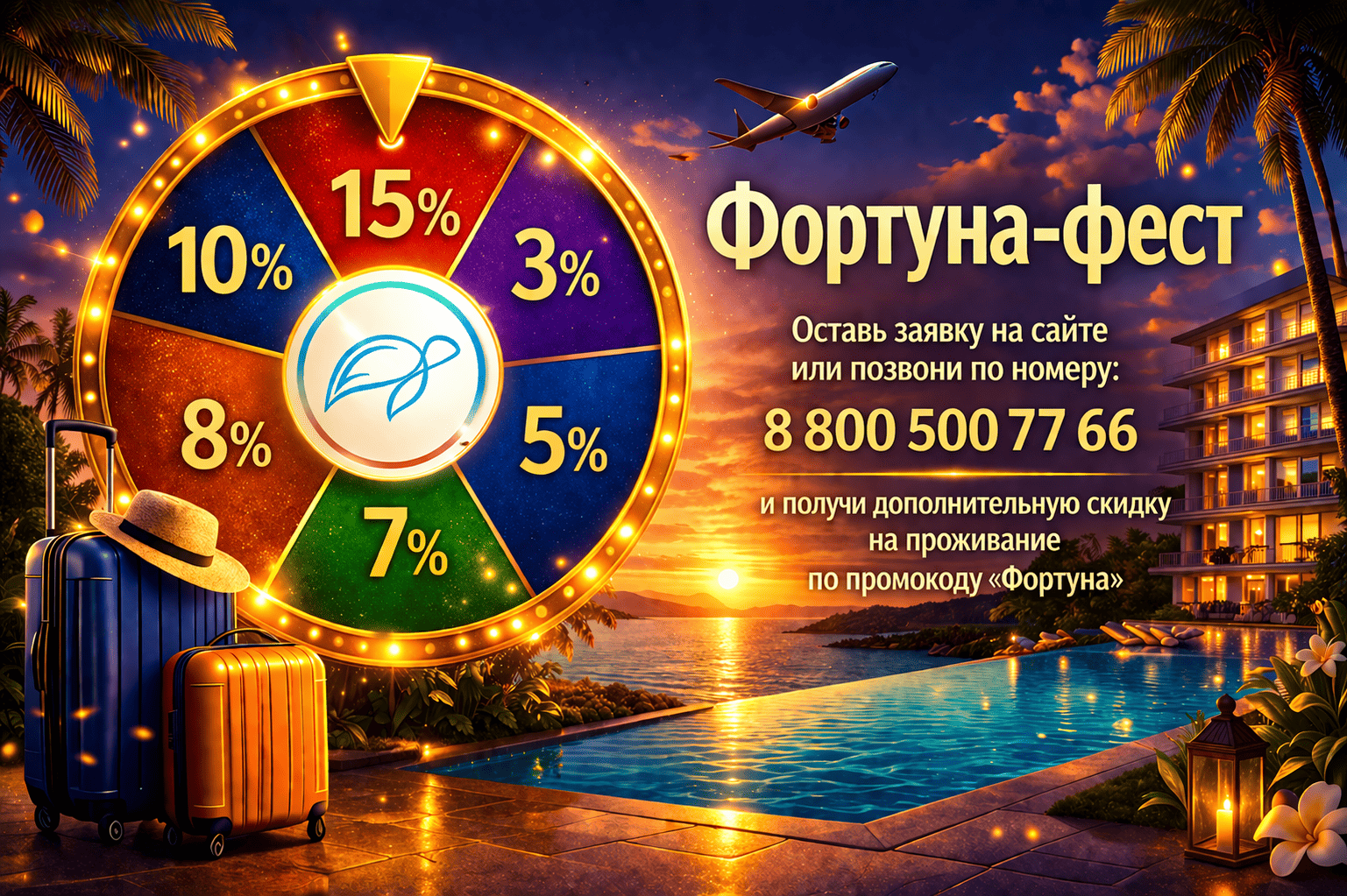 8 800 500 77 66, чтобы воспользоваться специальным предложением. Назовите менеджеру промокод «Фортуна» и получите выгодные условия бронирования отдыха.