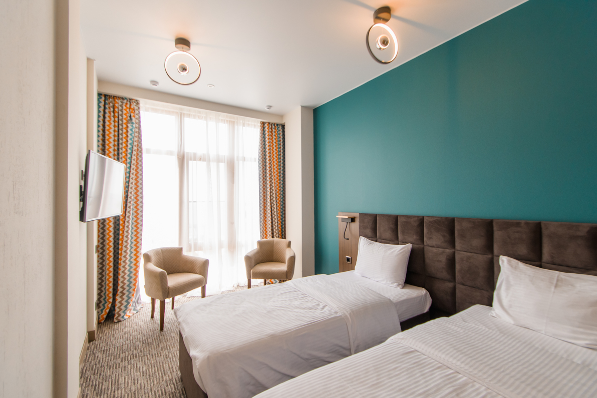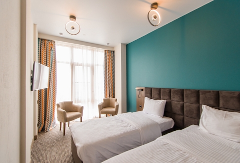 В номере: вешалка, зеркало, кресло-кровать, кровати односпальные /одна двуспальная кровать, прикроватные тумбочки, стол, стул, шкаф, мини-холодильник, набор посуды, сплит-система, телевизор ЖК