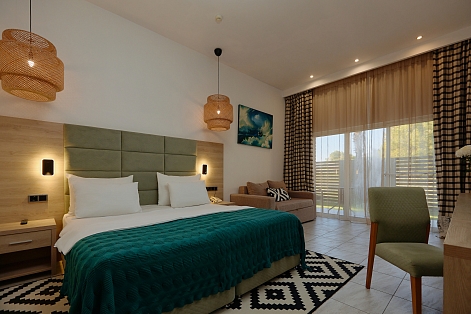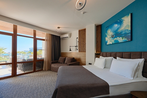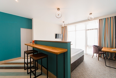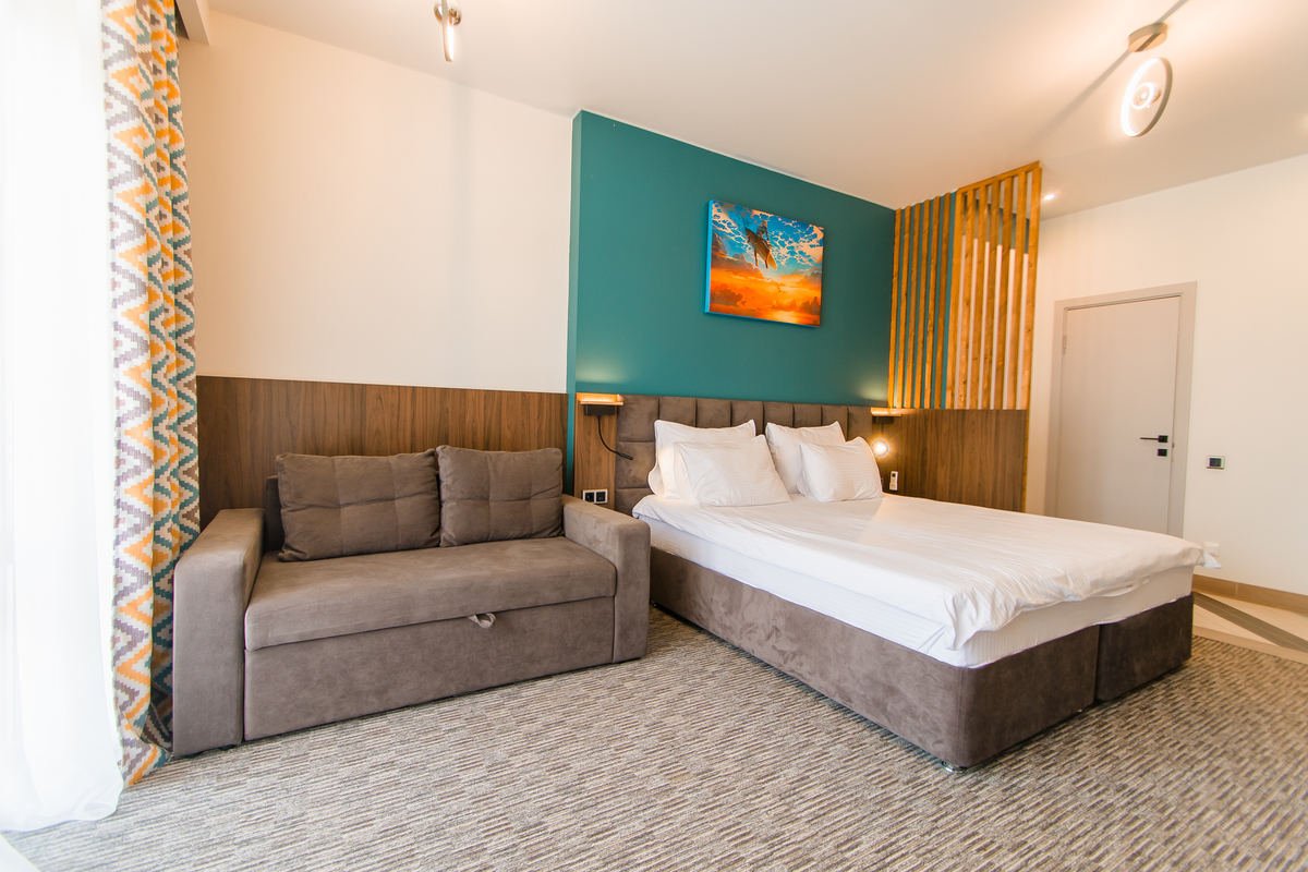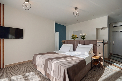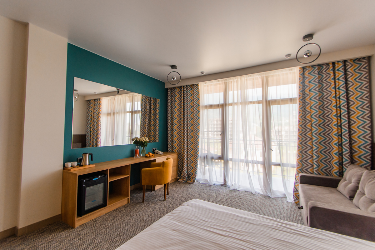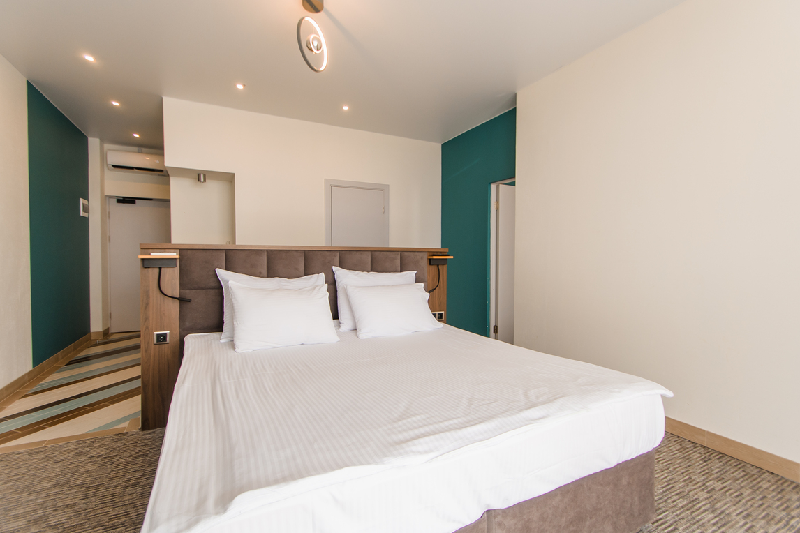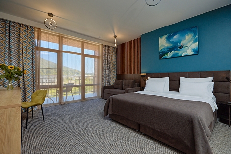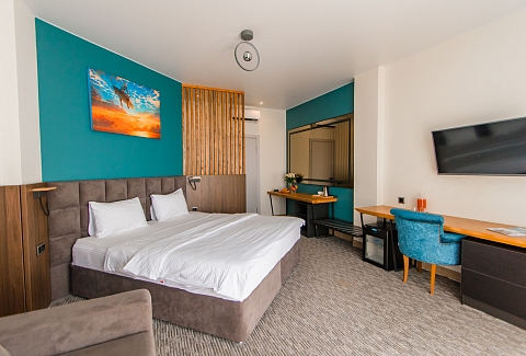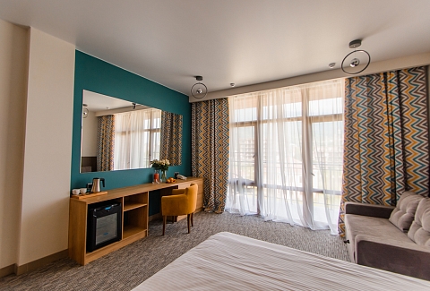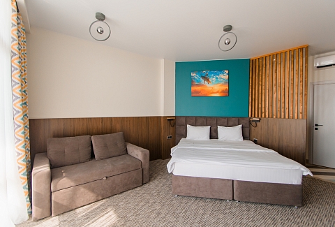 В номере: вешалка, диван раскладной, зеркало, кровать двуспальная, прикроватные тумбочки, стол, стул, шкаф, мини-холодильник, набор посуды, сплит-система, телевизор ЖК
