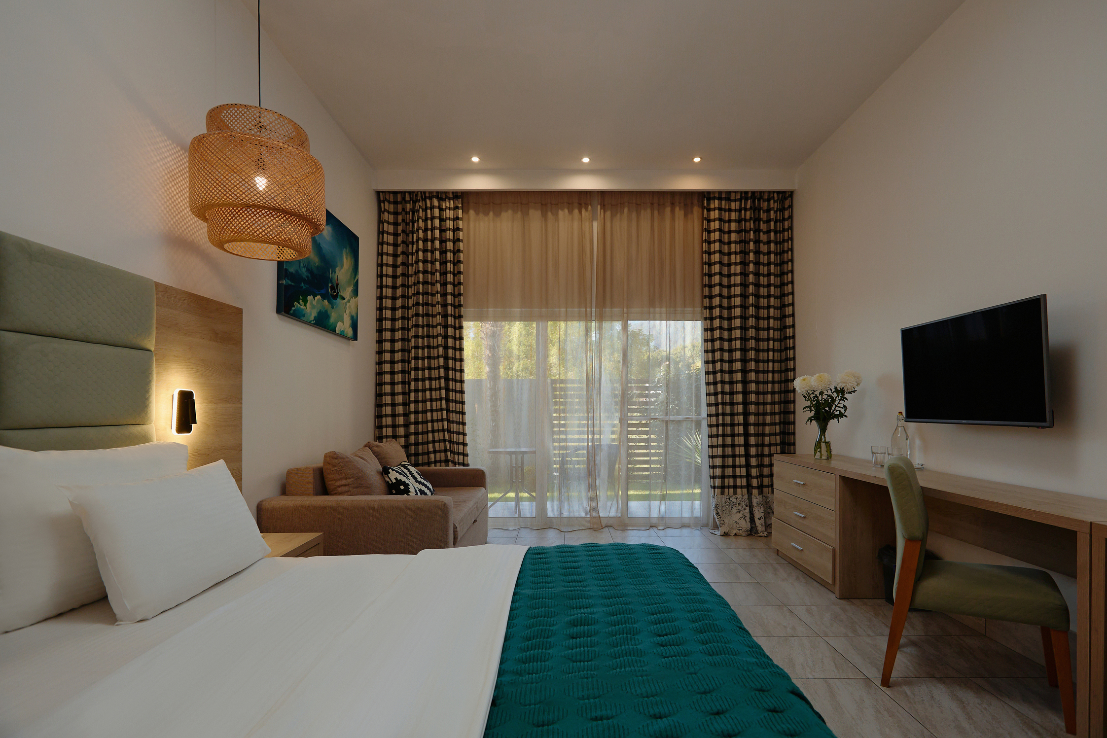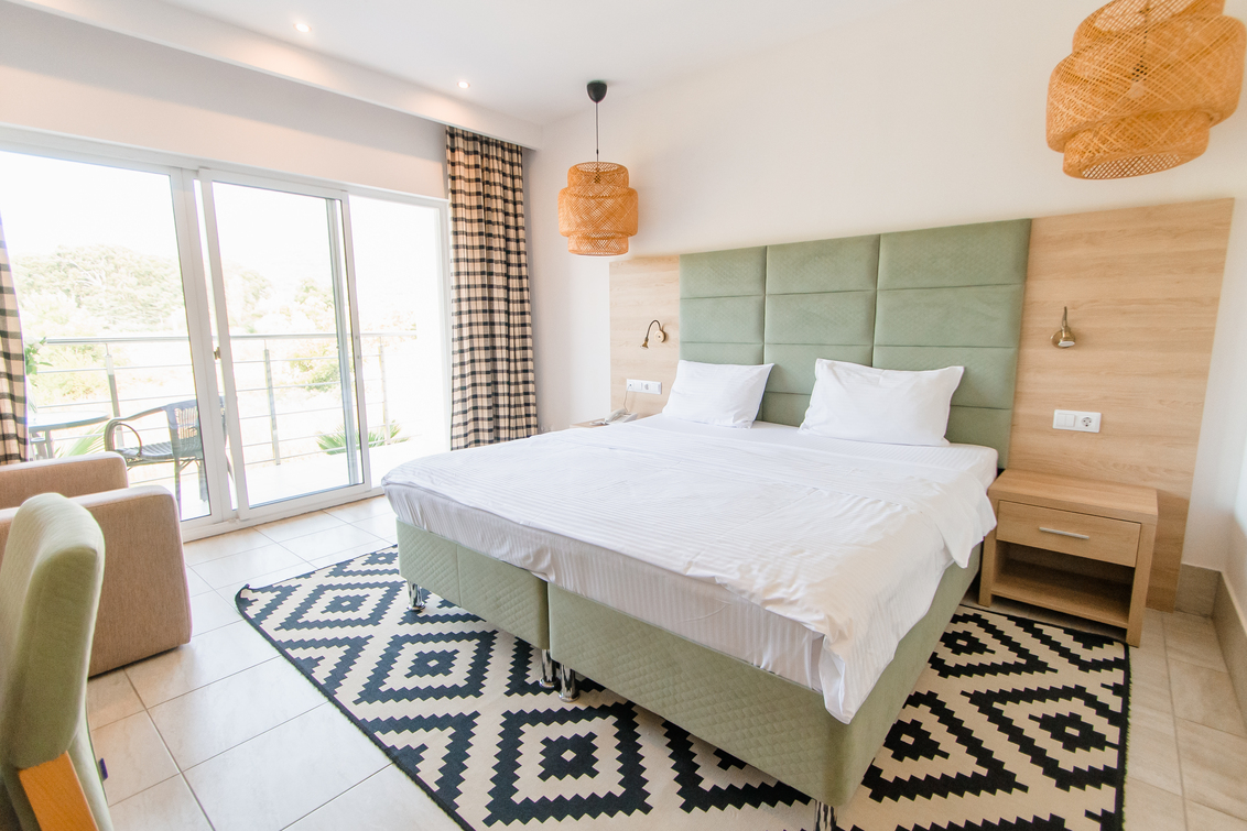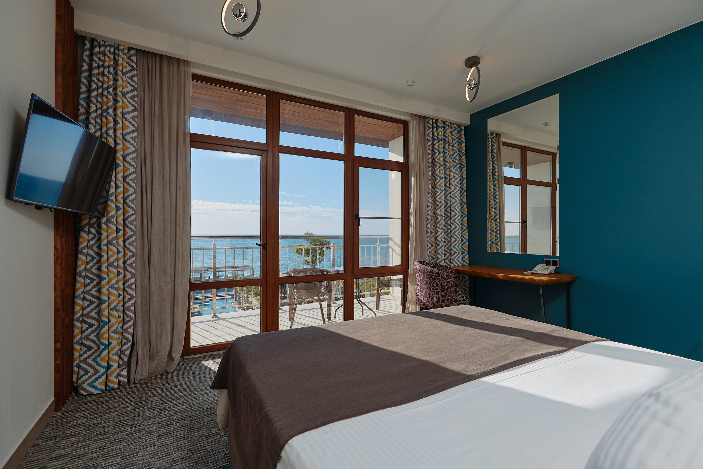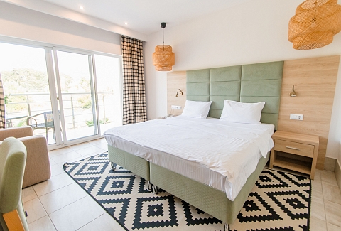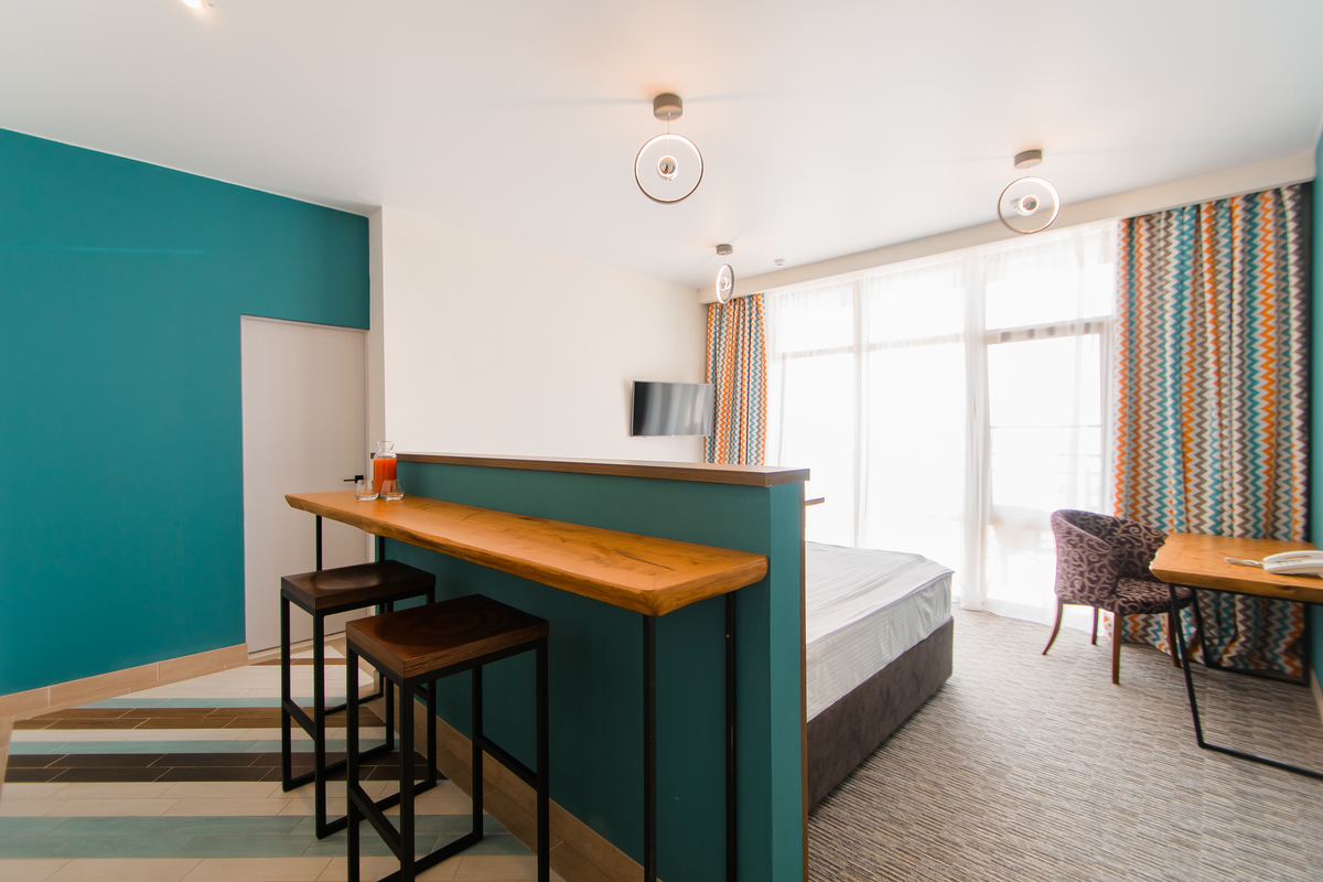 В номере: вешалка, диван раскладной, зеркало, кровать двуспальная, прикроватные тумбочки, стол, стул, шкаф, мини-холодильник, набор посуды, сплит-система, телевизор ЖК