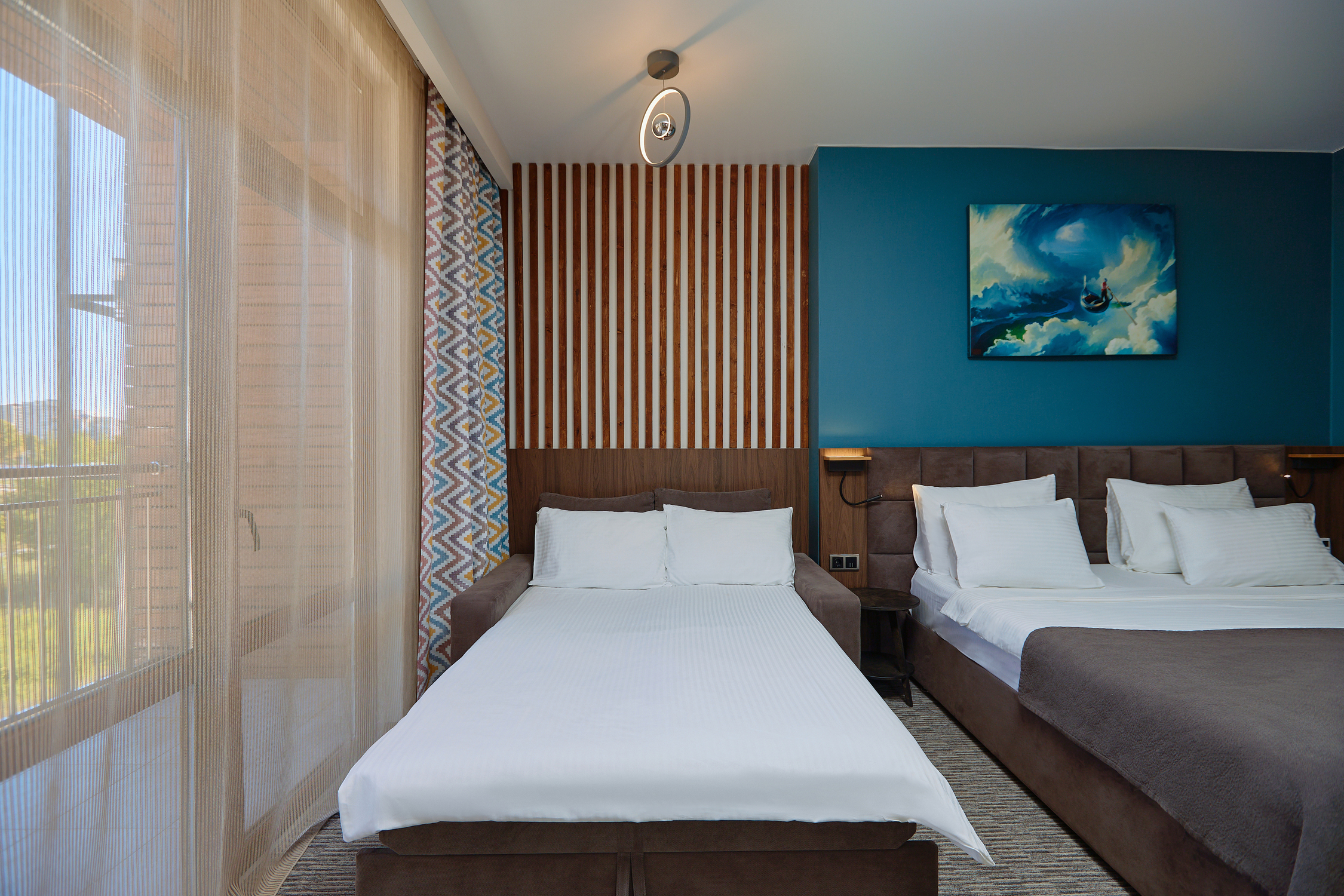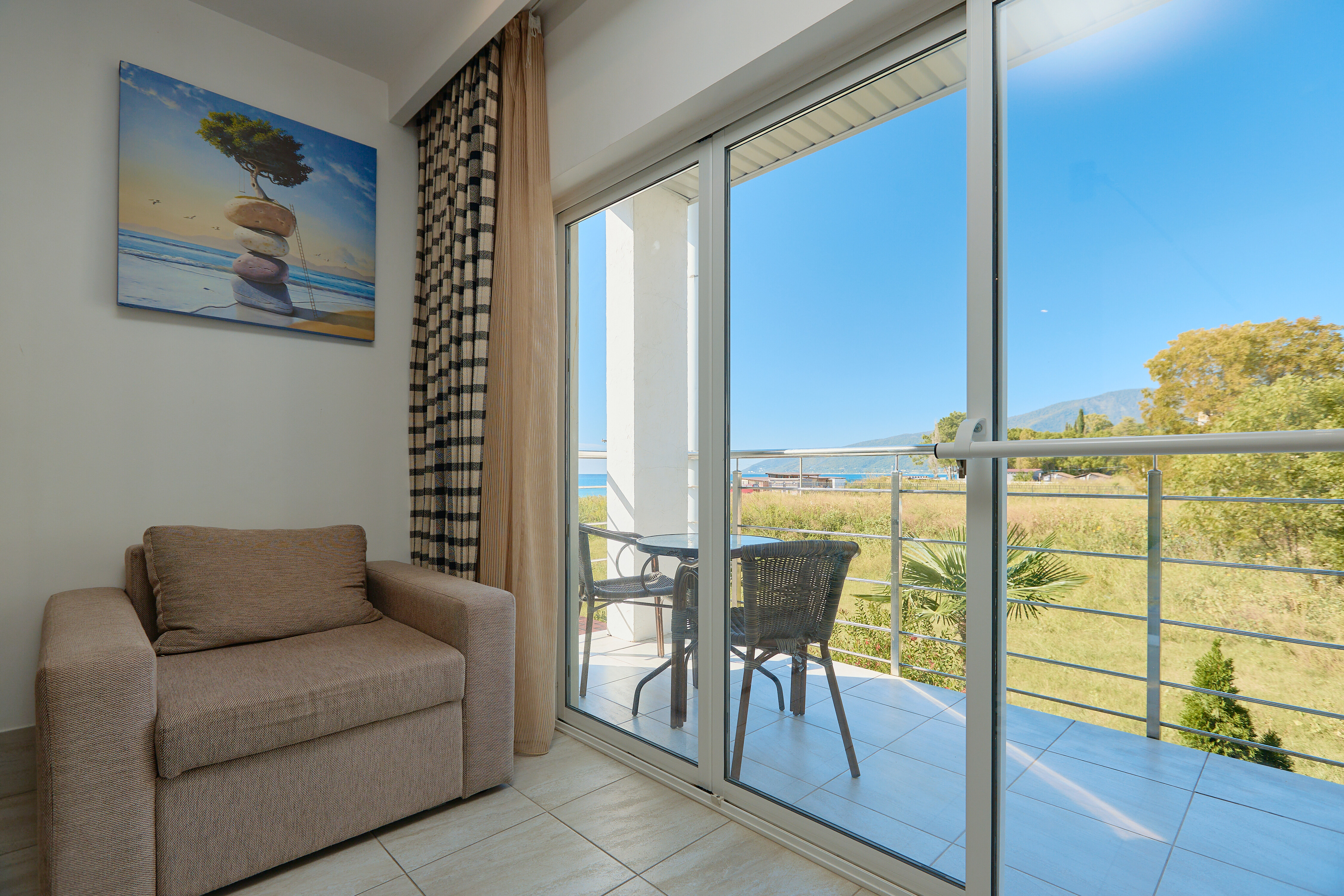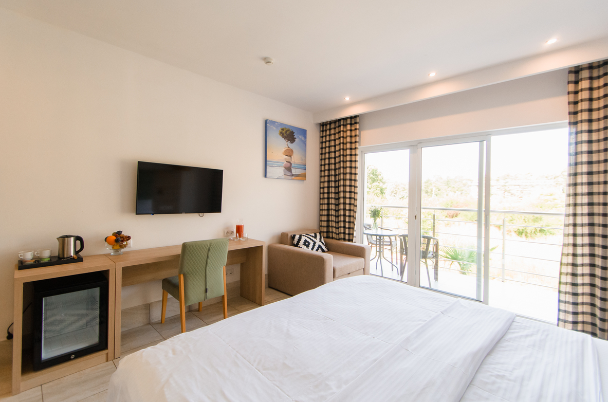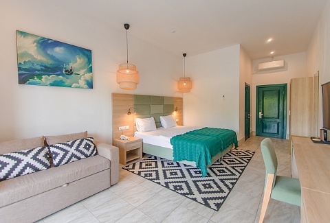 В номере: вешалка, диван, зеркало, кровати односпальные /одна двуспальная кровать, прикроватные тумбочки, стол, стул, шкаф, мини-холодильник, набор посуды, сплит-система, телевизор