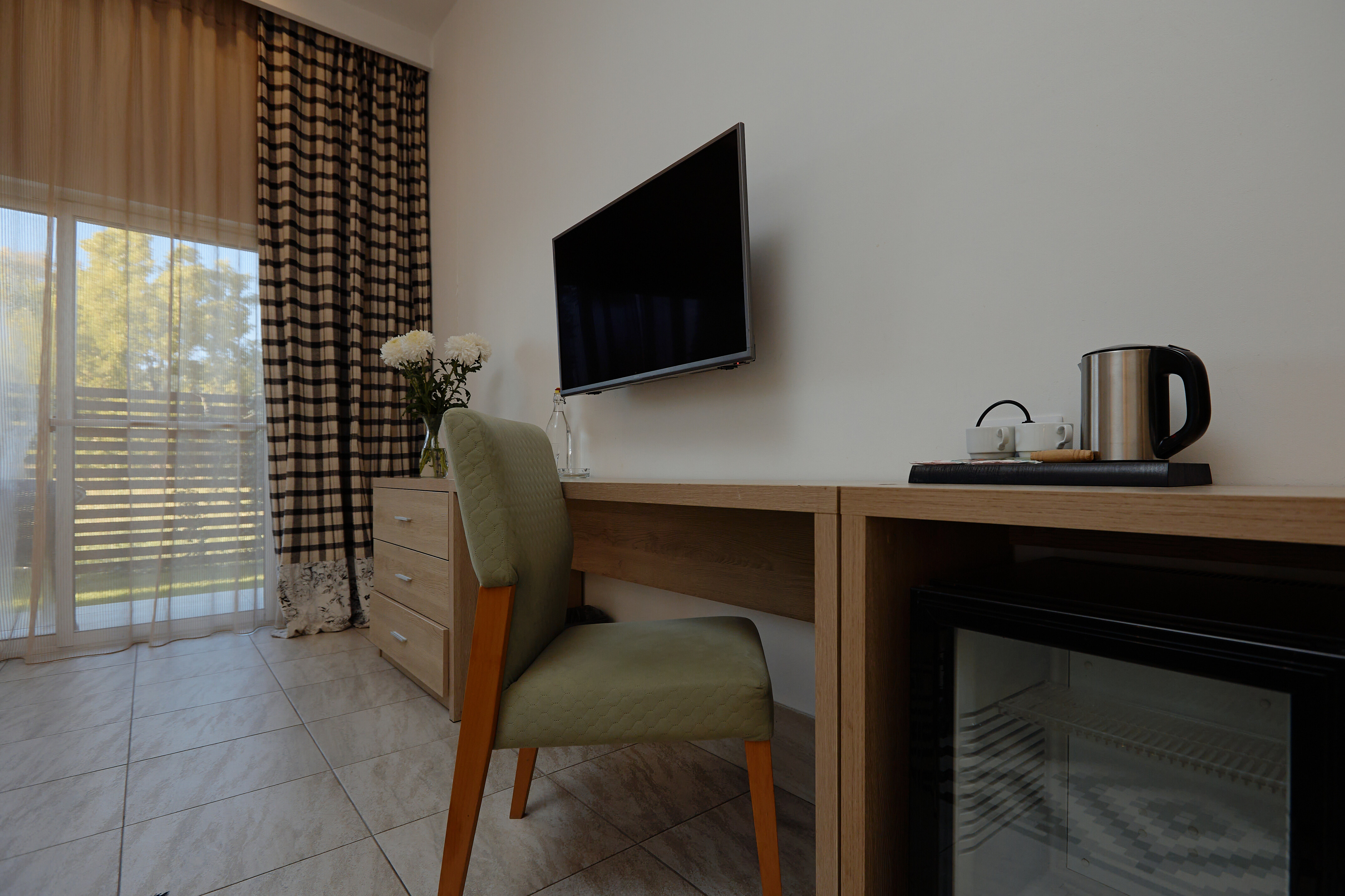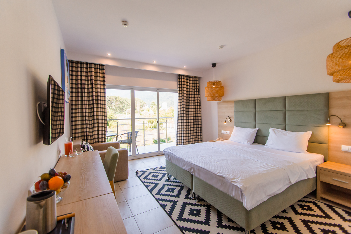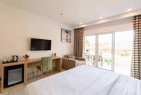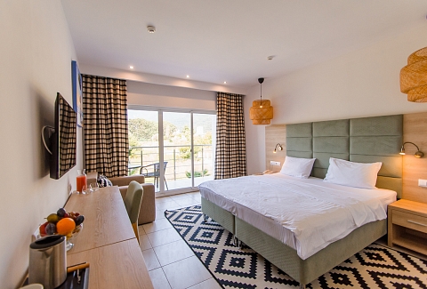 В номере: вешалка, зеркало, кровати односпальные /одна двуспальная кровать, прикроватные тумбочки, стол, стулья, шкаф, мини-холодильник, набор посуды, сплит-система, телевизор ЖК, электрочайник