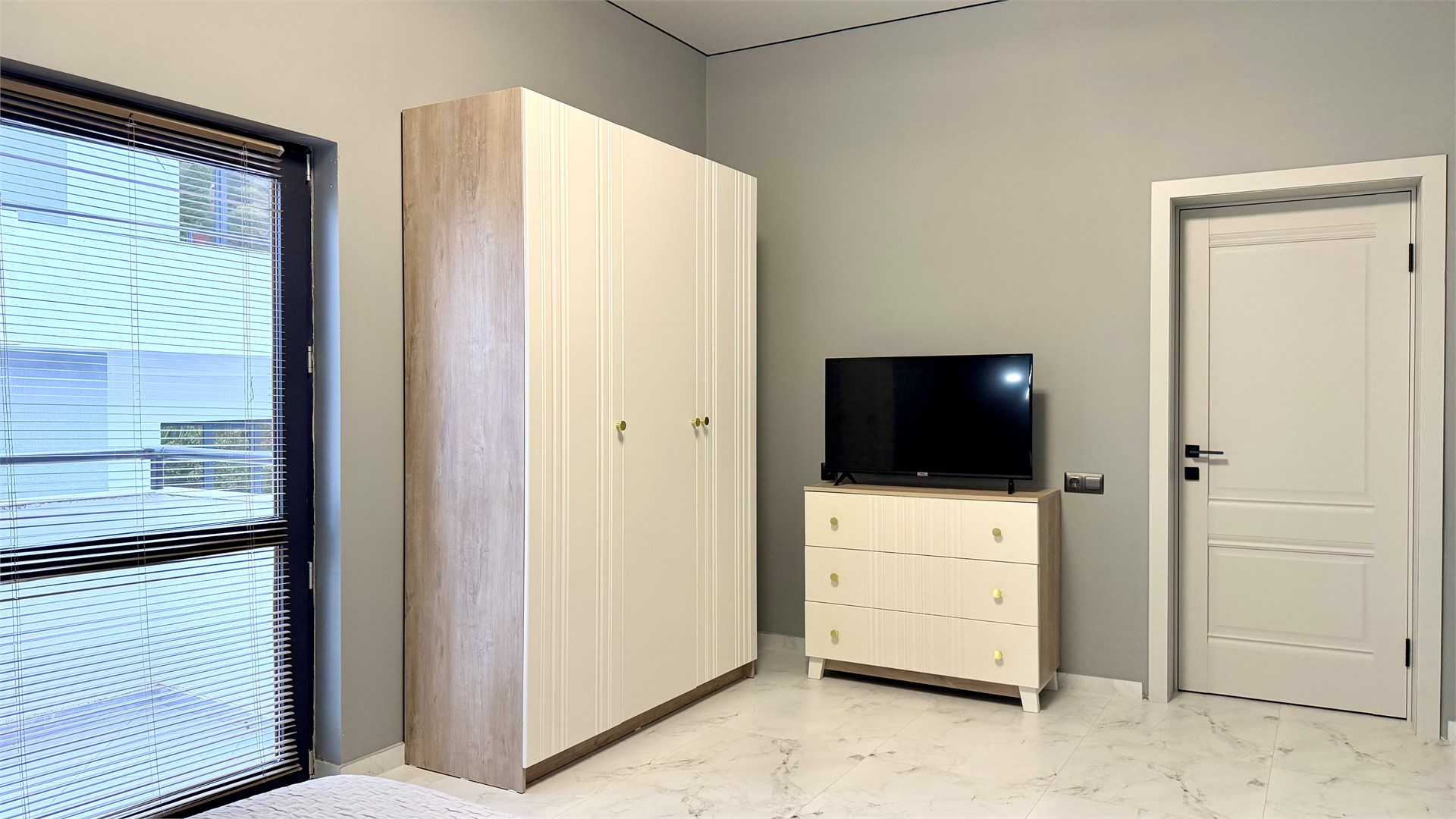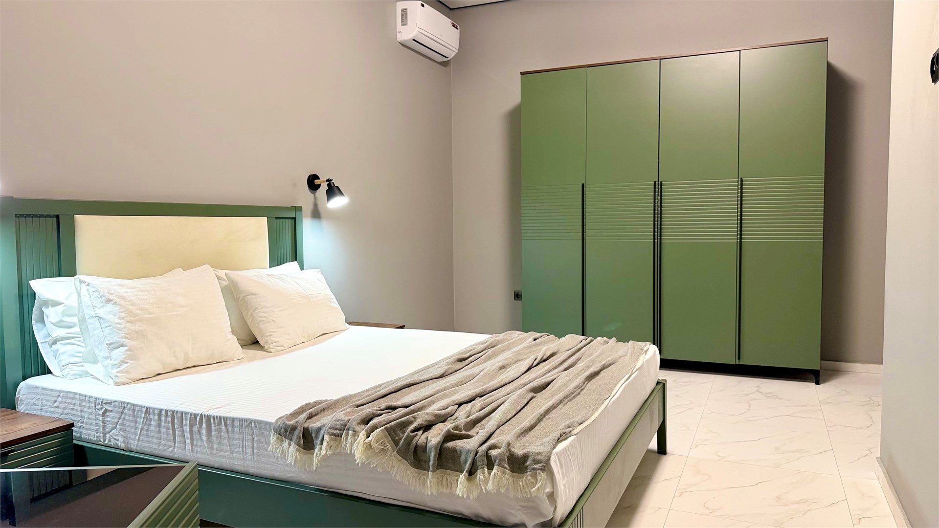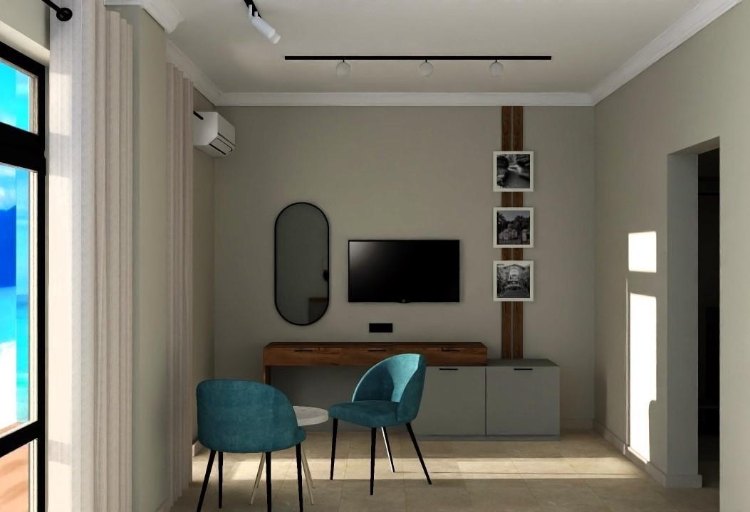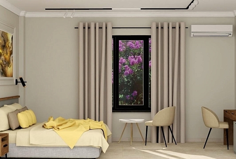 В номере: вешалка, диван, зеркало, кровать двуспальная, прикроватные тумбочки, стол, стулья, шкаф, кондиционер, микроволновая печь, набор посуды, плита электрическая, стиральная машина, телевизор, холодильник, чайный набор посуды, электрочайник
