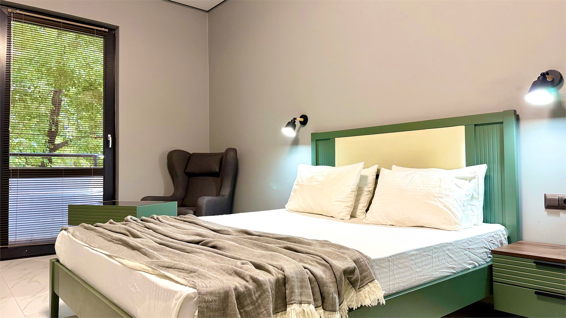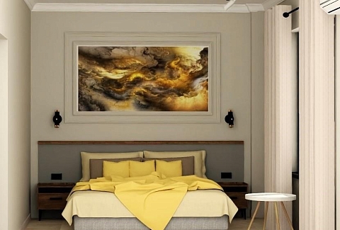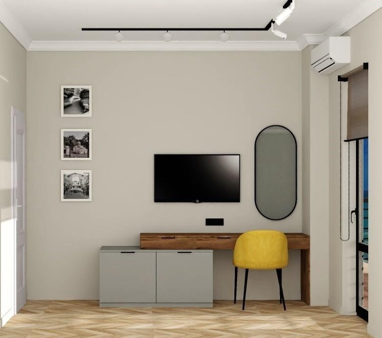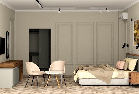 В номере: вешалка, диван, зеркало, кровать двуспальная, прикроватные тумбочки, стол, стул, шкаф, кондиционер, телевизор, холодильник