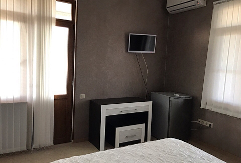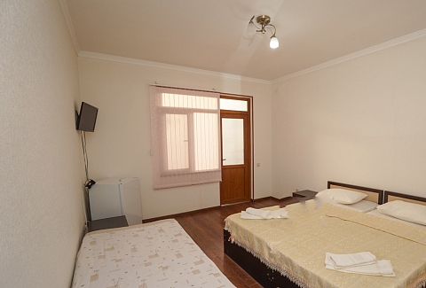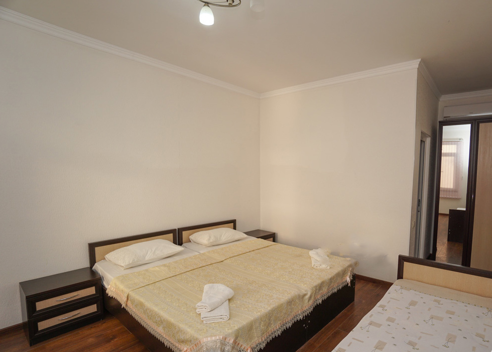 В номере: вешалка, зеркало, кровать двуспальная, кровать односпальная, прикроватные тумбочки, шкаф, кондиционер, телевизор, холодильник