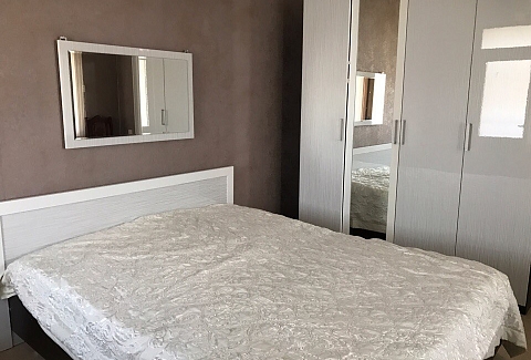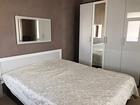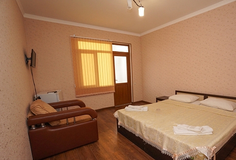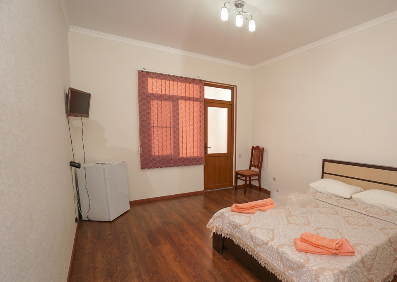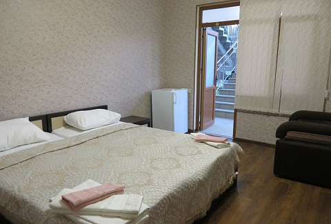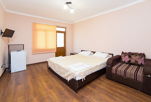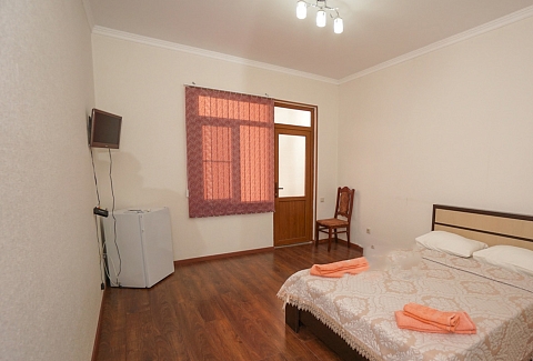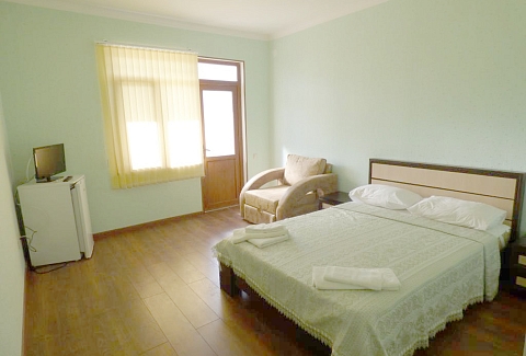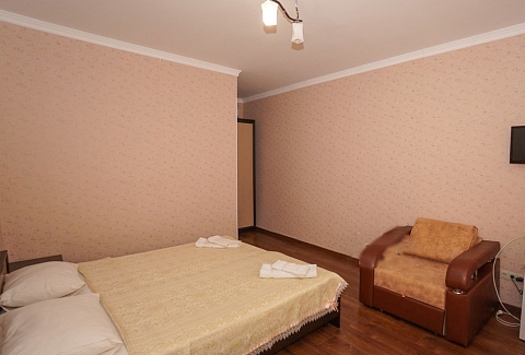 В номере: вешалка, зеркало, кресло-кровать, кровать двуспальная, прикроватные тумбочки, шкаф, кондиционер, телевизор, холодильник