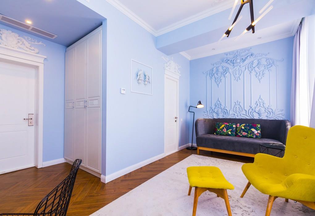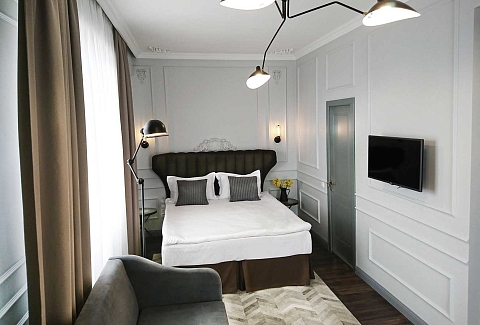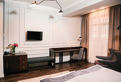 В номере: вешалка, диван, зеркало, кресло, кровать двуспальная, прикроватная тумбочка, столик кофейный, столик туалетный, стул, шкаф, кондиционер, мини-холодильник, пляжные полотенца, сейф, телевизор, чайная станция