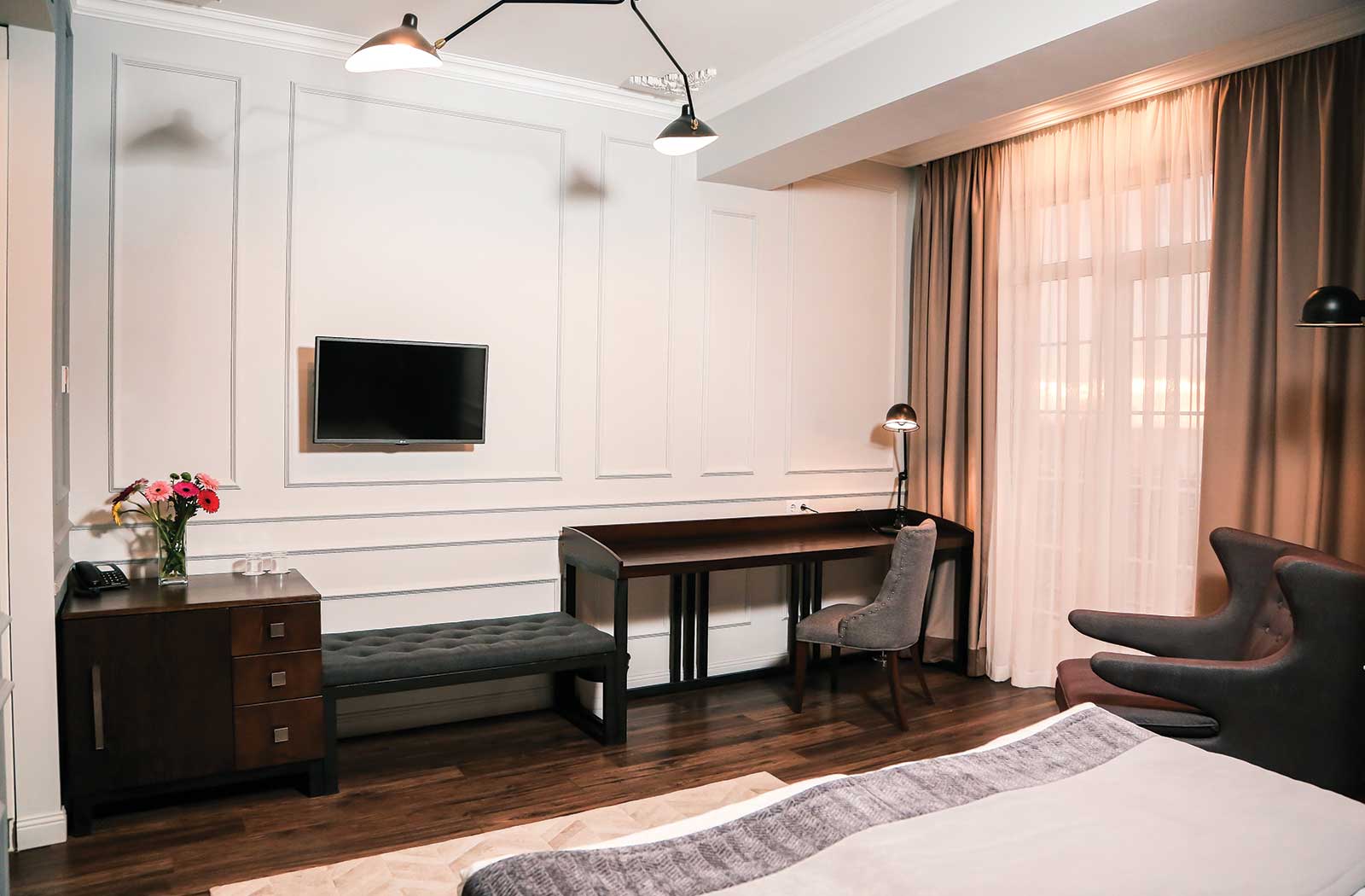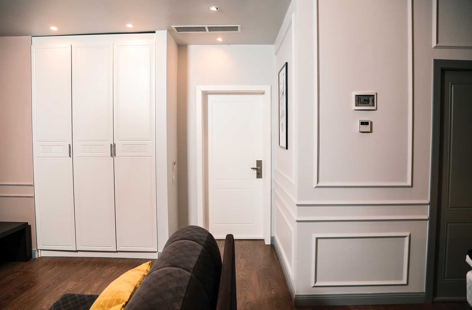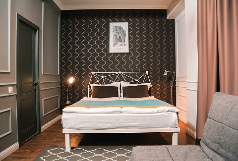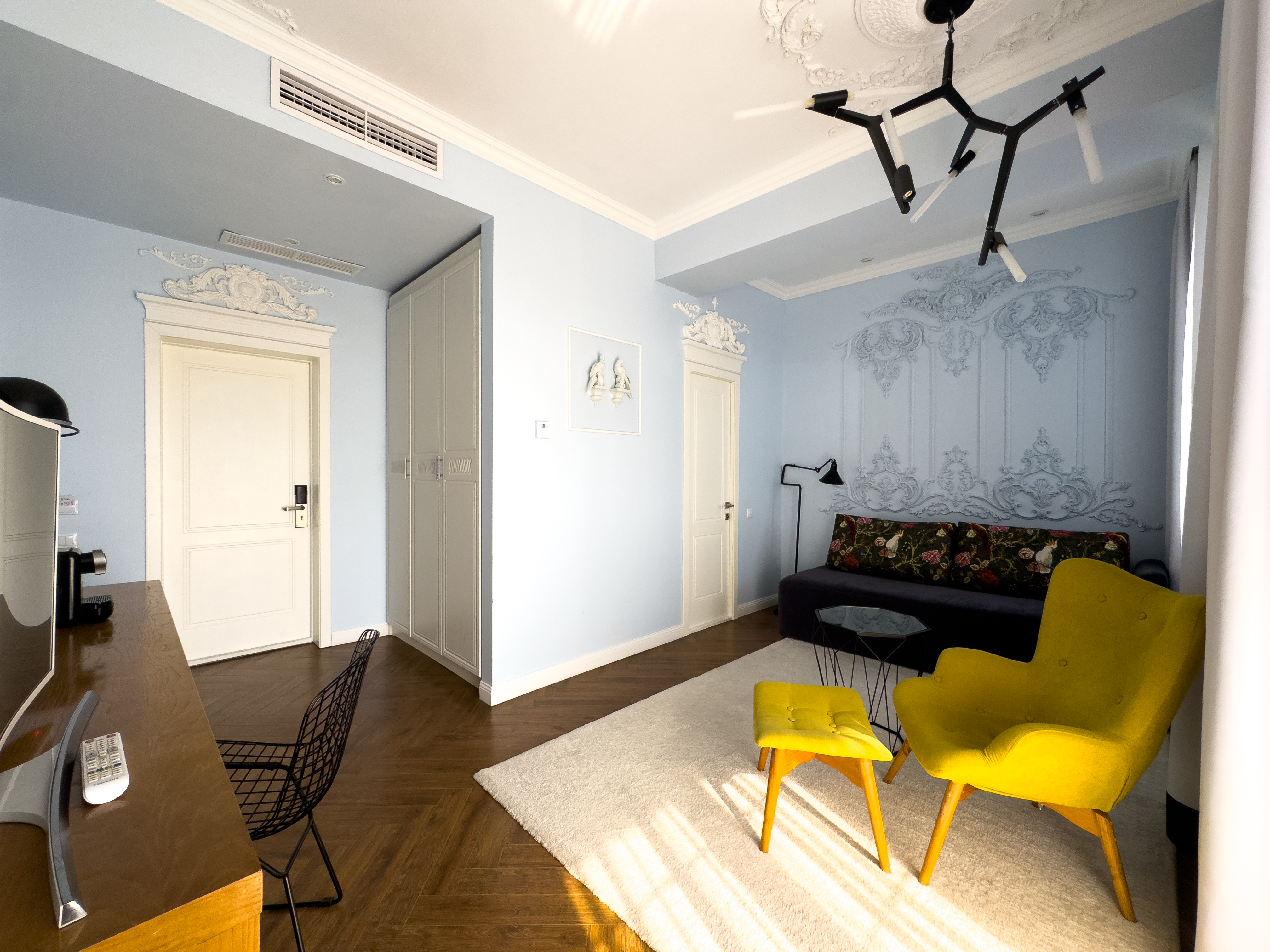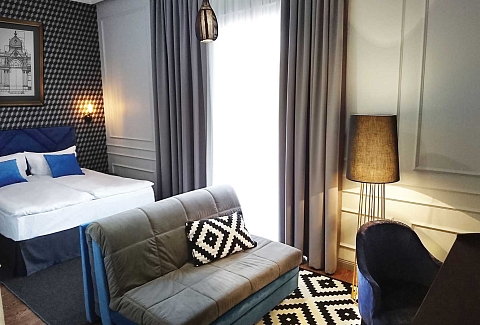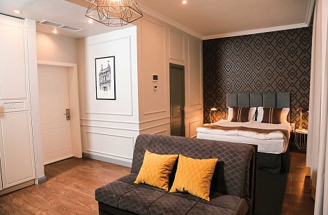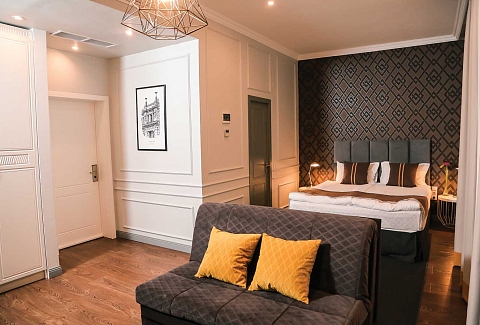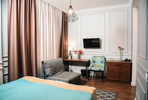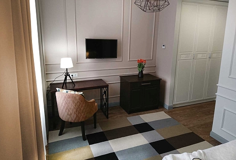 В номере: вешалка, диван раскладной, зеркало, кровать двуспальная, прикроватные тумбочки, стол, стул, шкаф, кондиционер, мини-холодильник, пляжные полотенца, сейф, телевизор, чайная станция