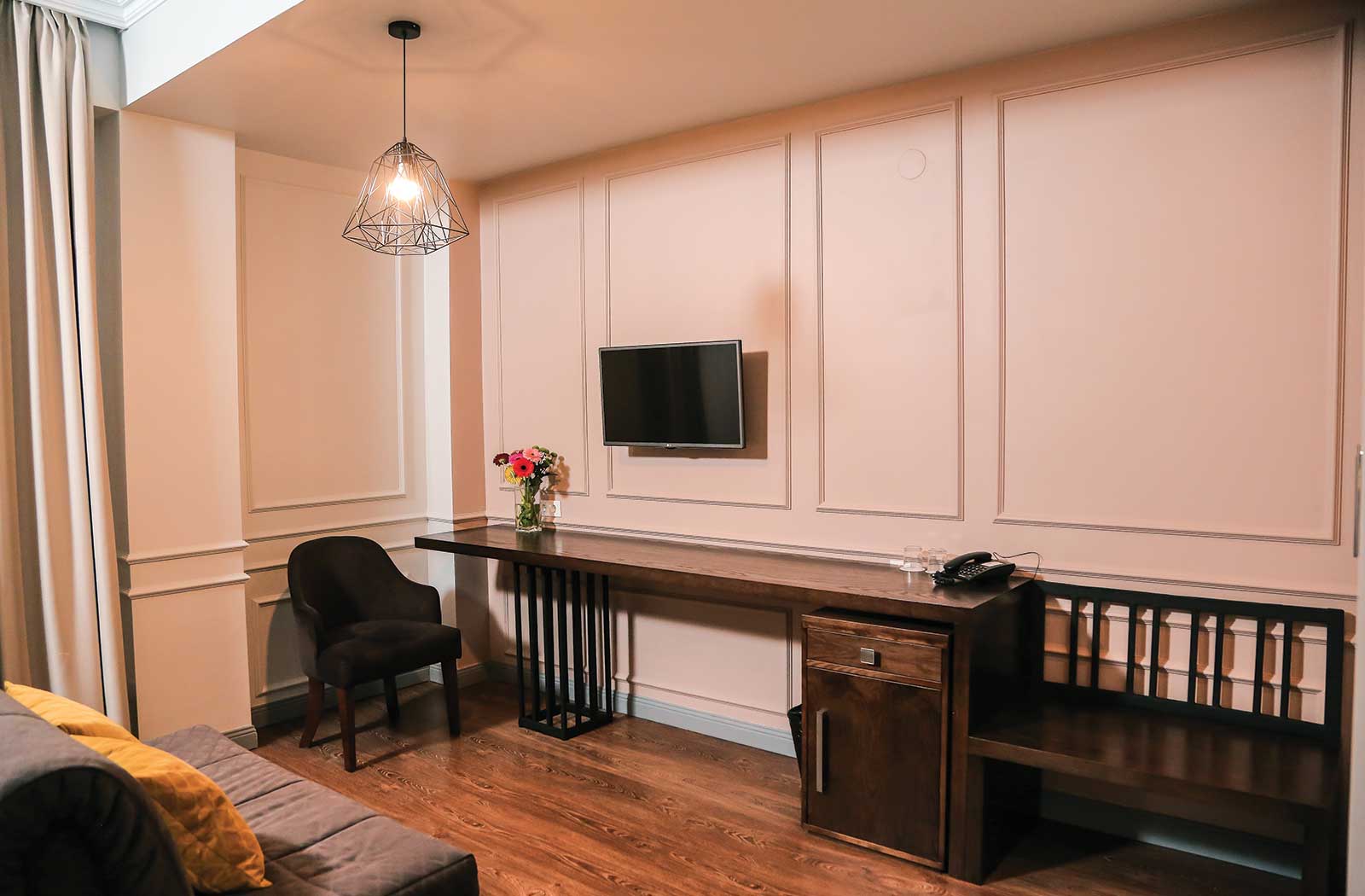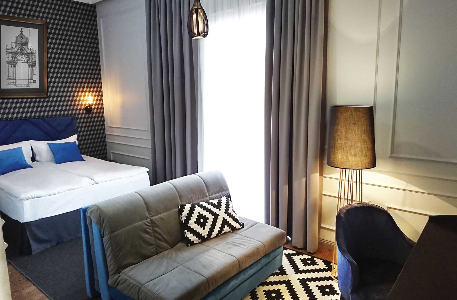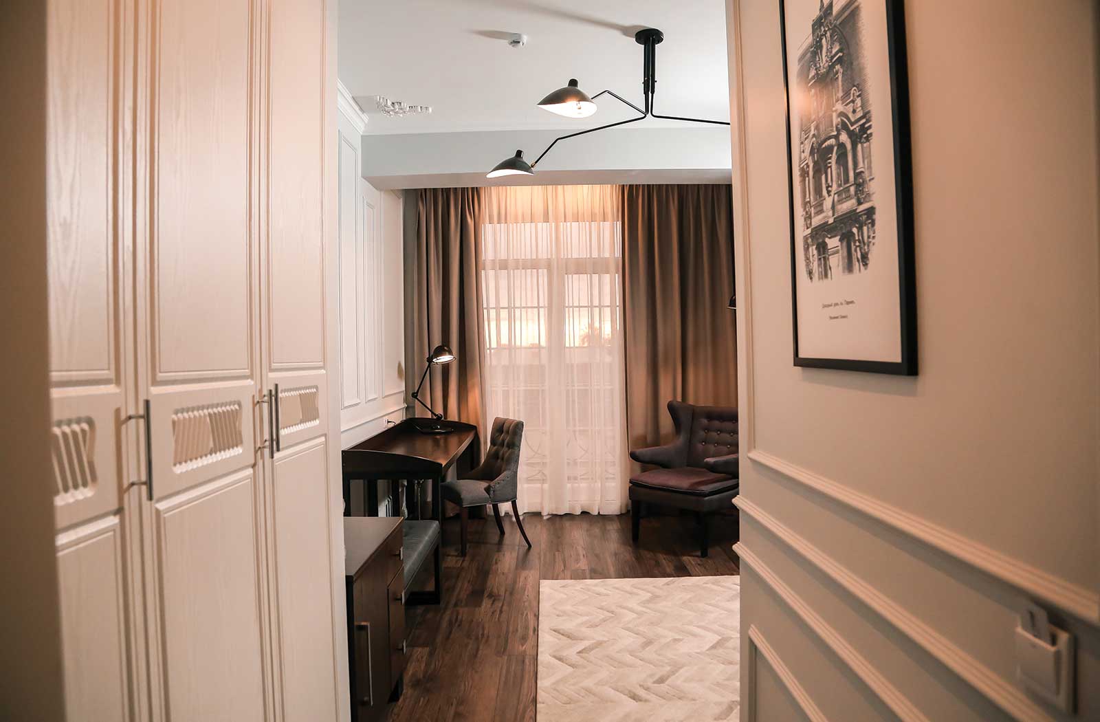В номере: вешалка, диван раскладной, зеркало, кровать двуспальная, прикроватные тумбочки, стол, стул, шкаф, кондиционер, мини-холодильник, пляжные полотенца, сейф, телевизор, чайная станция