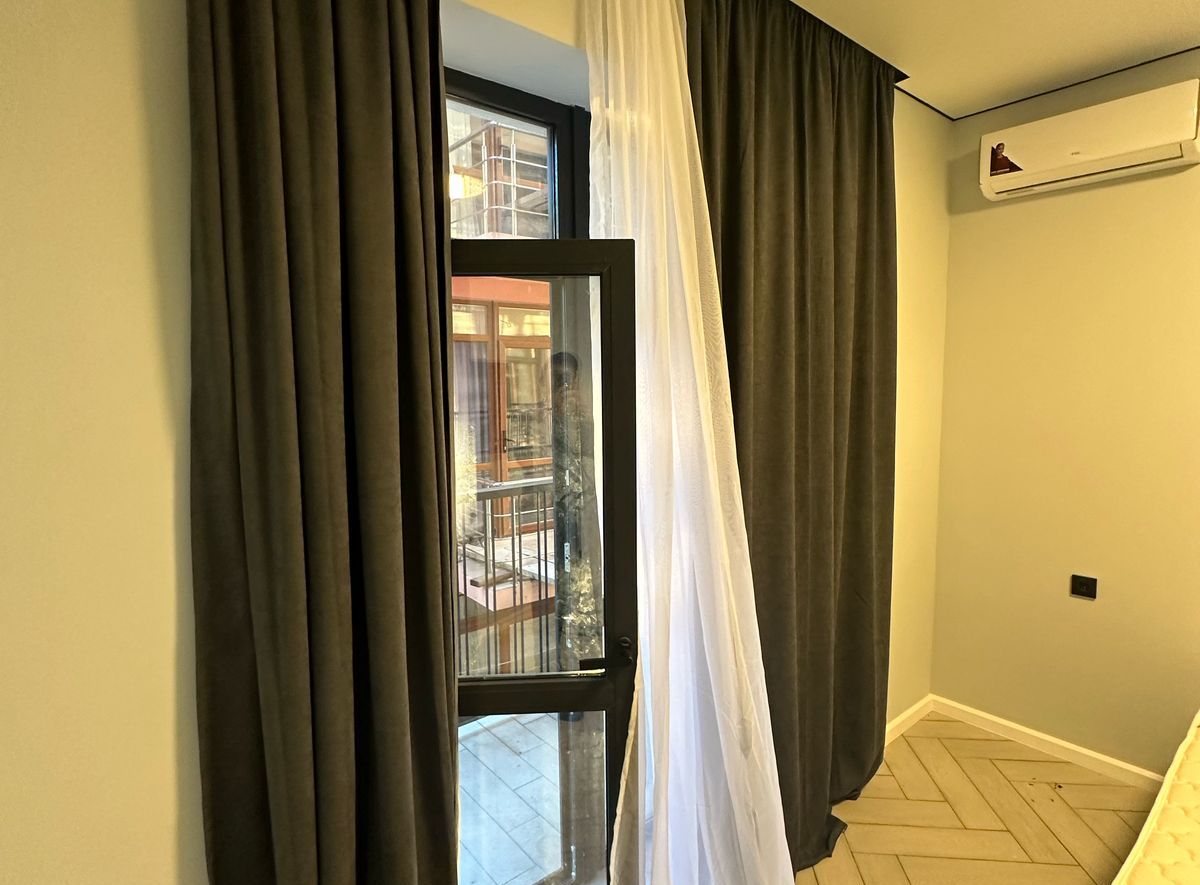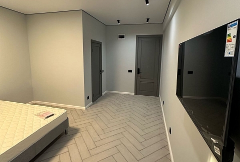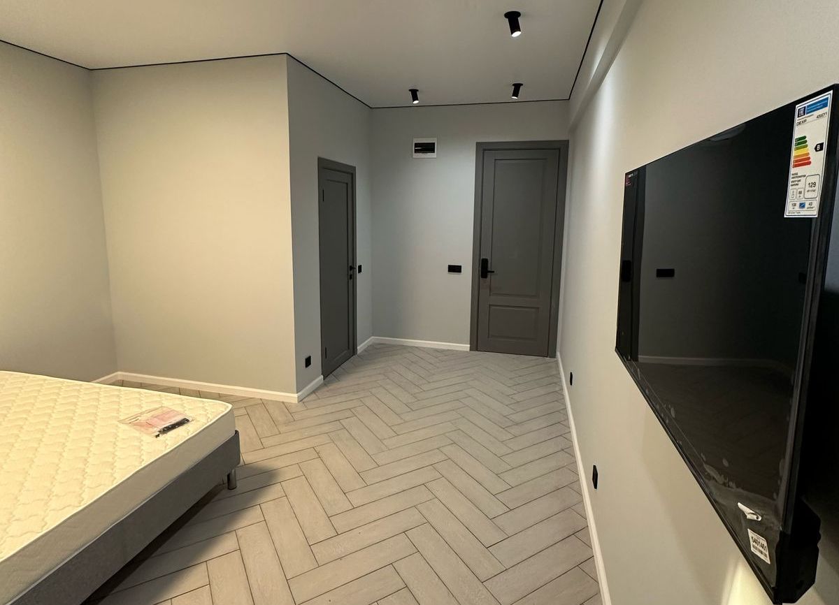 В номере: вешалка, зеркало, кровать двуспальная, прикроватные тумбочки, стол, стул, шкаф, кондиционер, телевизор, теплый пол, электрочайник