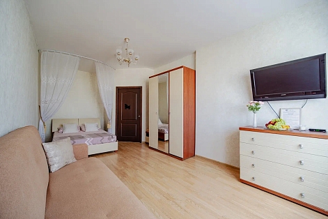 В номере: вешалка, зеркало, кровать двуспальная, кровать односпальная, прикроватные тумбочки, стол, стулья, шкаф, кондиционер, телевизор, теплый пол, электрочайник