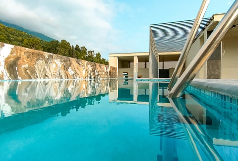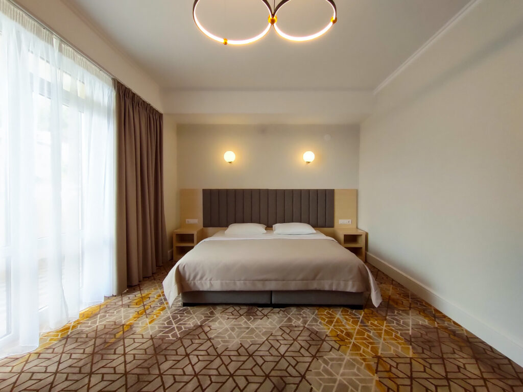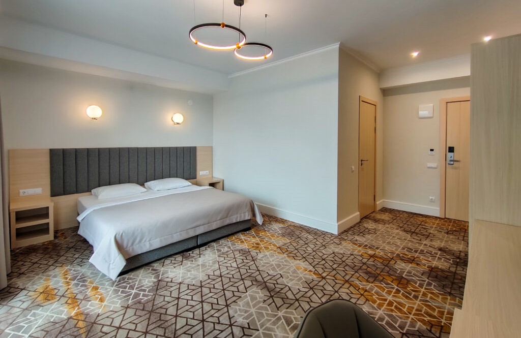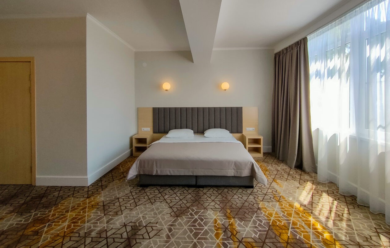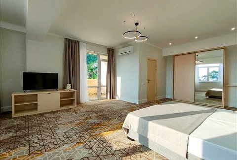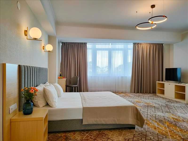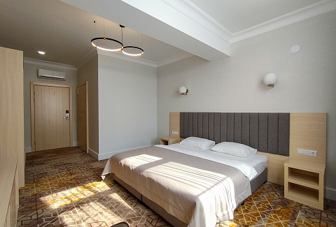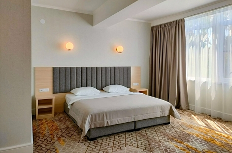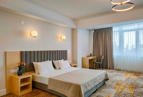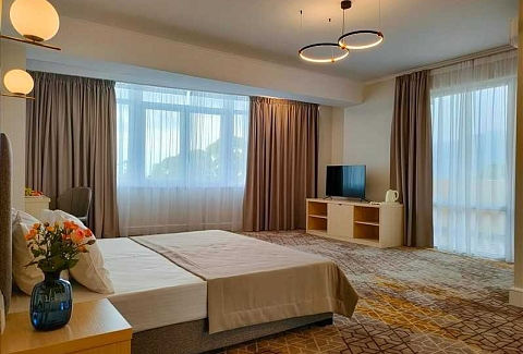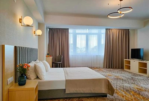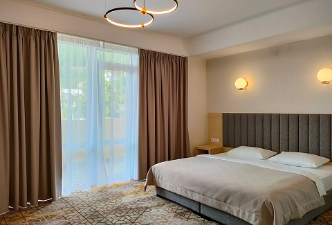 Гостей ожидают комфортабельные номера категории Стандарт, Семейный, Люкс. В номерах есть все необходимое для хорошего отдыха — установлена сплит-система, доступен беспроводной интернет, комнаты оснащены современной бытовой техникой, в индивидуальных санузлах для гостей подготовлены наборы косметических принадлежностей, а в ряде номеров предусмотрены меблированные балконы.На первом этаже работают бар с кальяном и ресторан, где отдыхающие могут заказать завтраки, обеды, ужины, продегустировать холодные и горячие напитки или просто перекусить в течение дня. К услугам гостей открытый бассейн и сауна, расположенные на крыше здания. Оттуда открываются живописные виды на горы, лес и море.В паре минут ходьбы находится городской песчано-галечный пляж. Пляж оборудован — установлены раздевалки, лежаки, навесы, работает прокат пляжных принадлежностей.