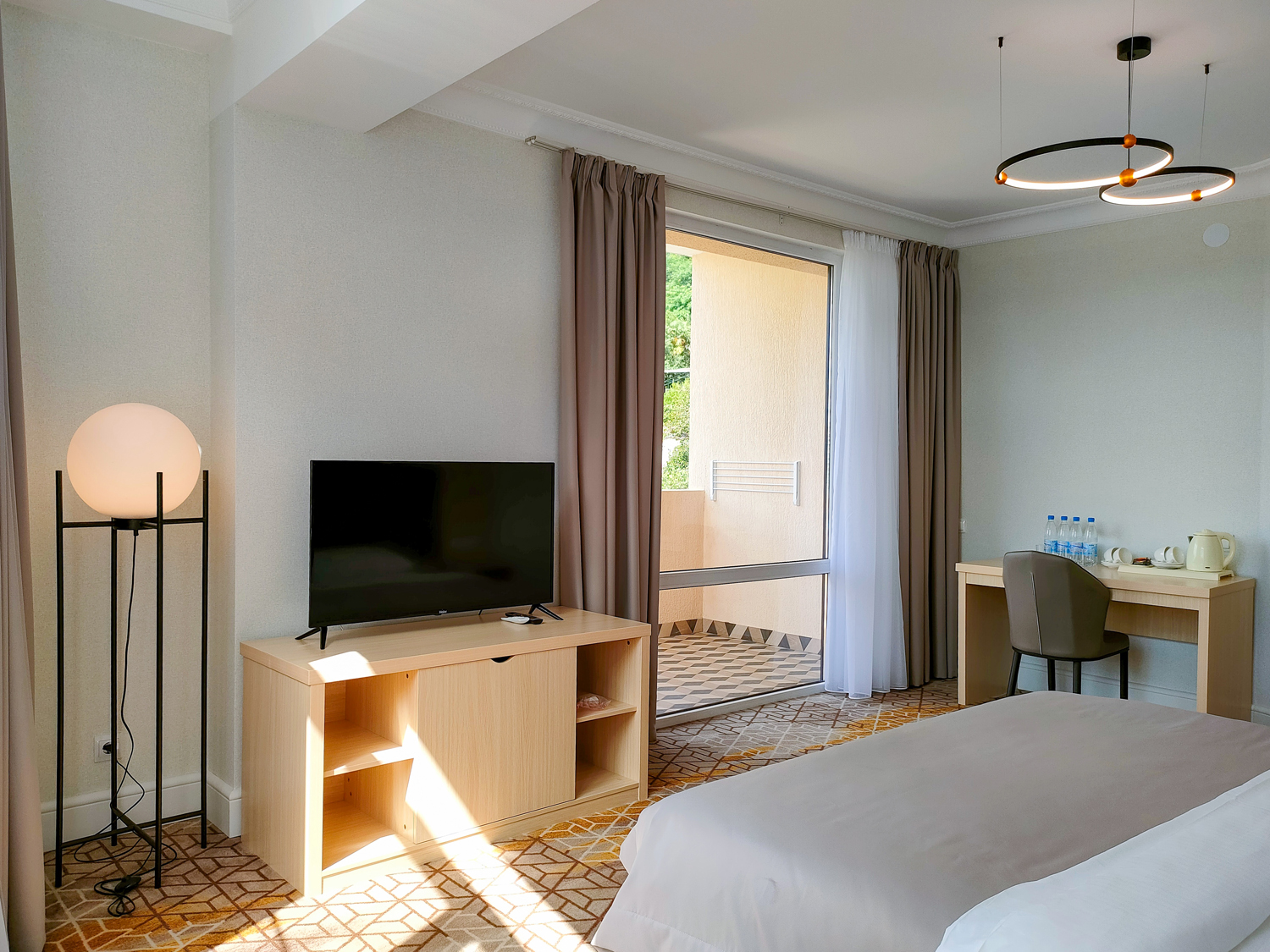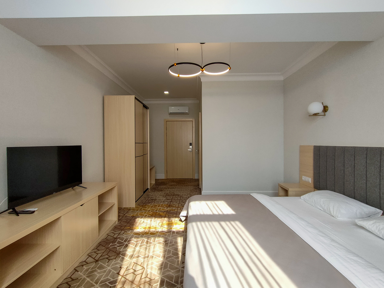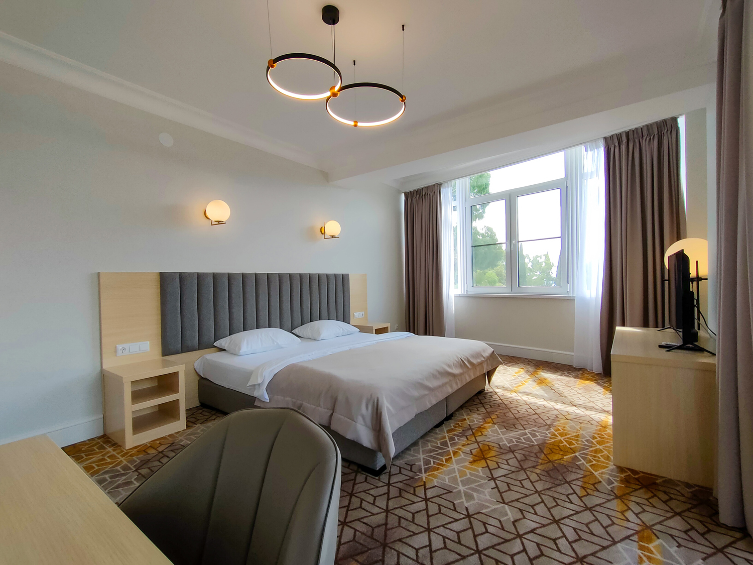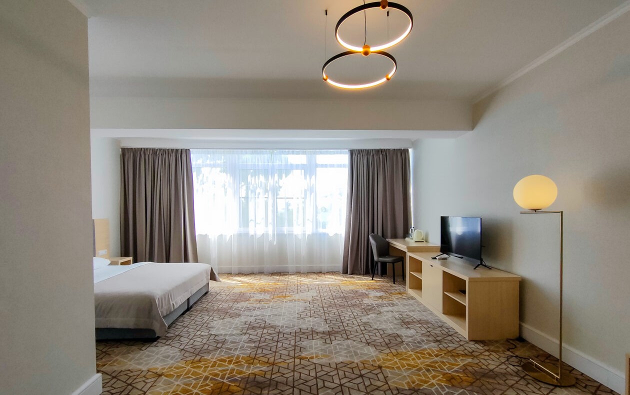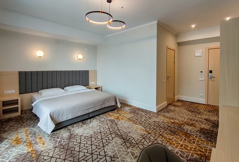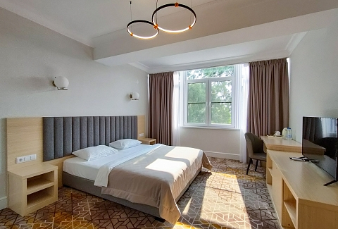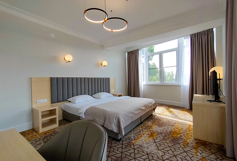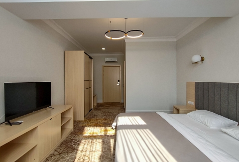 В номере: вешалка, зеркало, кровать двуспальная, прикроватные тумбочки, стол, стулья, тумба под телевизор, шкаф, мини-холодильник, пляжные полотенца, сейф, сплит-система, телевизор ЖК, телефон, чайная станция