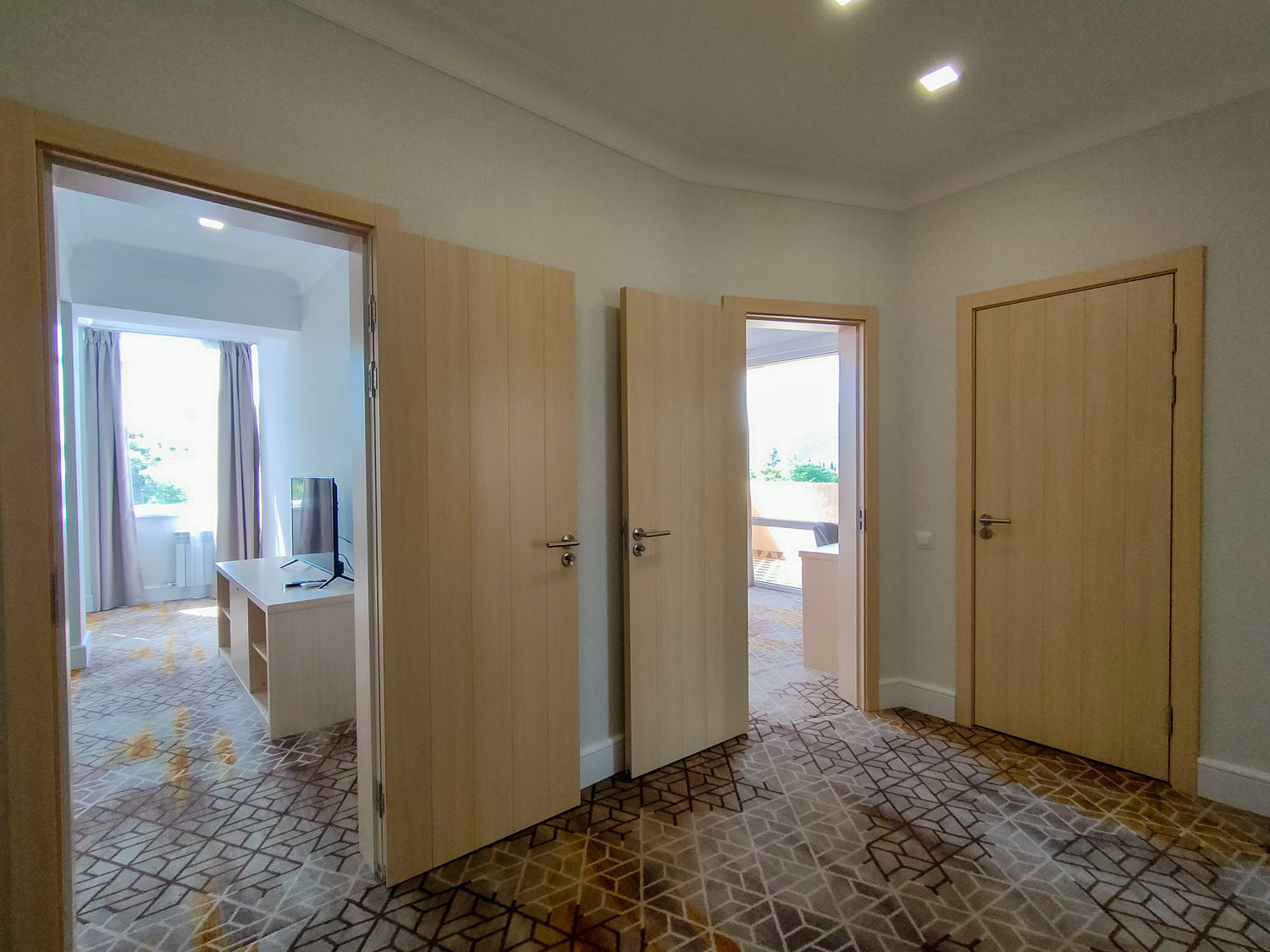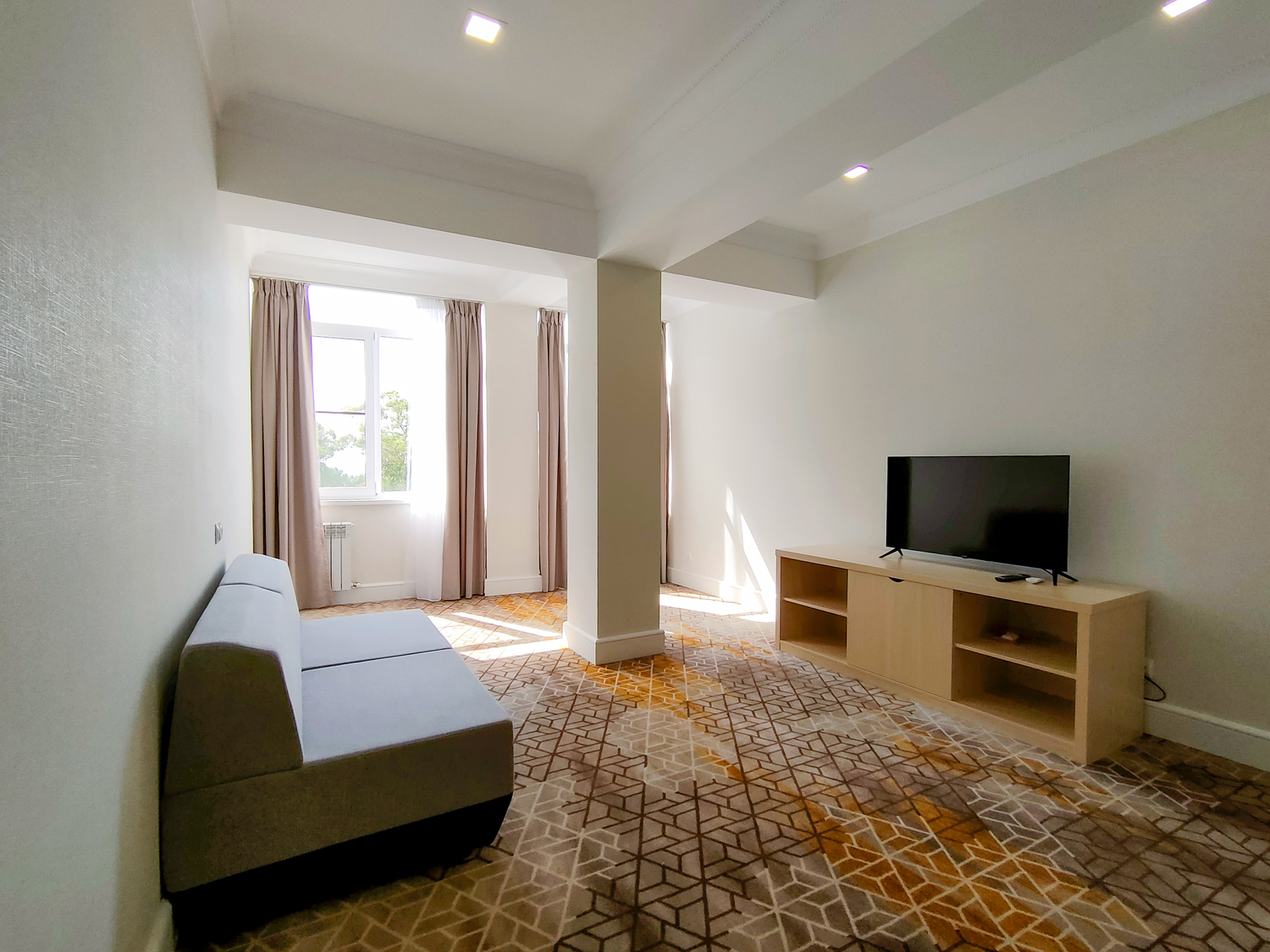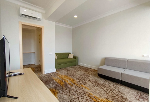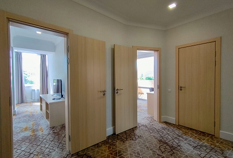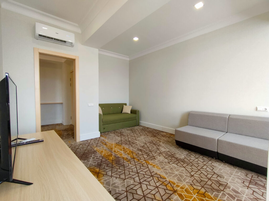 В номере: вешалка, диван, диван раскладной, зеркало, кровать двуспальная, прикроватные тумбочки, стол, стулья, тумба под телевизор, шкаф, мини-холодильник, пляжные полотенца, сейф, сплит-система, телевизор ЖК, телефон, чайная станция
