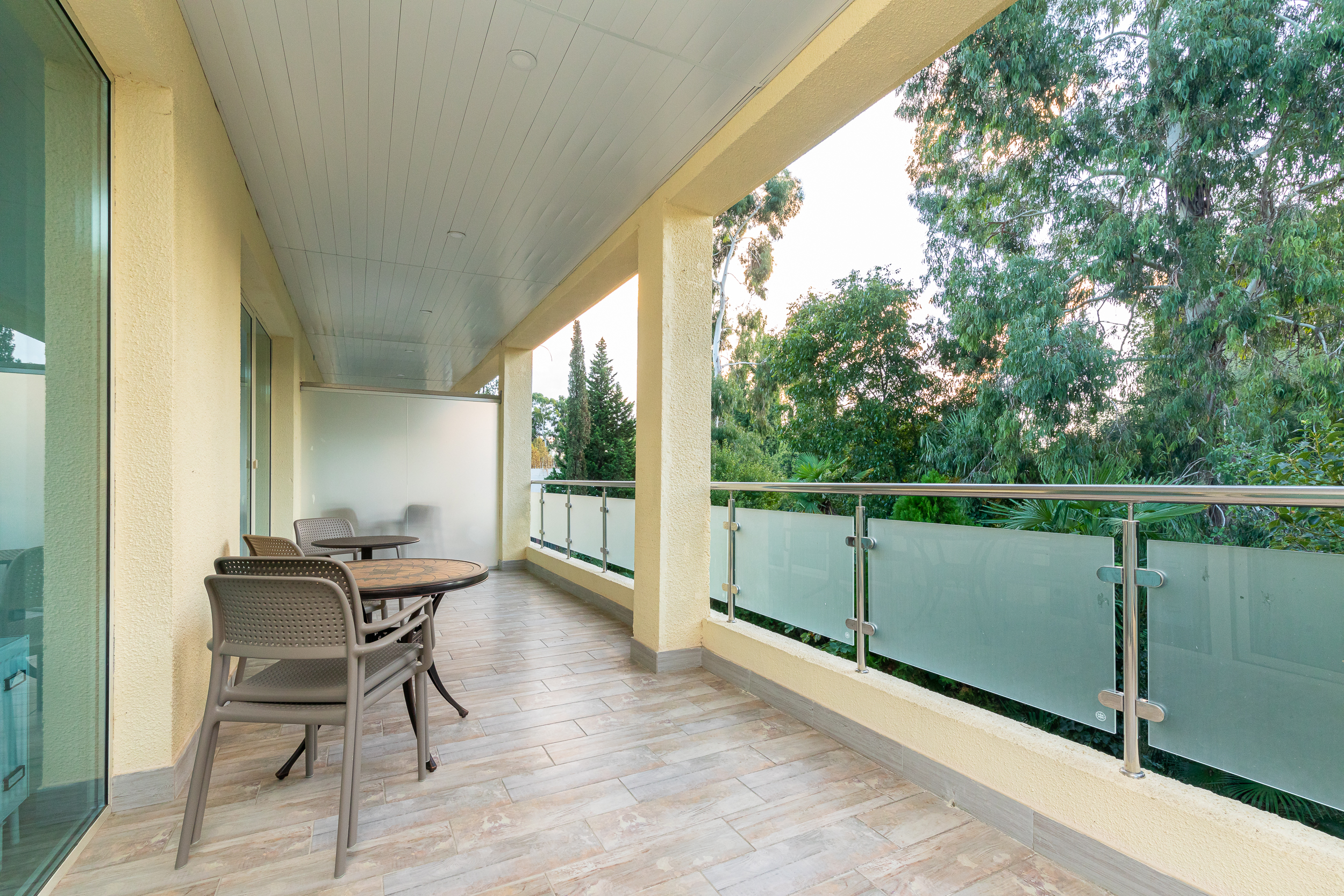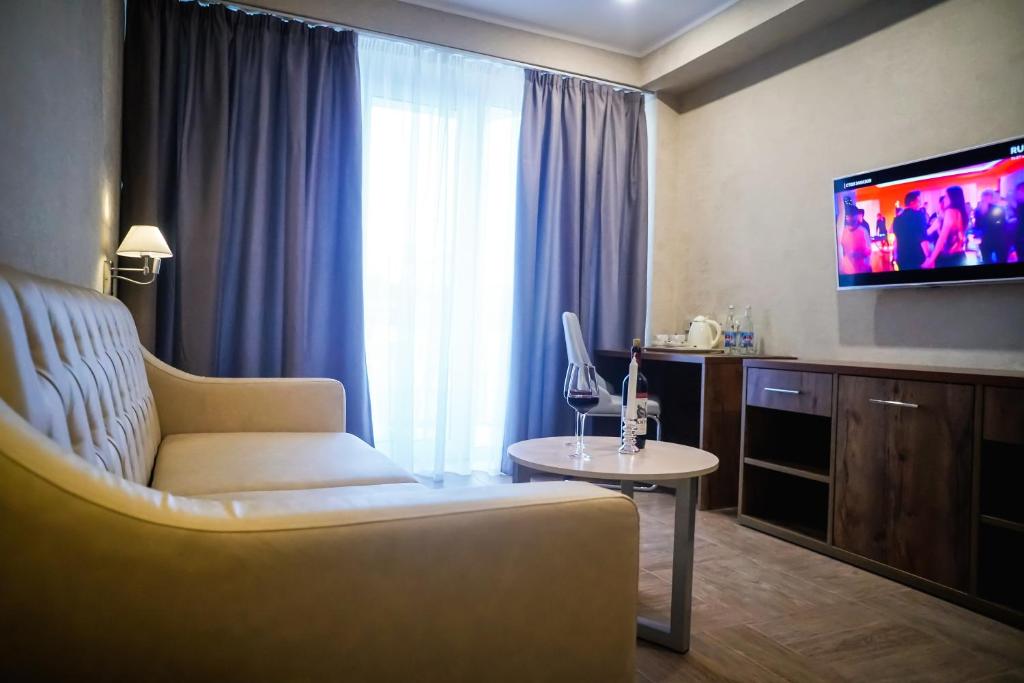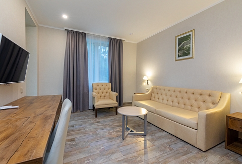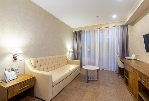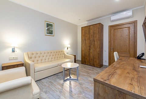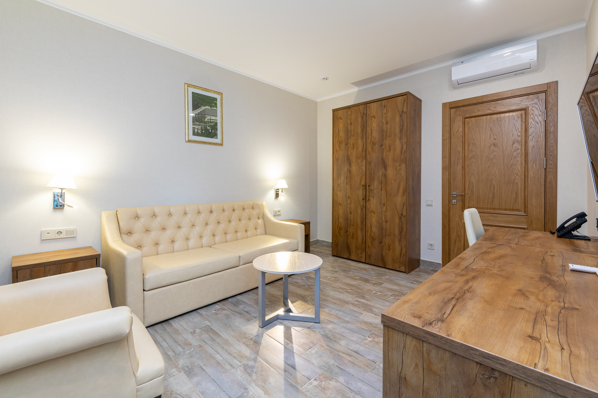 В номере: вешалка, диван раскладной, зеркало, кресло, кровать двуспальная, прикроватные тумбочки, стол, столик журнальный, стулья, шкаф, сейф, сплит-система, телевизор, телефон, холодильник, чайная станция