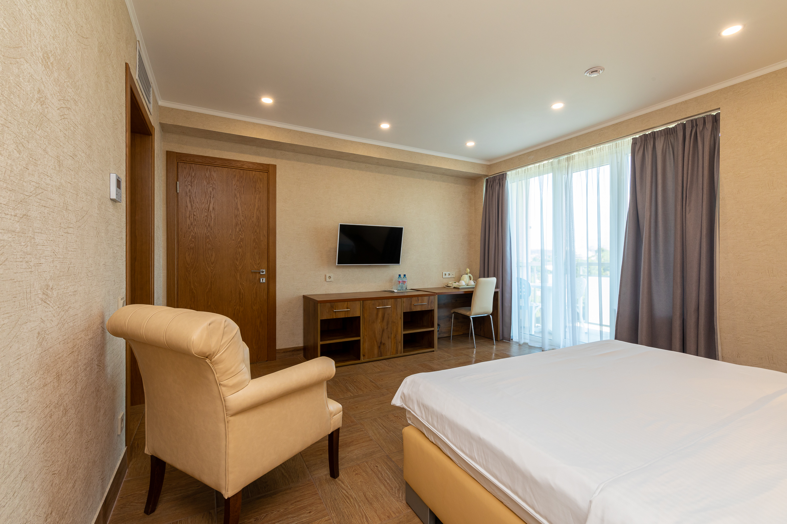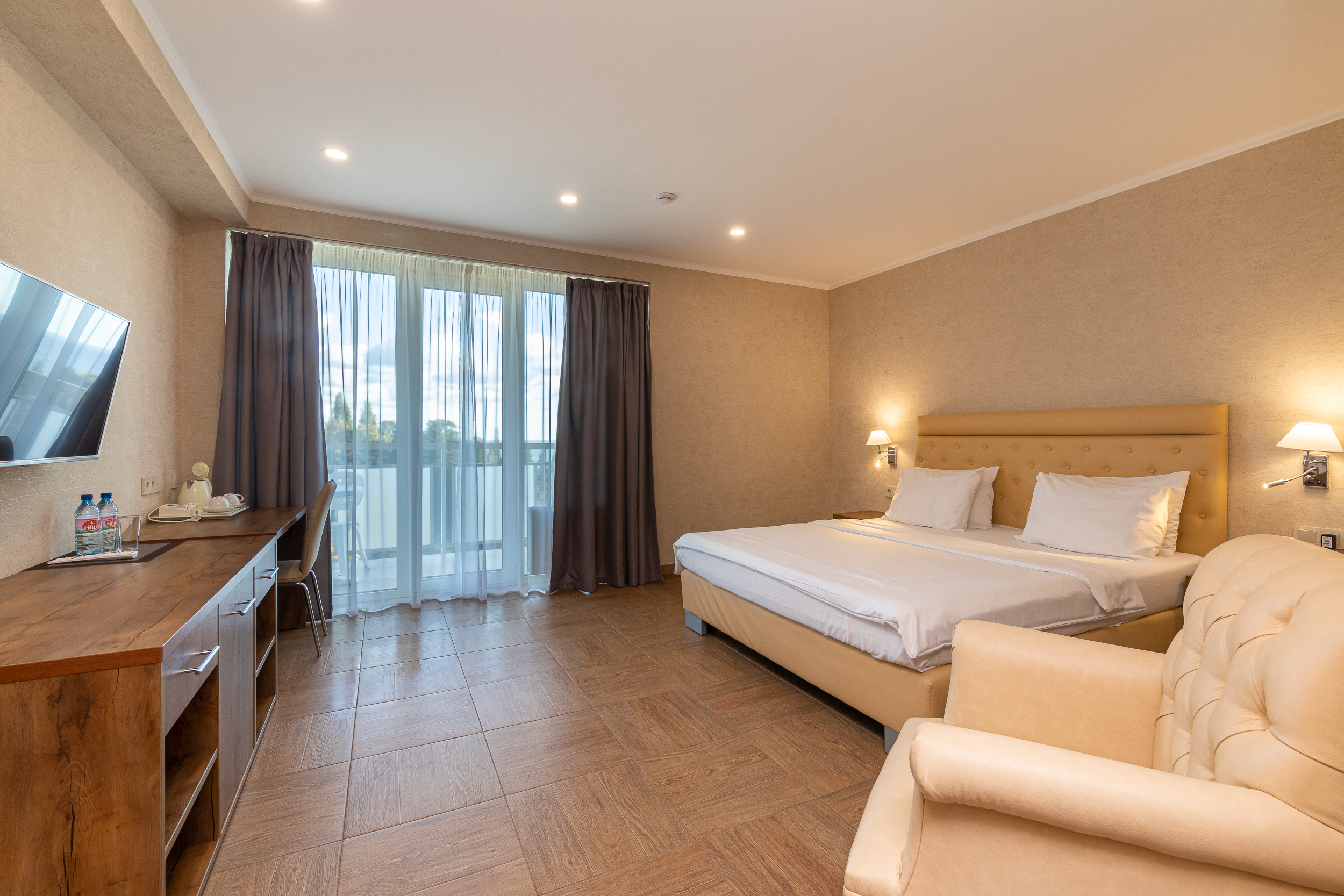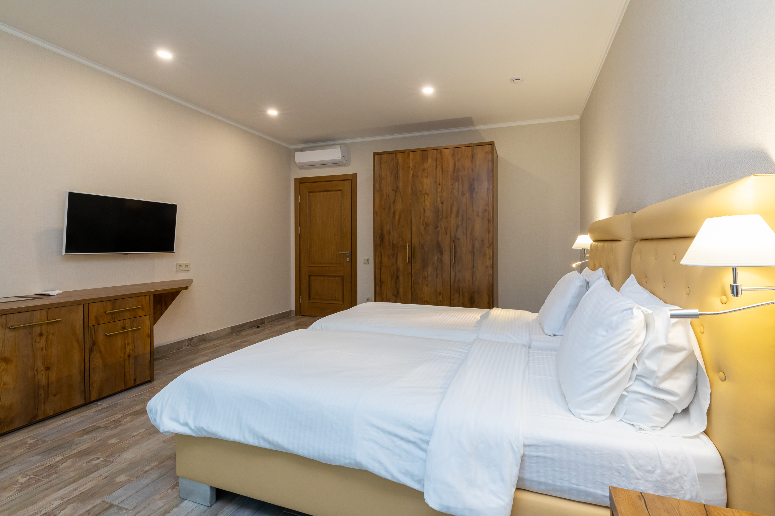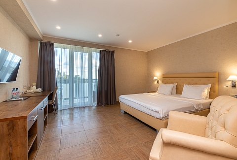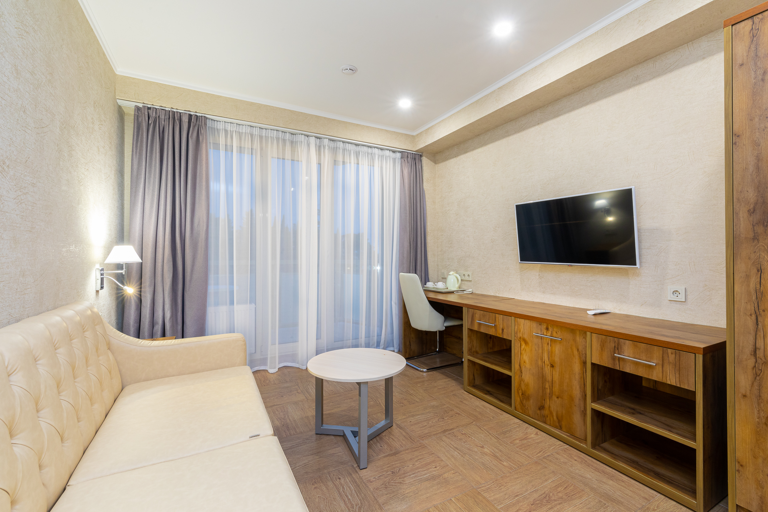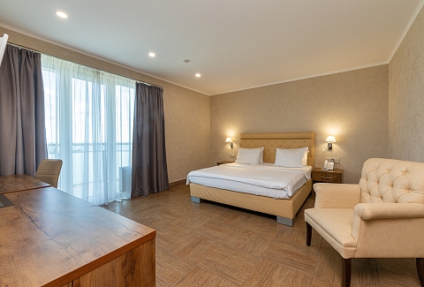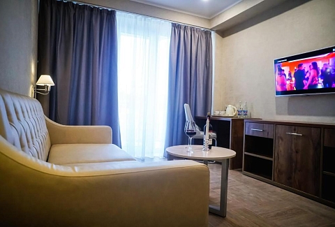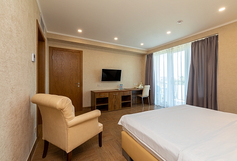 В номере: вешалка, диван раскладной, зеркало, кресло, кровать двуспальная, прикроватные тумбочки, стол, столик журнальный, стул, шкаф, сейф, сплит-система, телевизор, телефон, холодильник, чайная станция