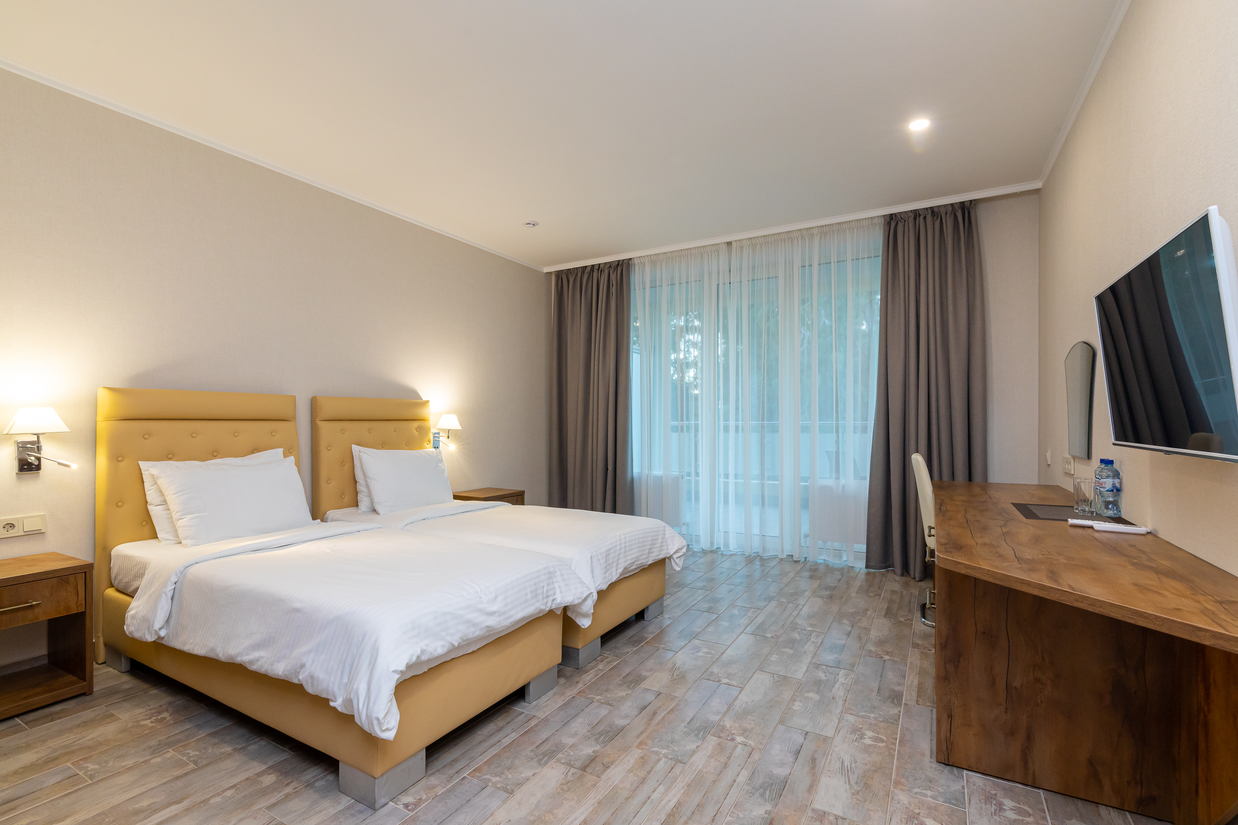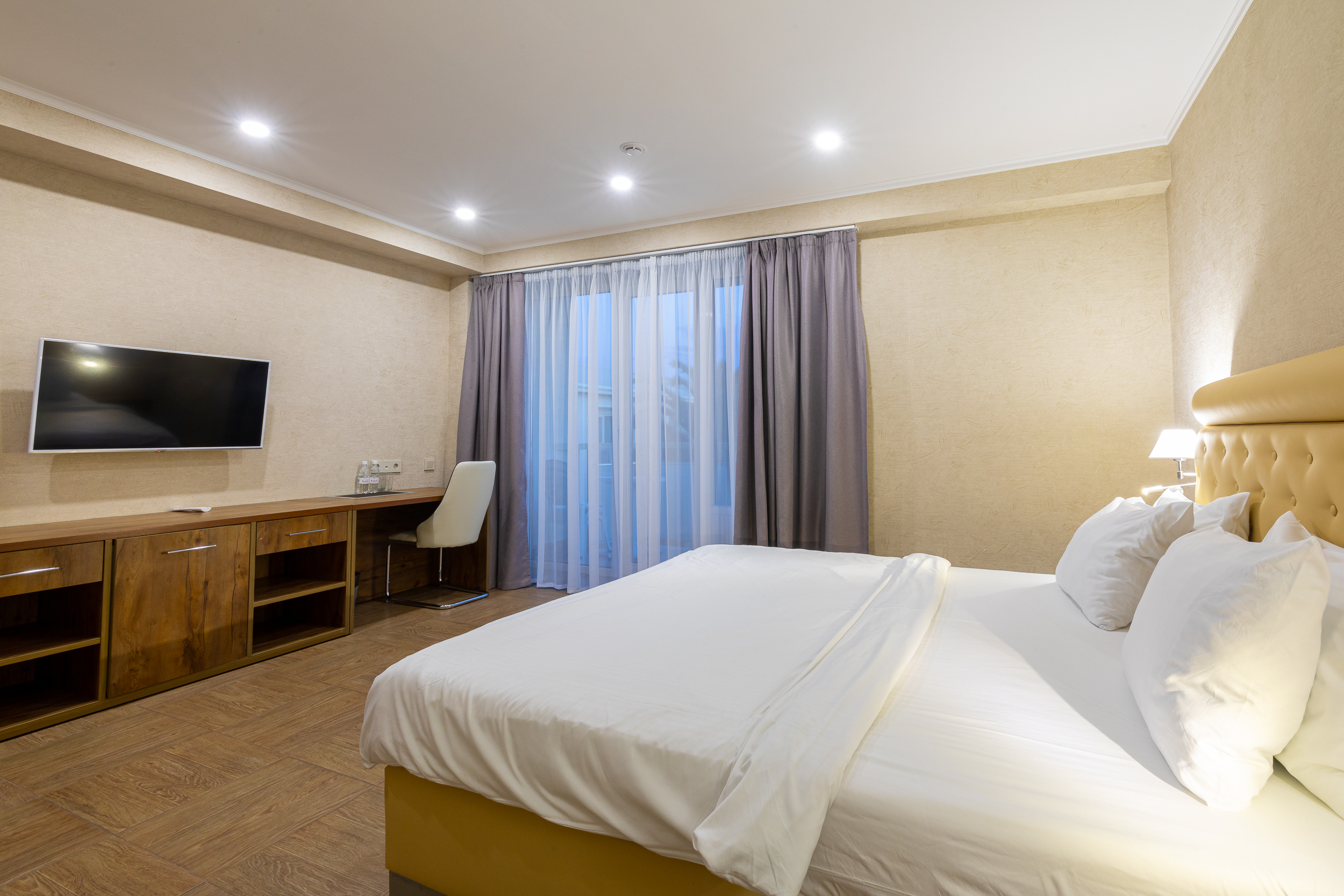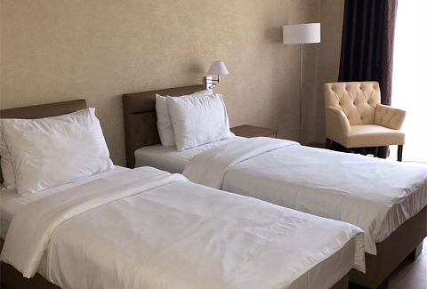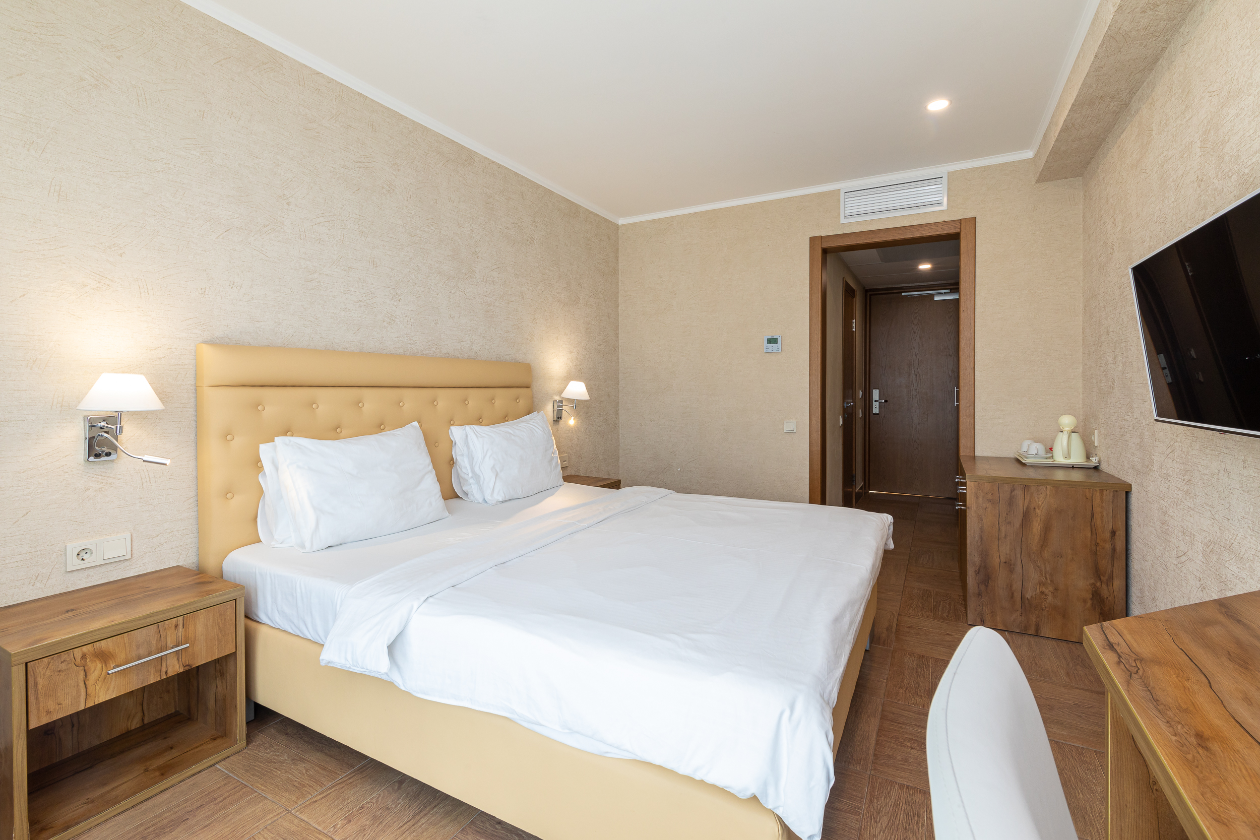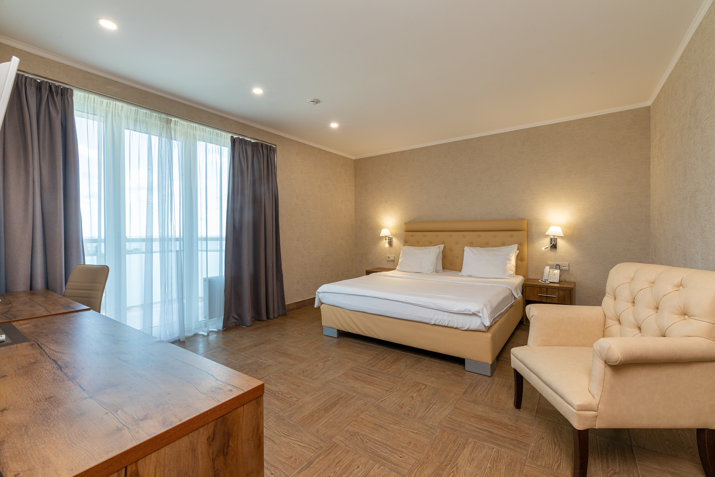 В номере: вешалка, диван раскладной, зеркало, кресло, кровать двуспальная, прикроватные тумбочки, стол, столик журнальный, стул, шкаф, сейф, сплит-система, телевизор, телефон, холодильник, чайная станция