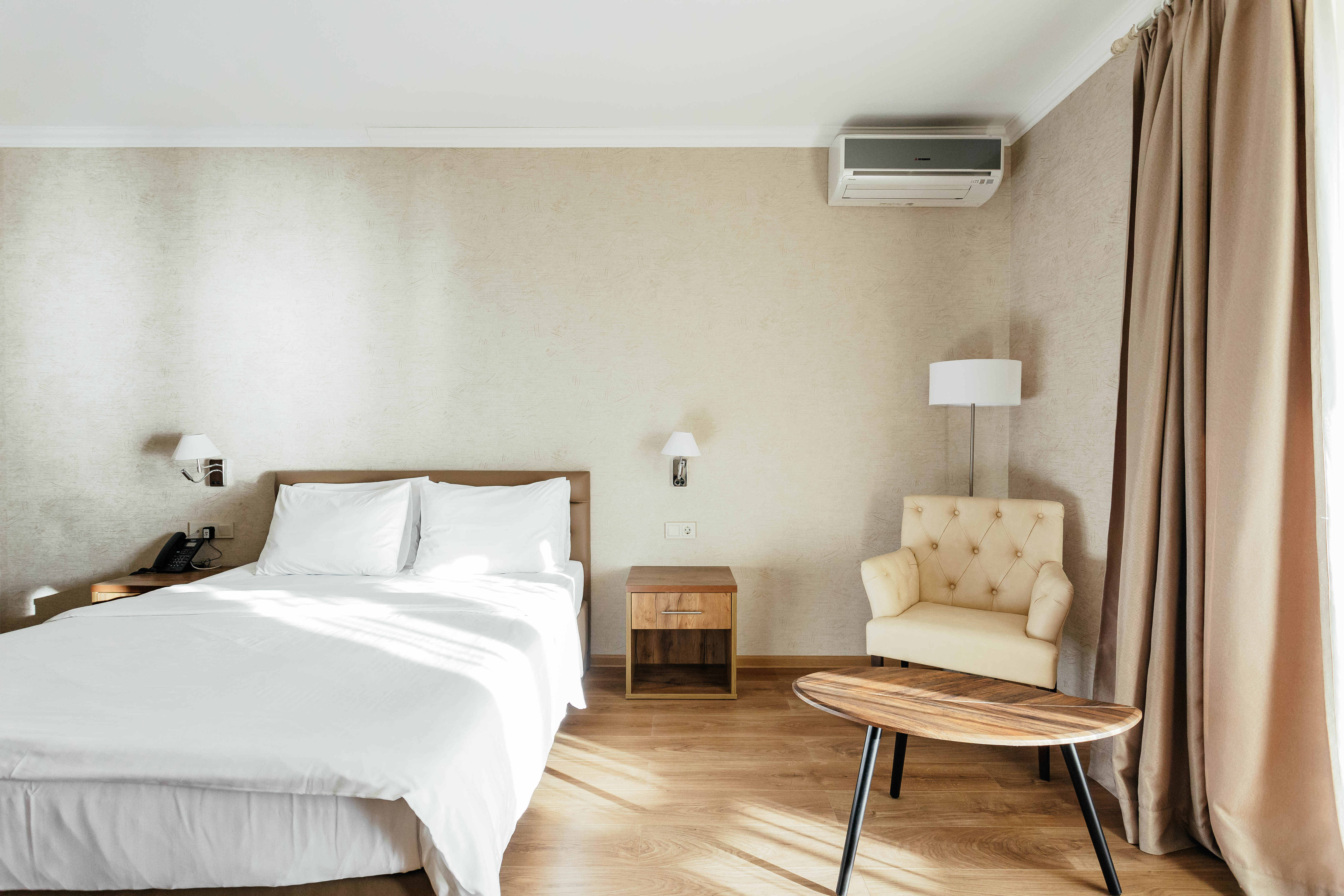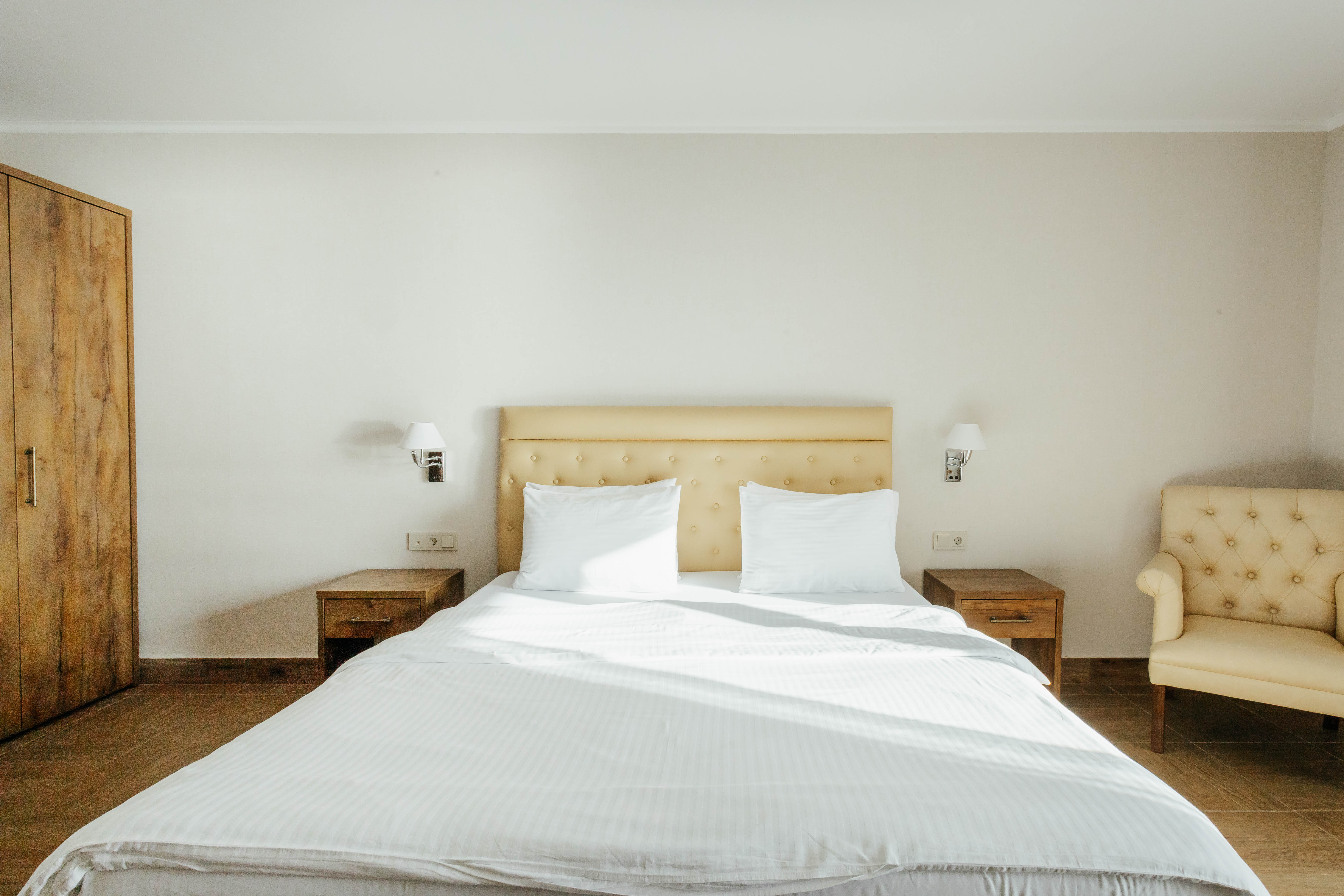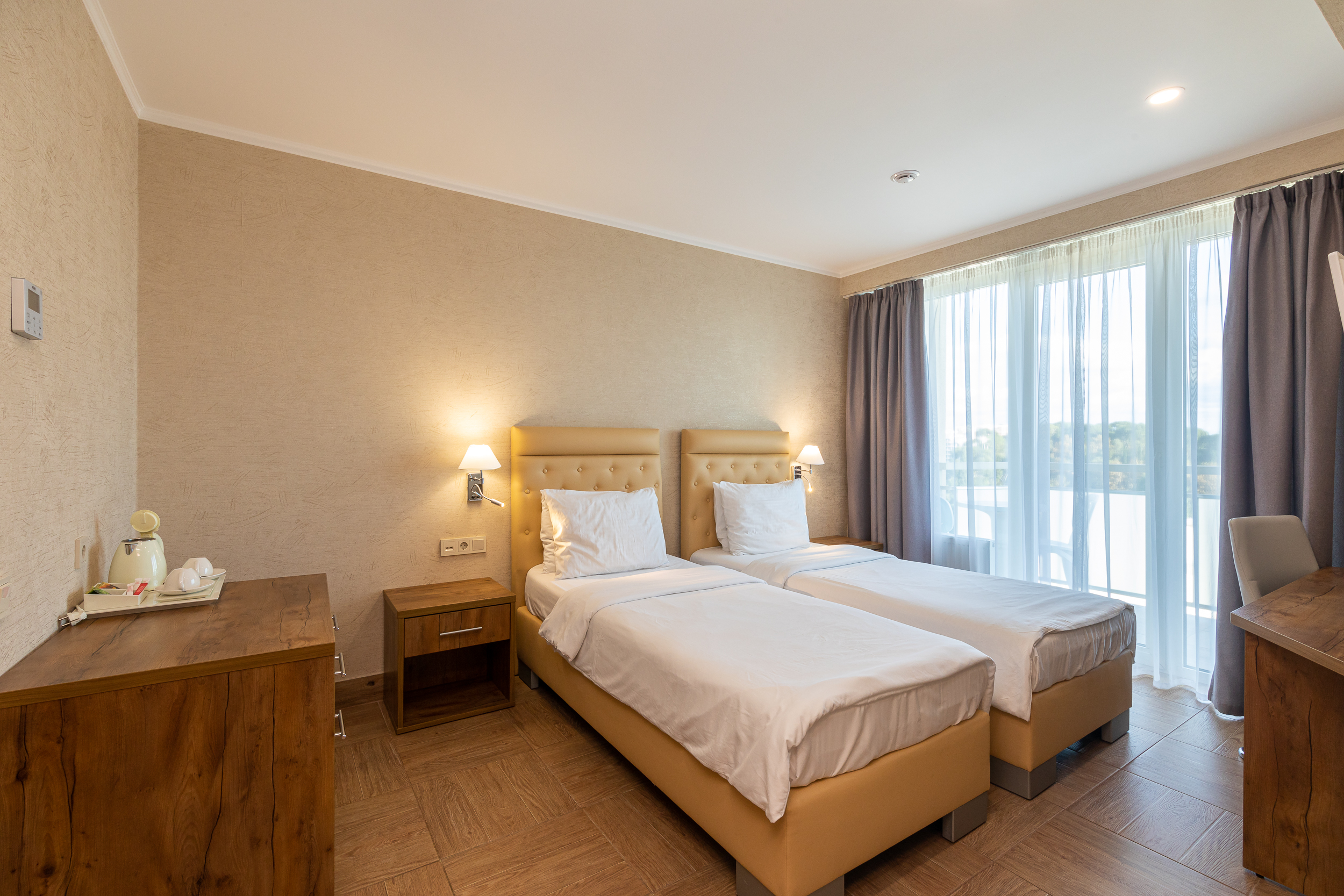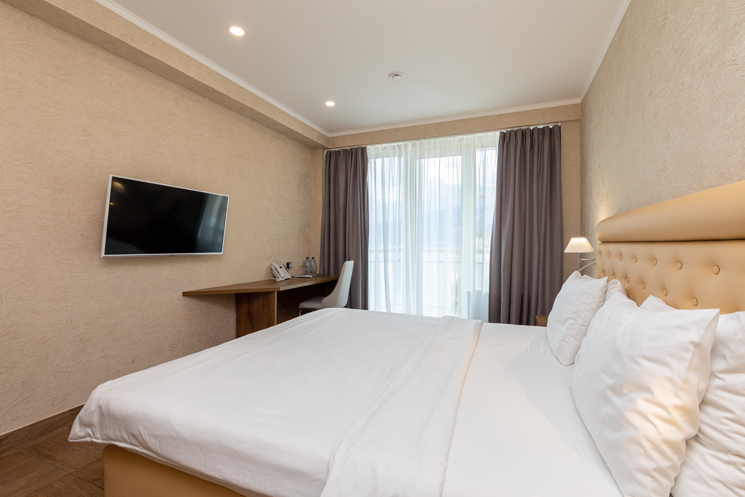 В номере: вешалка, диван раскладной, зеркало, кресло, кровать двуспальная, прикроватные тумбочки, стол, столик журнальный, стул, шкаф, сейф, сплит-система, телевизор, телефон, холодильник, чайная станция