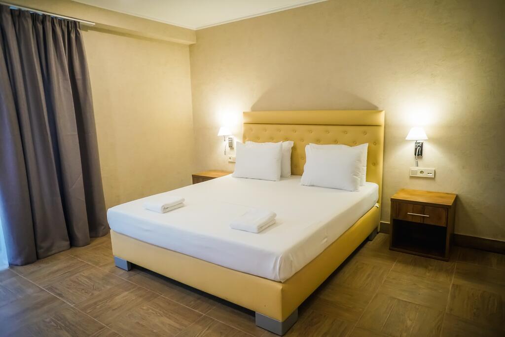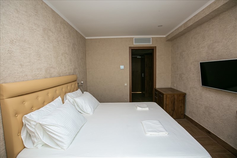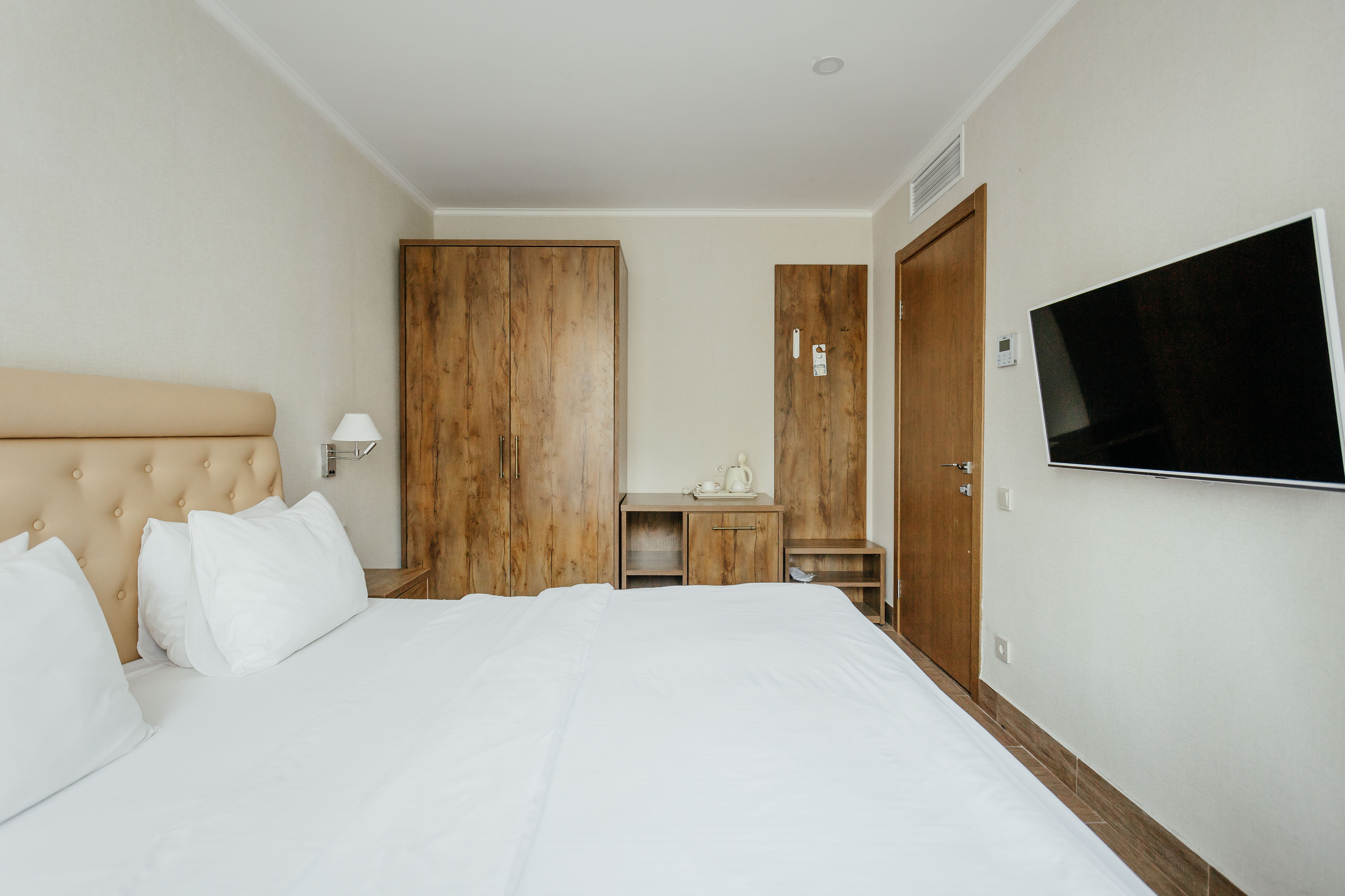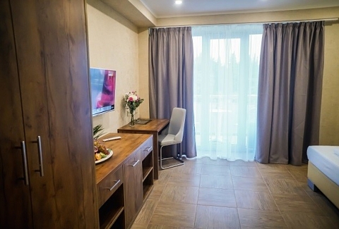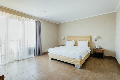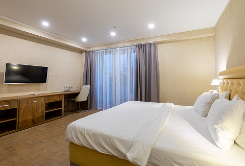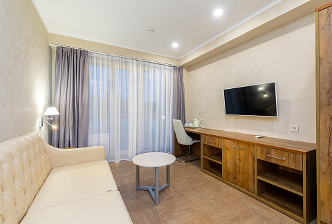 В номере: вешалка, диван раскладной, зеркало, кровать двуспальная, прикроватные тумбочки, стол, столик журнальный, стул, шкаф, сейф, сплит-система, телевизор, телефон, холодильник, чайная станция