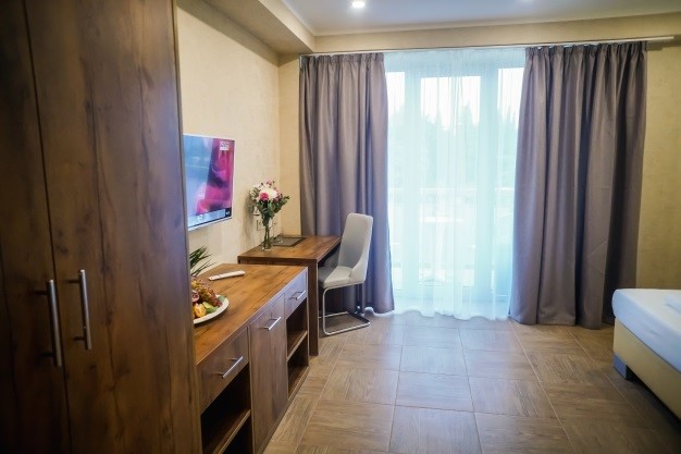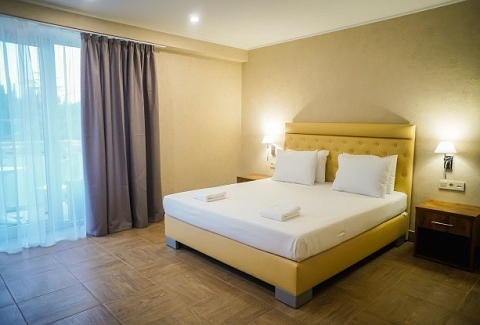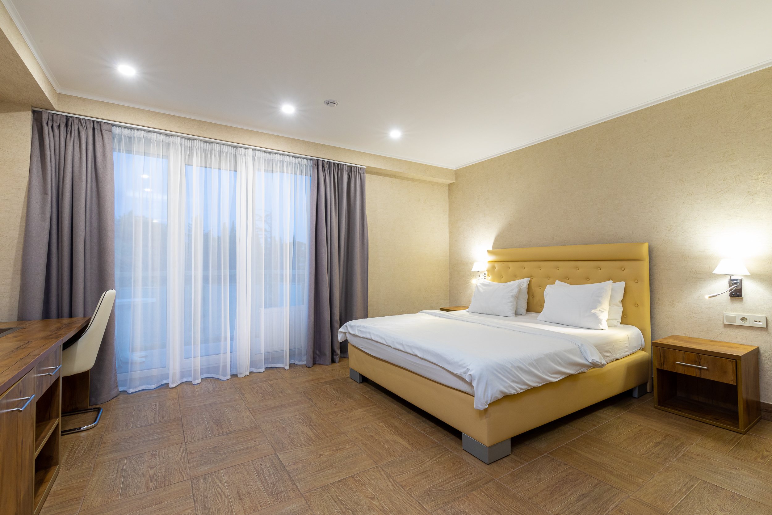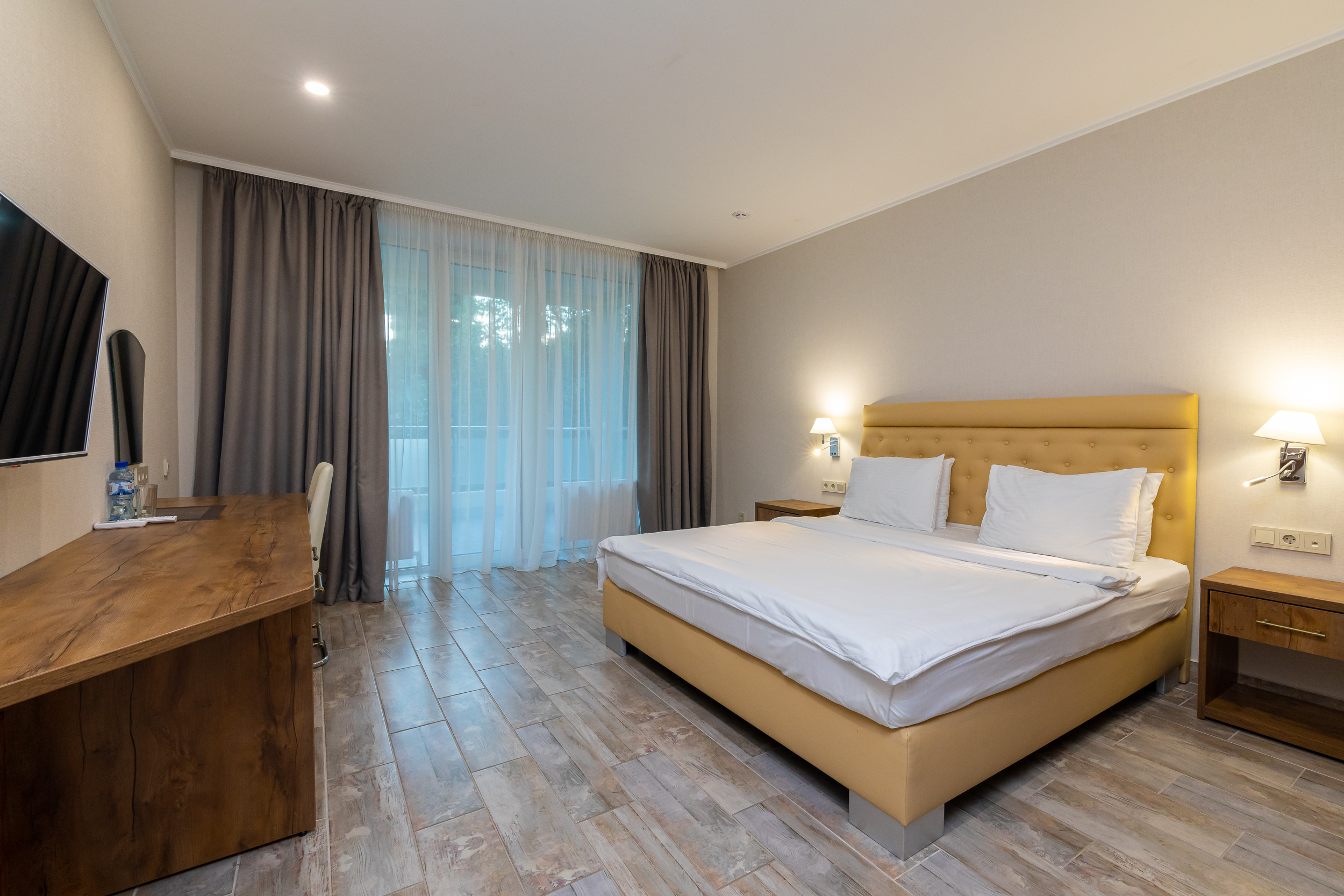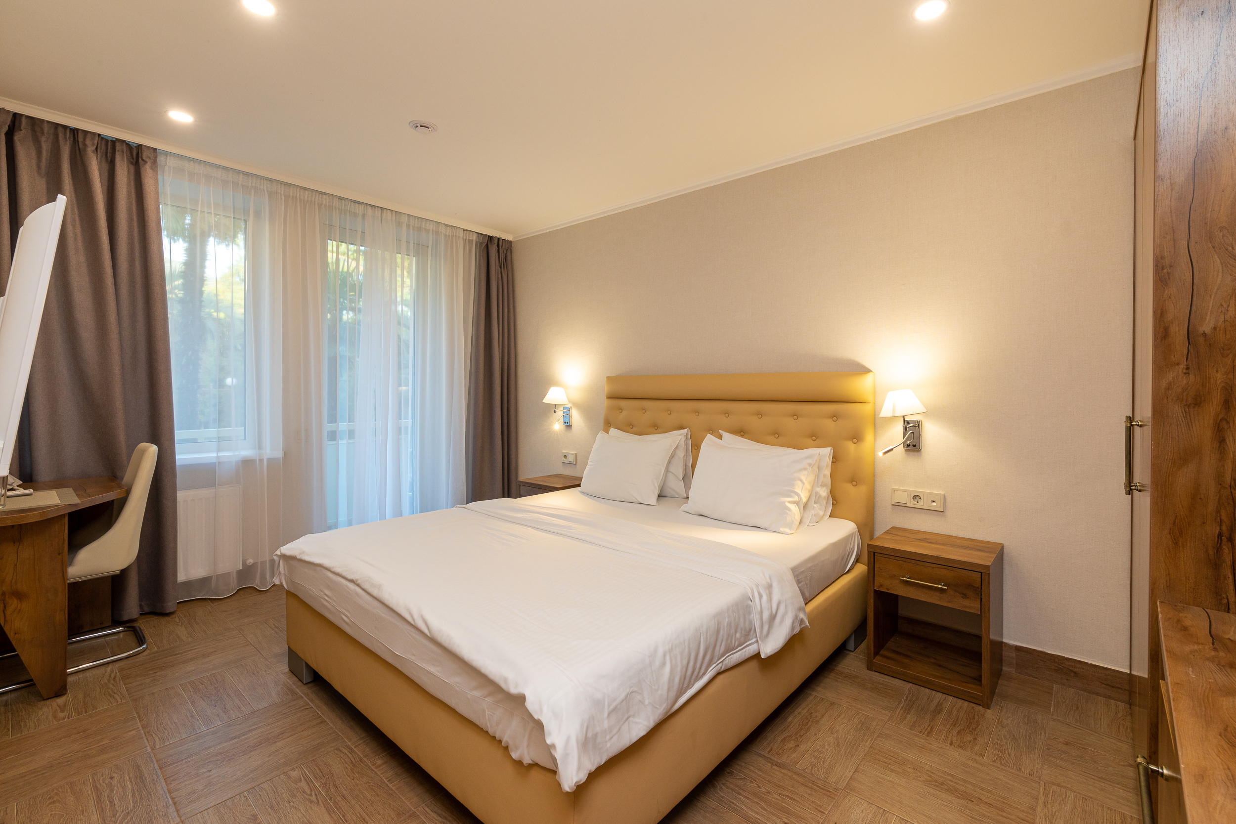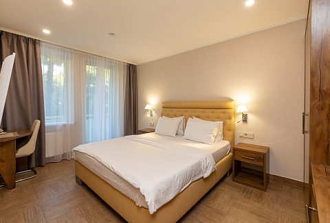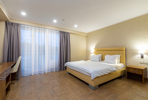 В номере: вешалка, диван, зеркало, кровать двуспальная, прикроватные тумбочки, стол, стулья, шкаф, сейф, сплит-система, телевизор, телефон, холодильник, чайная станция