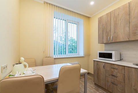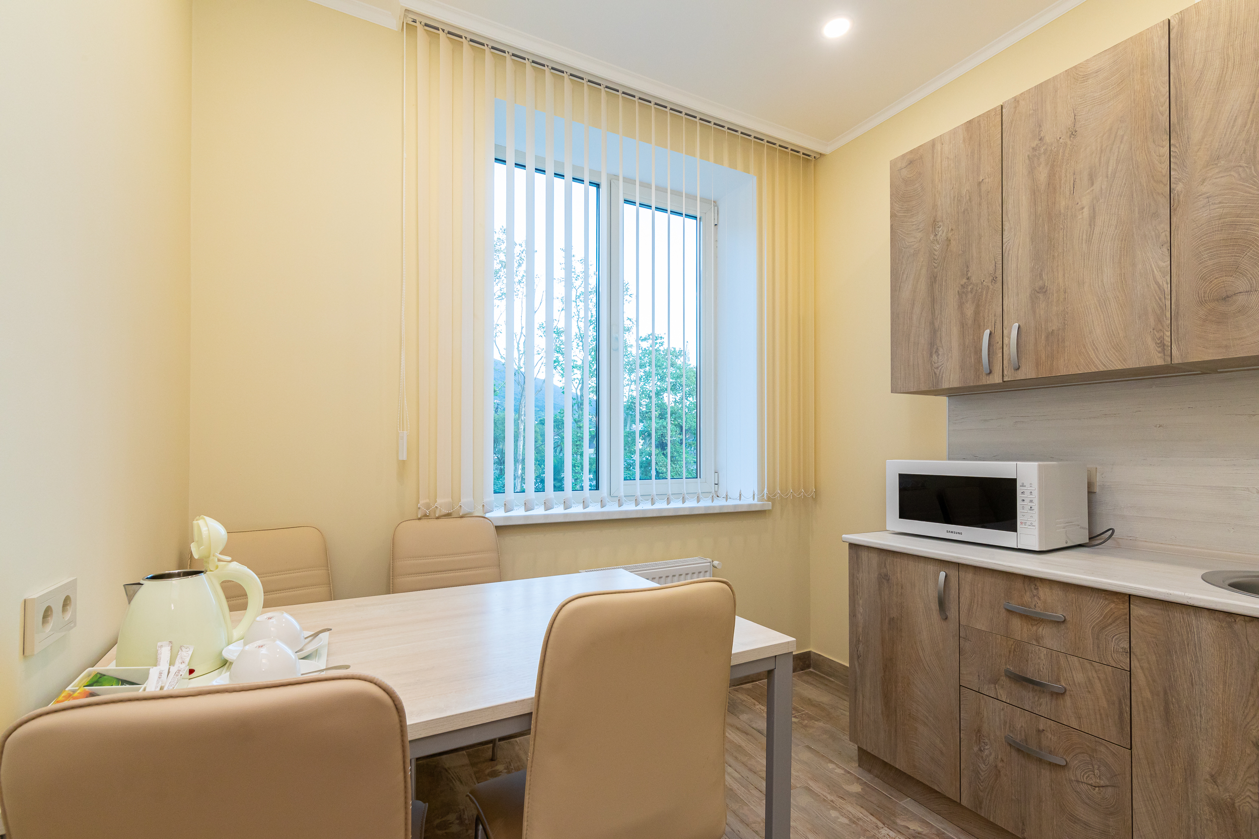 В номере: вешалка, диван раскладной, зеркало, кресло, кровати односпальные, кровать двуспальная, кухонная мебель, прикроватные тумбочки, стол, столик журнальный, стол обеденный, стулья, шкаф, микроволновая печь, набор посуды, сейф, сплит-система, телевизор, телефон, холодильник, чайная станция