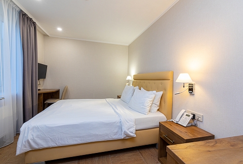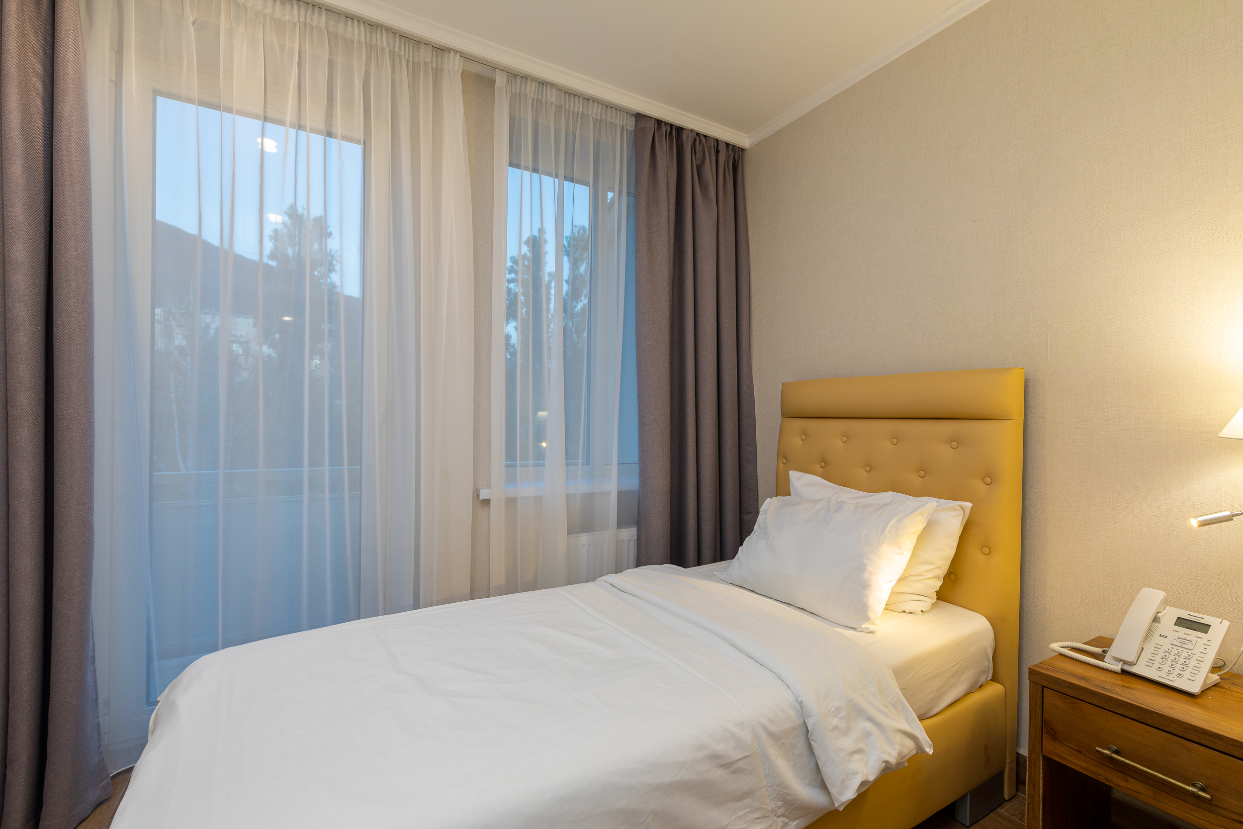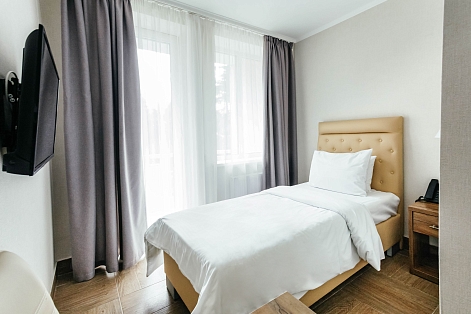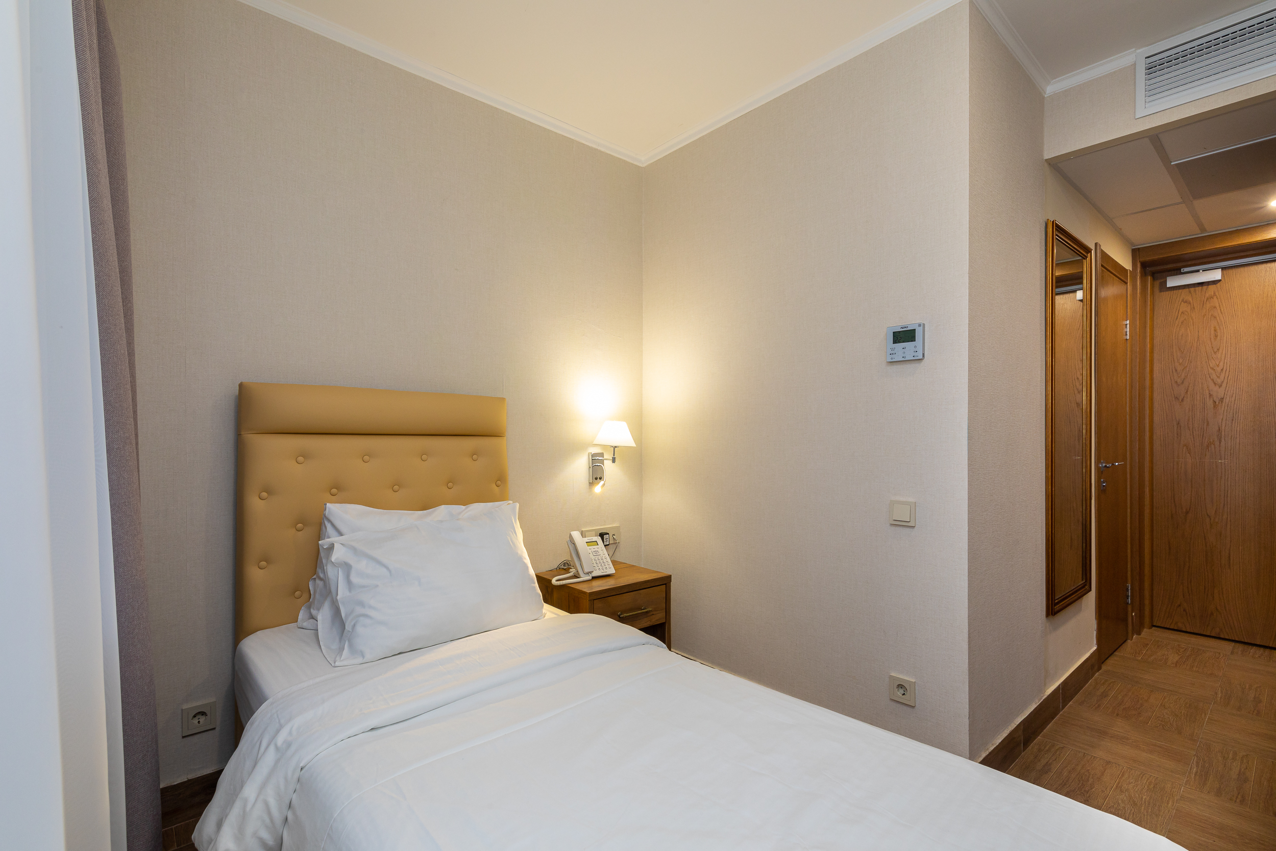 В номере: вешалка, зеркало, кровать односпальная, прикроватная тумбочка, стол, стул, шкаф, сейф, сплит-система, телевизор, телефон, холодильник, чайная станция