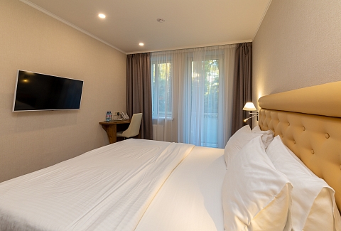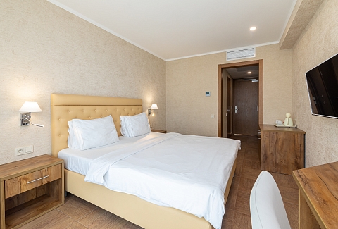 В номере: вешалка, зеркало, кровать двуспальная, прикроватные тумбочки, стол, стулья, шкаф, сейф, сплит-система, телевизор, телефон, холодильник, чайная станция
