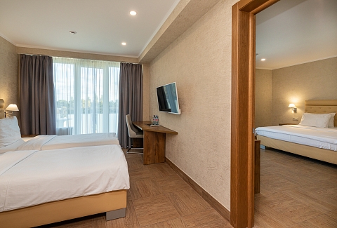 В номере: вешалка, зеркало, кровати односпальные, кровать двуспальная, прикроватные тумбочки, стол, стулья, шкаф, сейф, сплит-система, телевизор, телефон, холодильник, чайная станция
