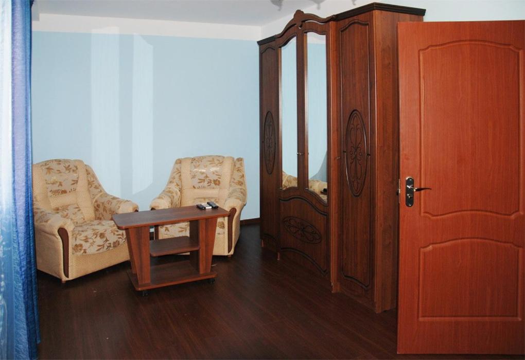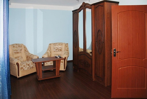 В номере: вешалка, зеркало, комод, кровать двуспальная, набор мягкой мебели, прикроватные тумбочки, стол, стулья, шкаф, кондиционер, набор посуды, телевизор, холодильник