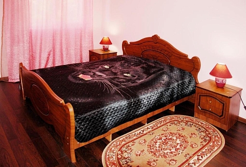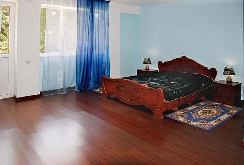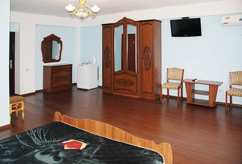 В номере: зеркало, кровать двуспальная, прикроватные тумбочки, шкаф, кондиционер, набор посуды, телевизор, холодильник