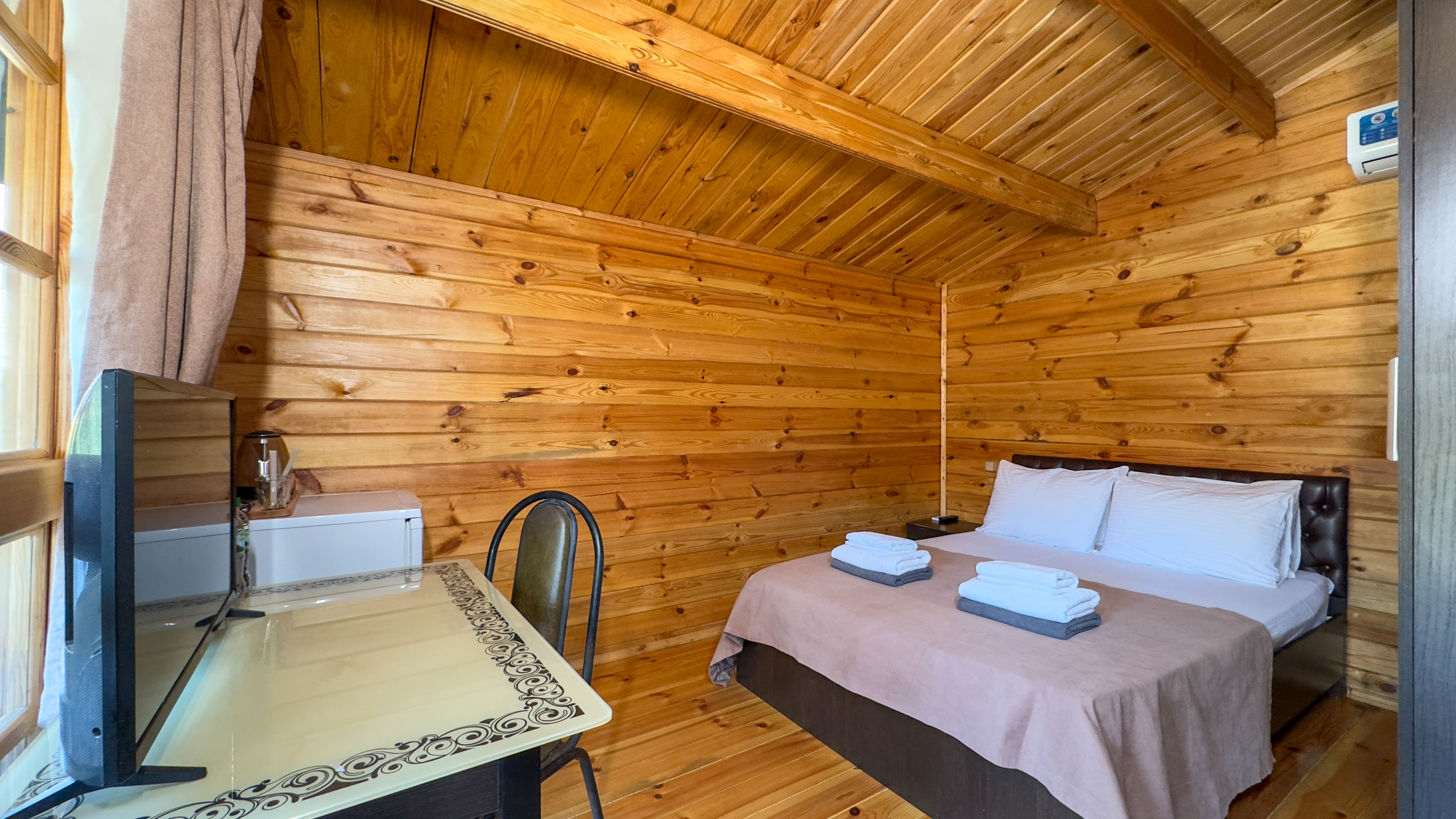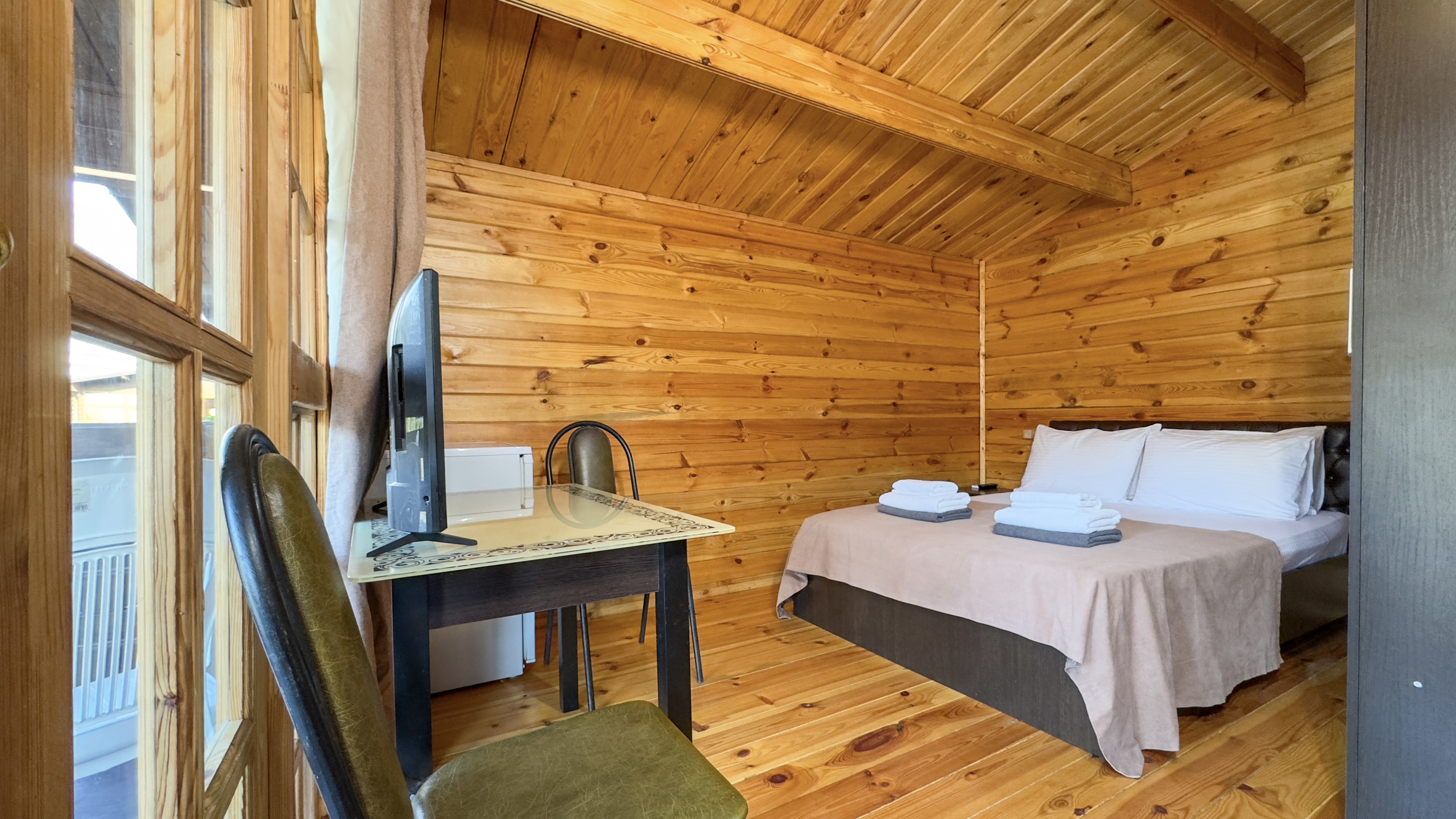 В номере: вешалка, диван раскладной, зеркало, кровать двуспальная, прикроватные тумбочки, стол, стулья, шкаф, кондиционер, мини-холодильник, сейф, телевизор, чайная станция