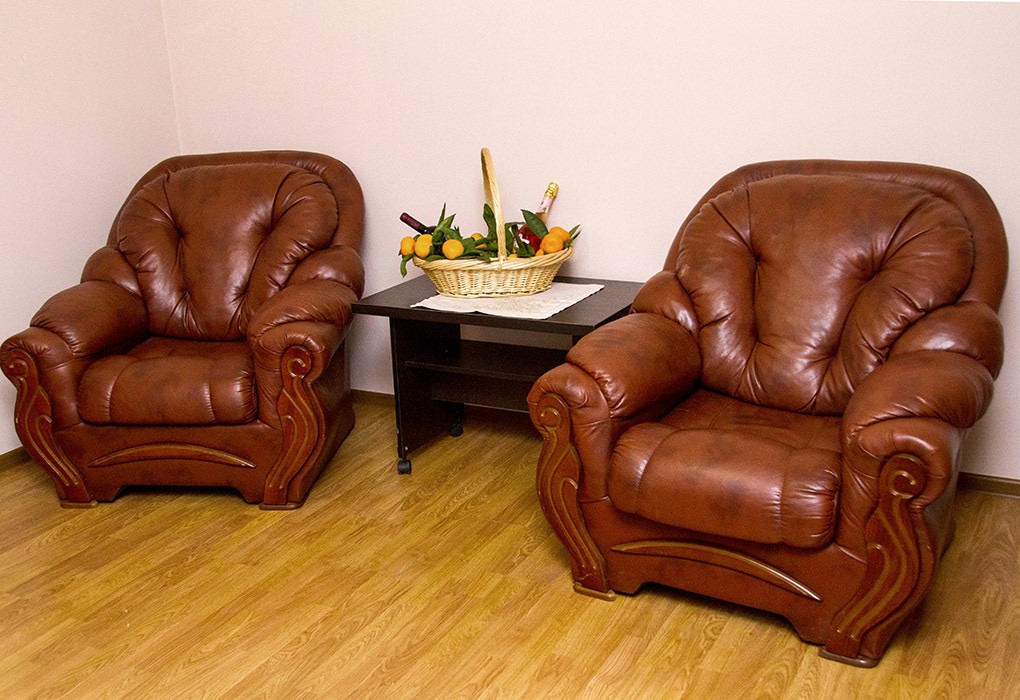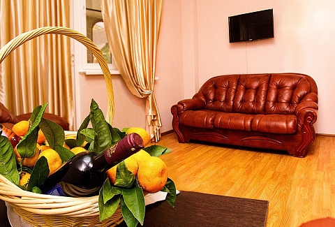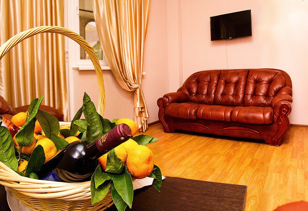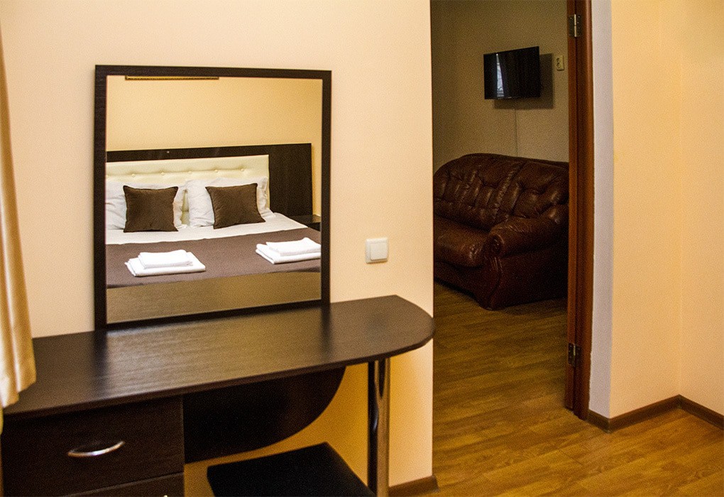 В номере: вешалка, диван раскладной, зеркало, кресла, кровать двуспальная, прикроватные тумбочки, столик журнальный, шкаф, кондиционер, телевизор, холодильник