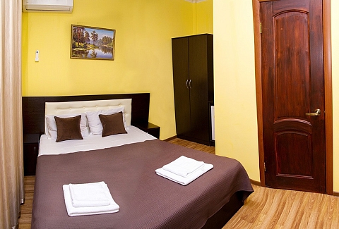В номере: вешалка, зеркало, кровать двуспальная, прикроватные тумбочки, столик журнальный, шкаф, кондиционер, телевизор, холодильник
