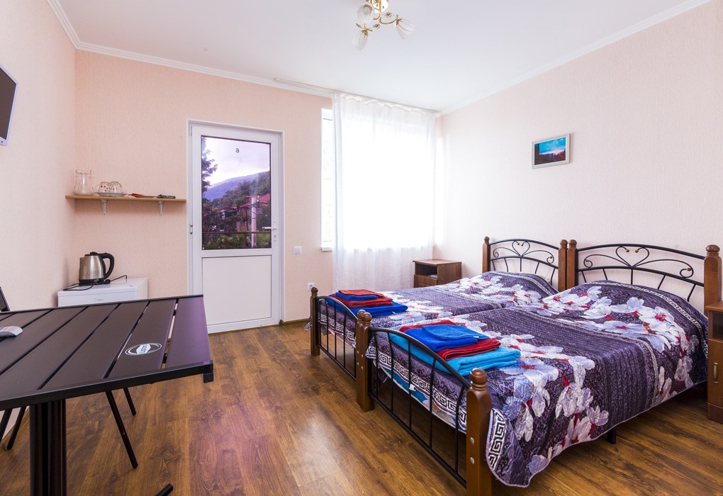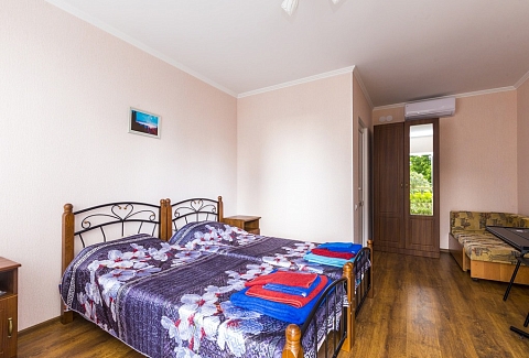 В номере: вешалка, диван, зеркало, прикроватные тумбочки, стол, стулья, кондиционер, телевизор, холодильник