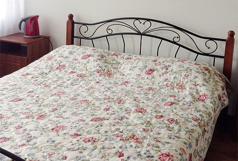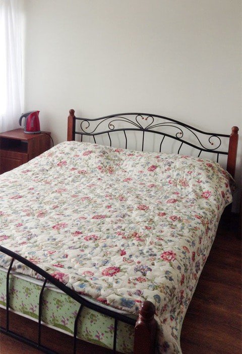 В номере: вешалка, зеркало, кровать двуспальная, прикроватные тумбочки, стол, стул, шкаф, кондиционер, телевизор, холодильник