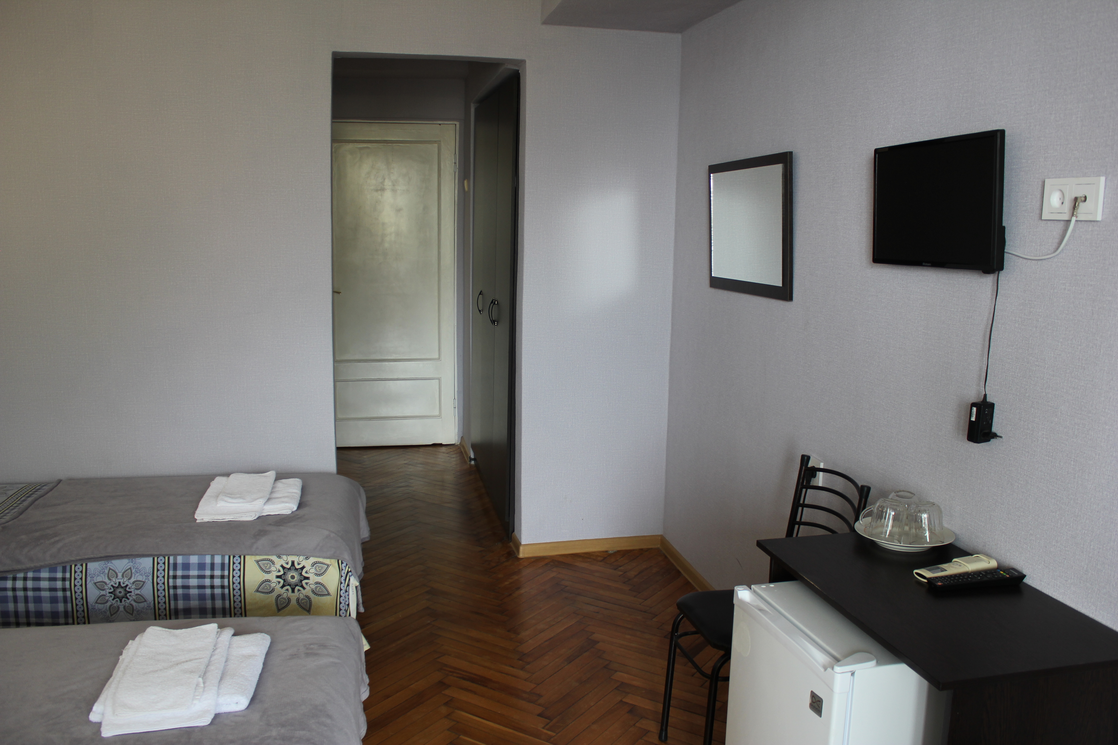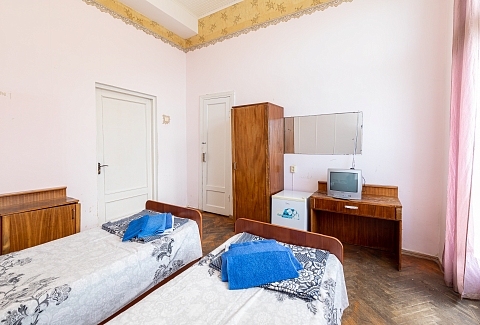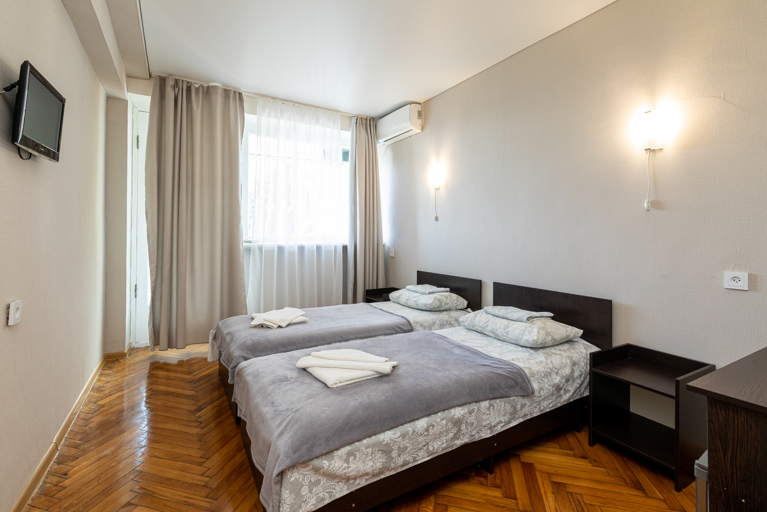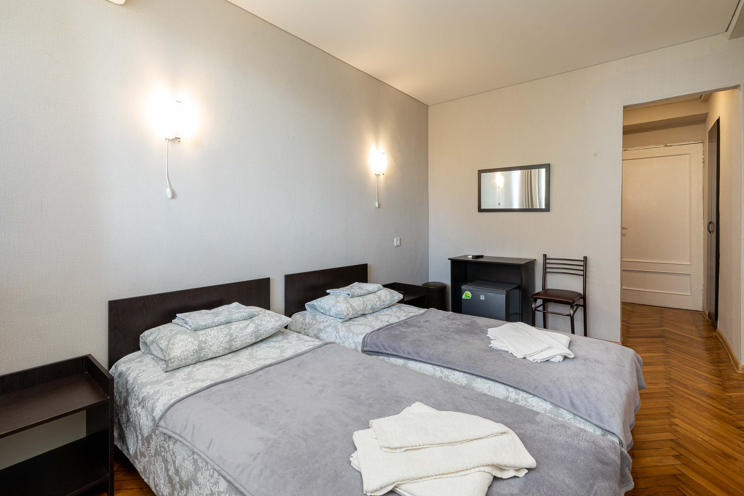 В номере: вешалка, зеркало, кровати односпальные, прикроватные тумбочки, стол, стулья, шкаф, кондиционер, телевизор, холодильник, чайный набор посуды