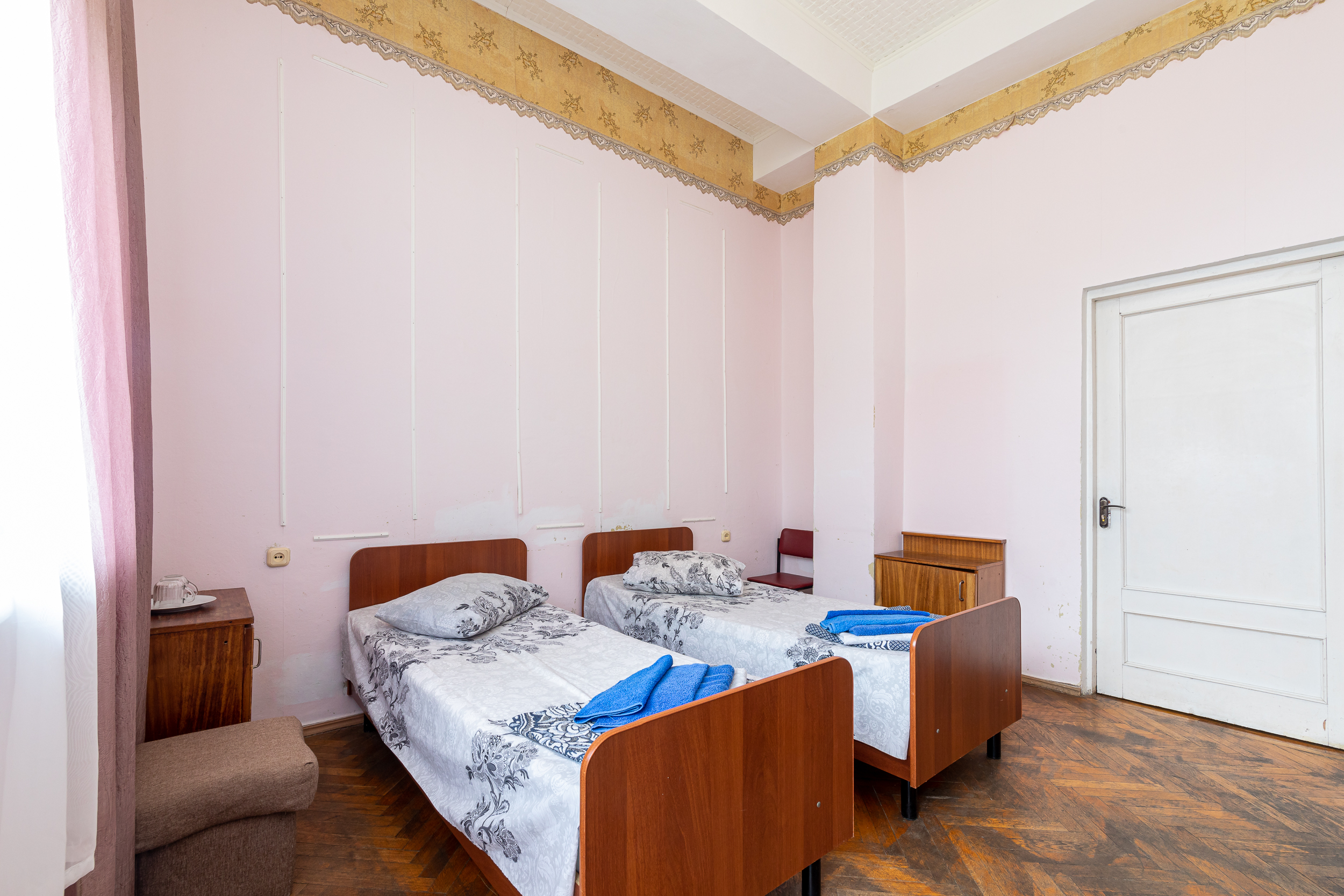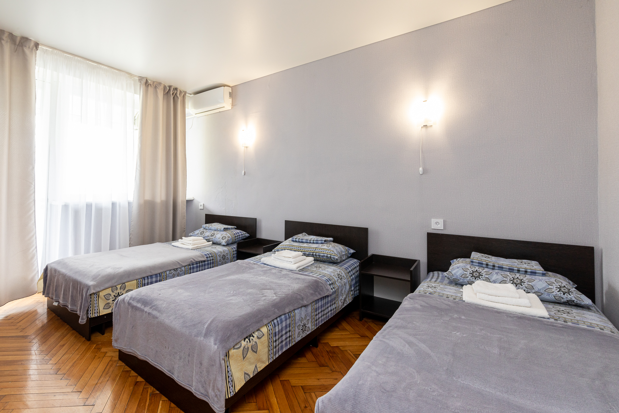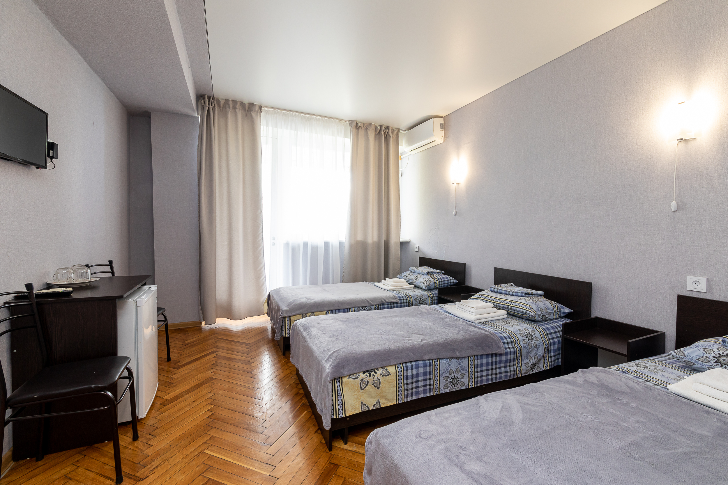 В номере: вешалка, зеркало, кровати односпальные, прикроватные тумбочки, стол, стулья, шкаф, кондиционер, телевизор, холодильник, чайный набор посуды