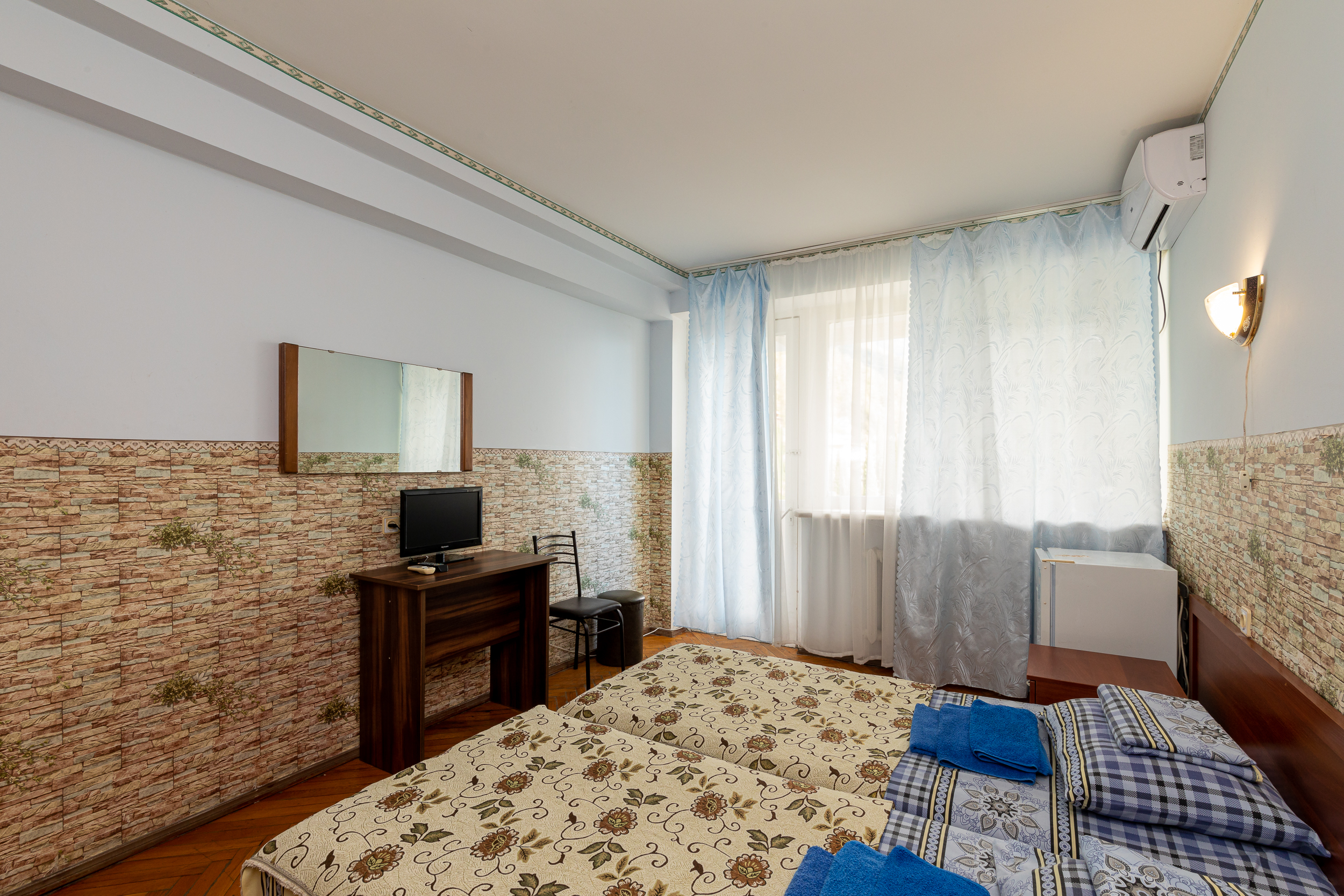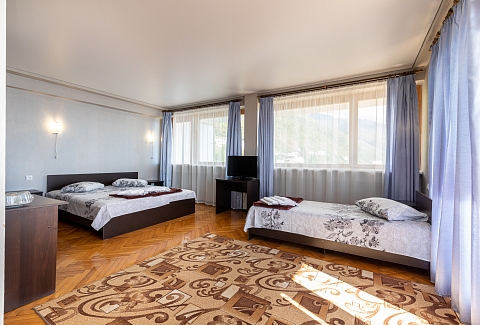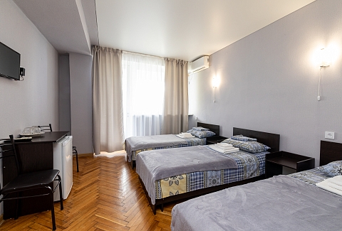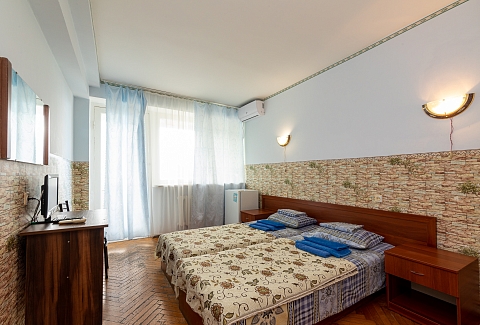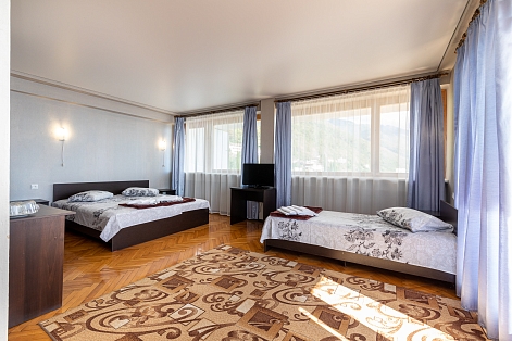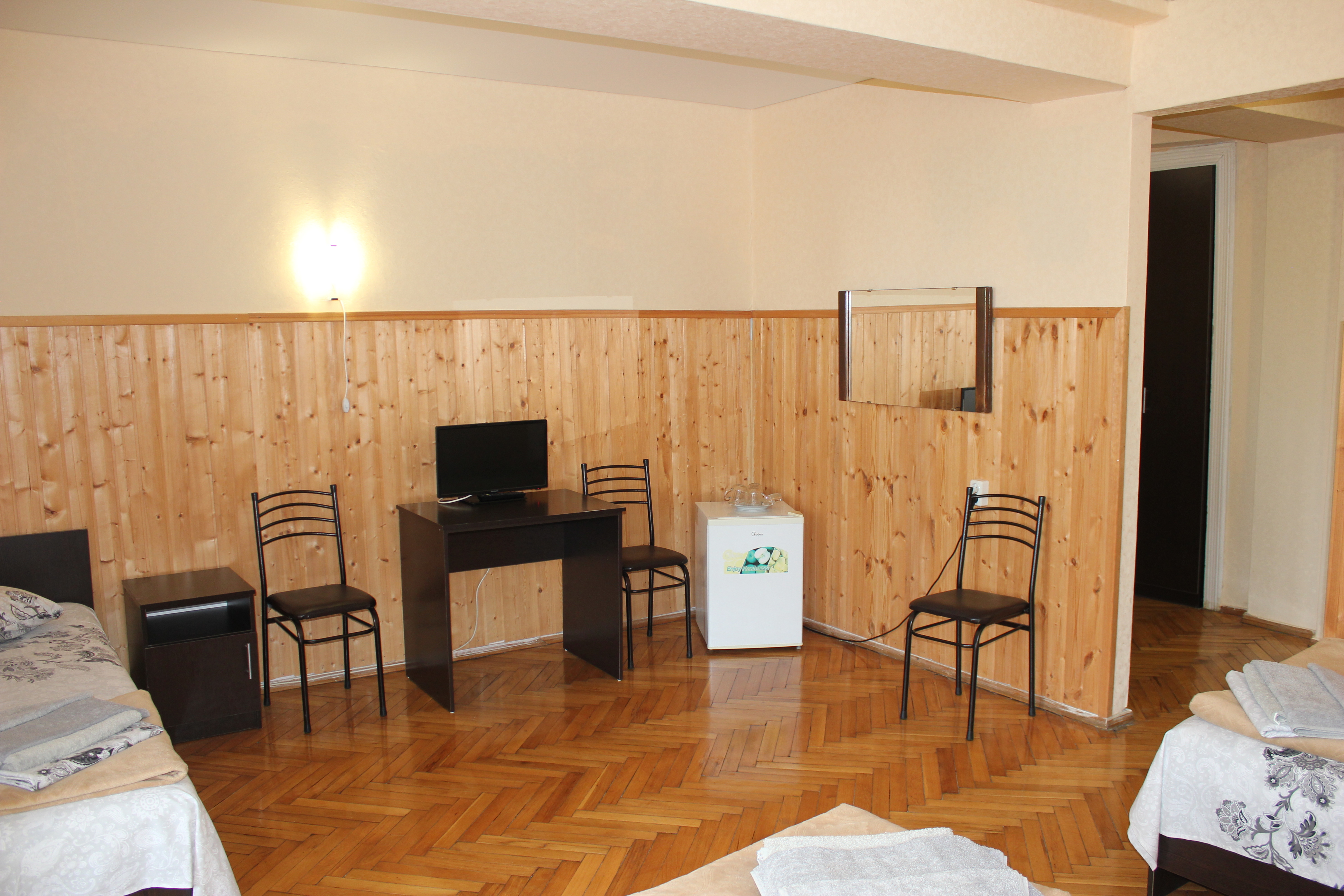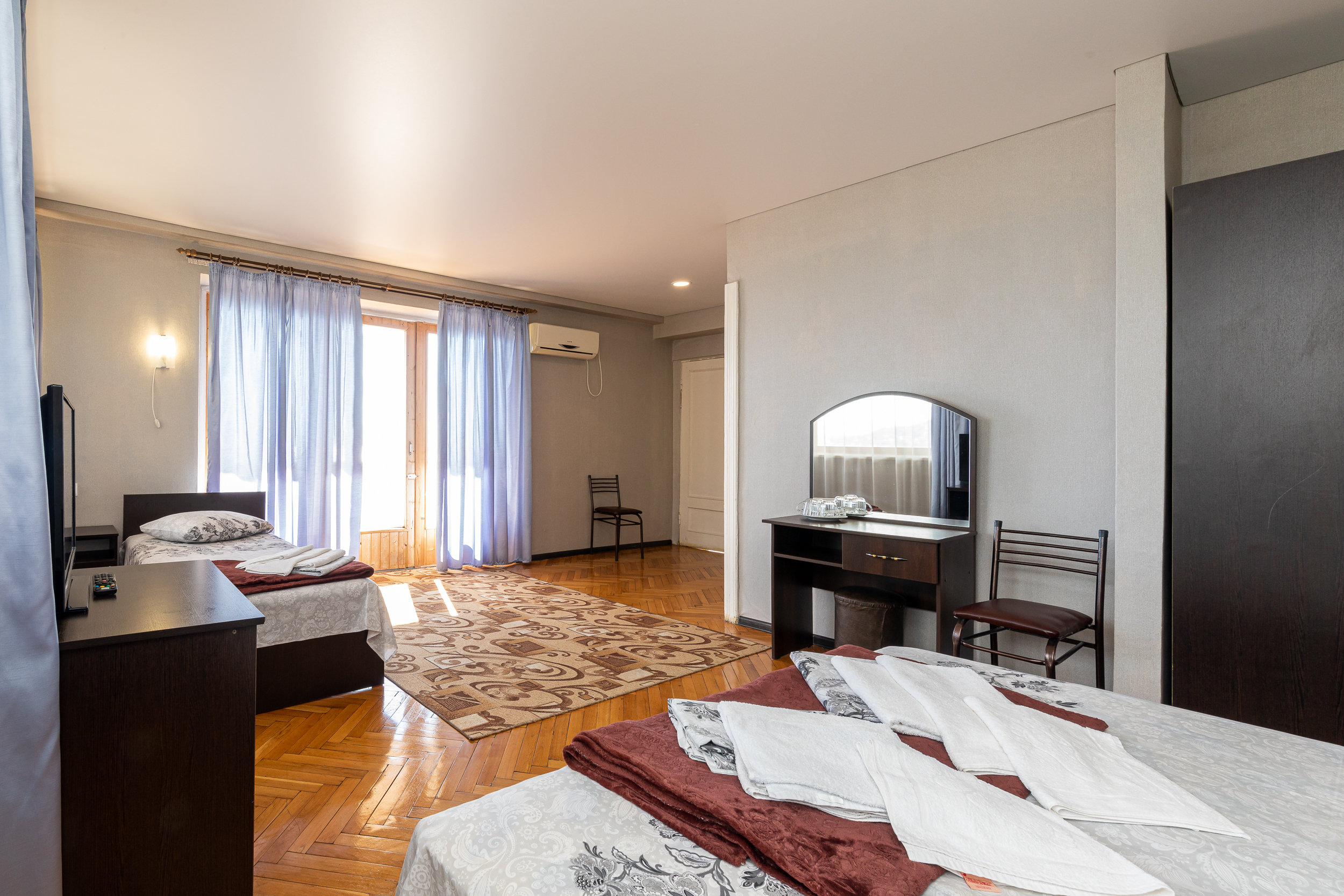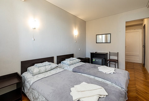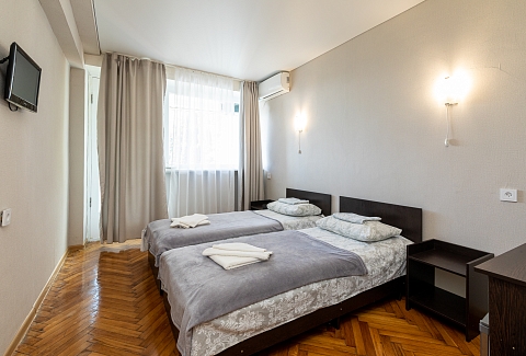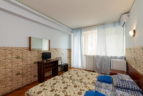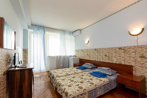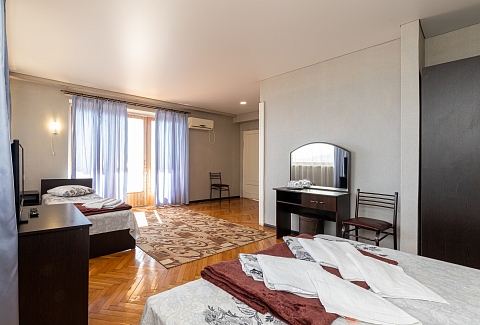 В номере: вешалка, зеркало, кровать двуспальная, кровать односпальная, прикроватные тумбочки, стол, столик журнальный, стулья, шкаф, кондиционер, телевизор, холодильник, чайный набор посуды, электрочайник