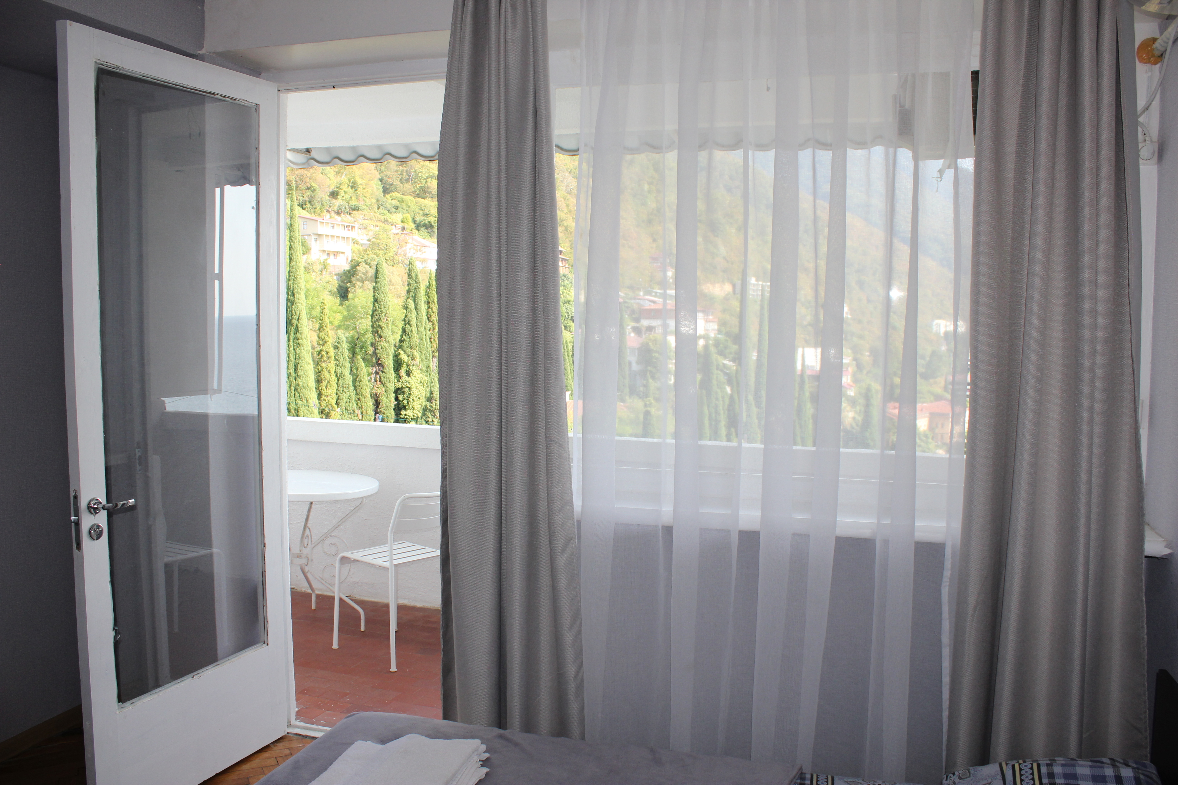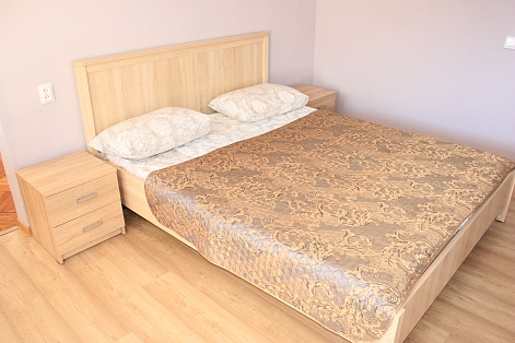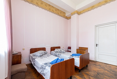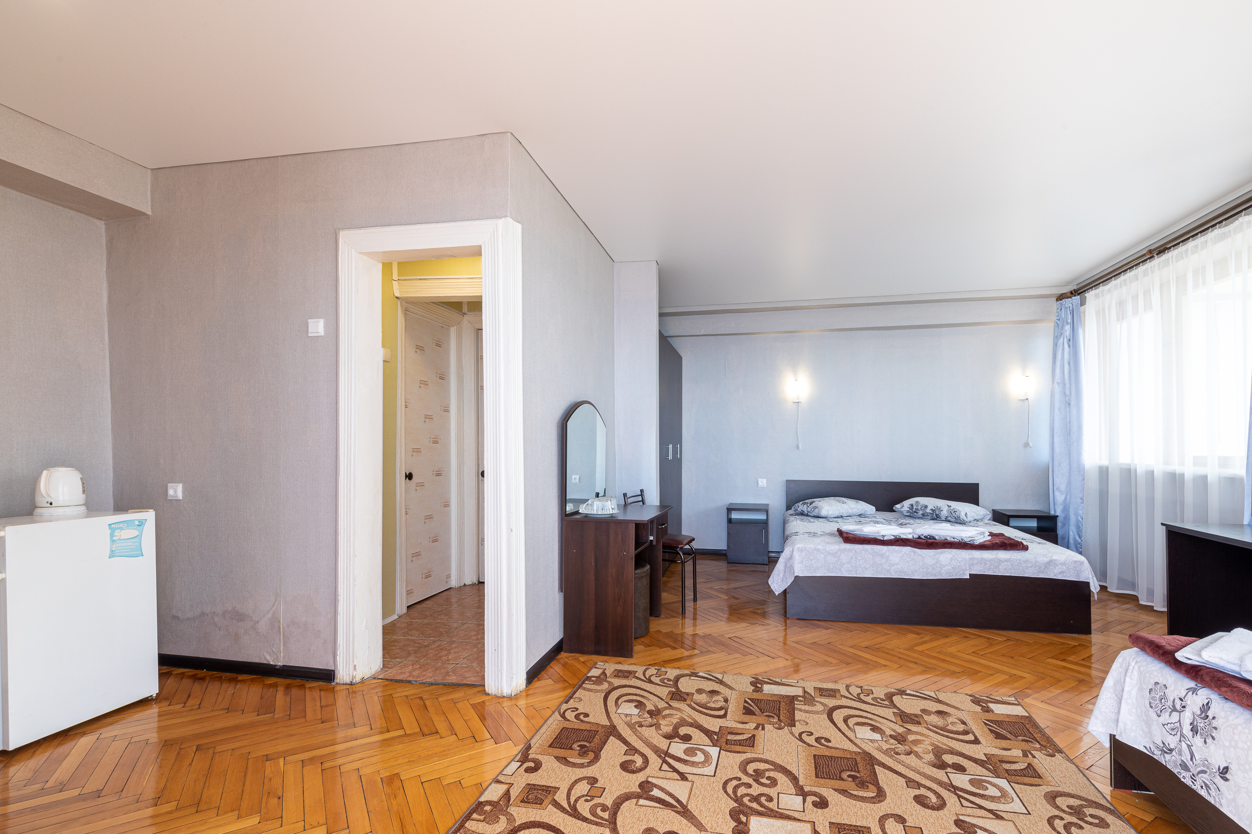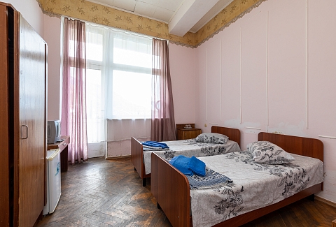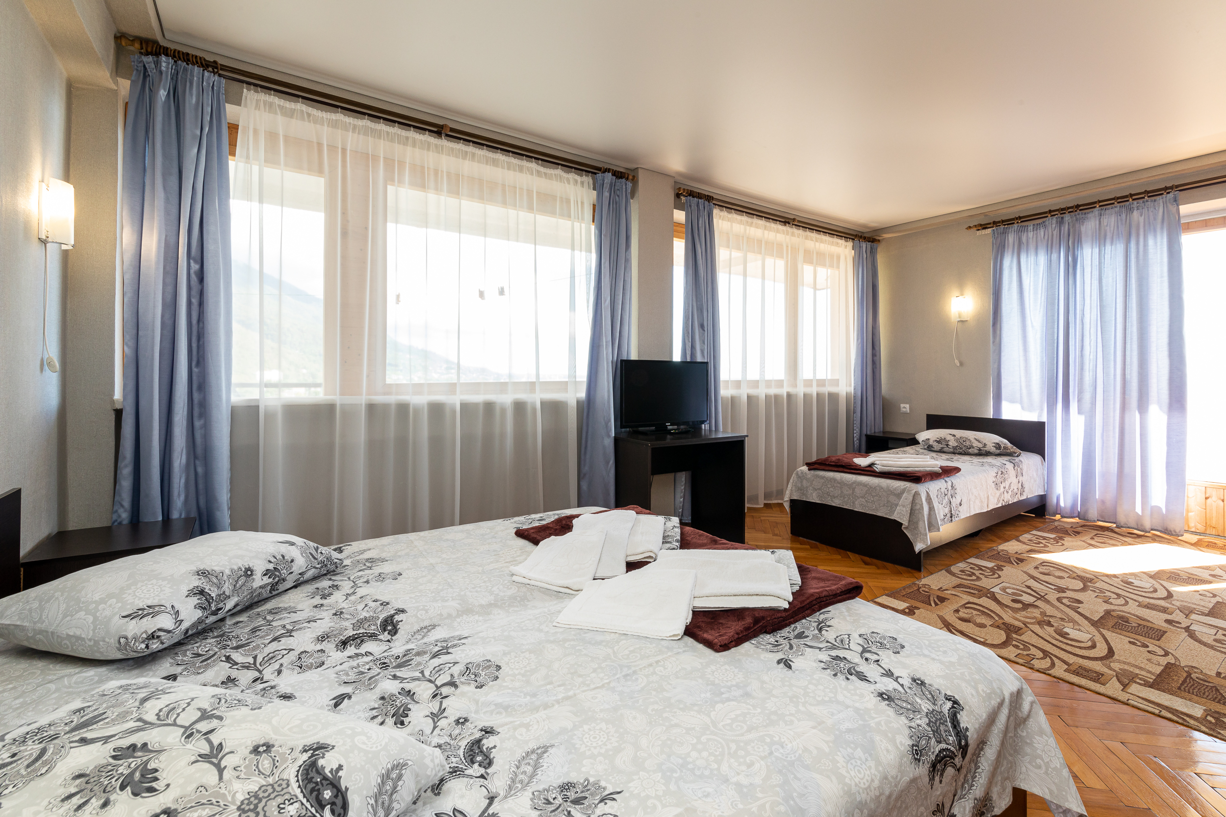 В номере: вешалка, зеркало, кровать двуспальная, кровать односпальная, прикроватные тумбочки, стол, столик журнальный, стулья, шкаф, кондиционер, телевизор, холодильник, чайный набор посуды, электрочайник