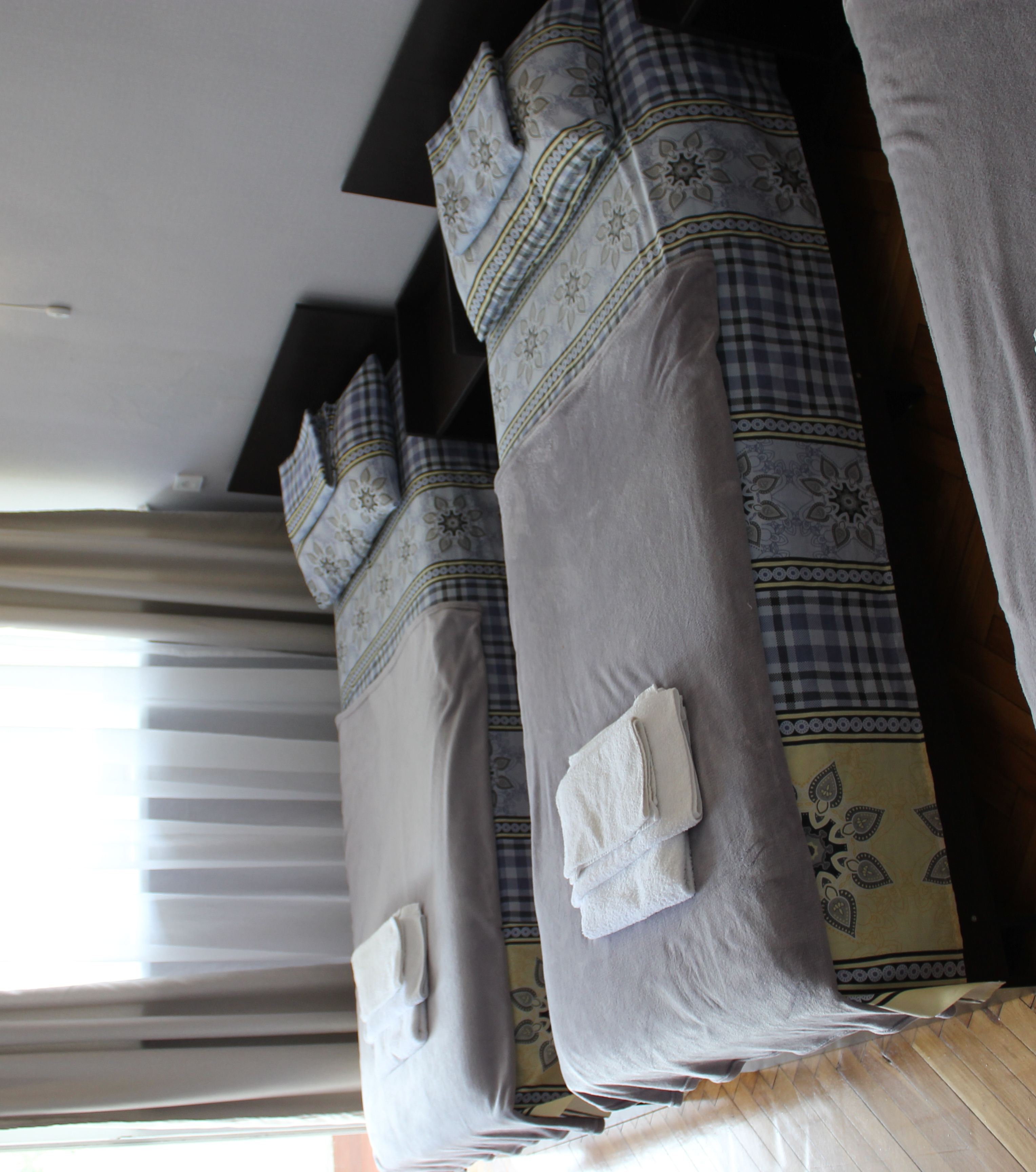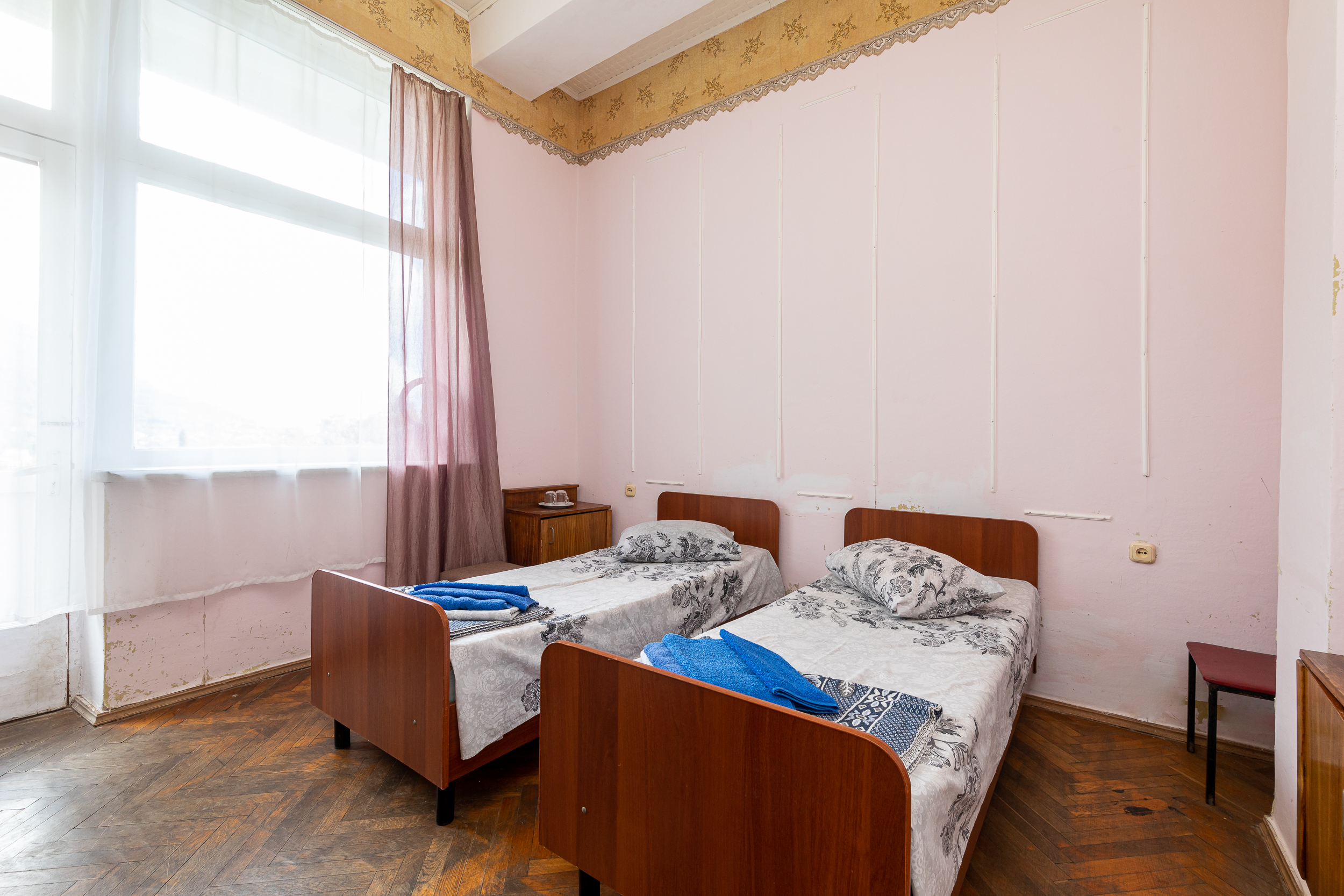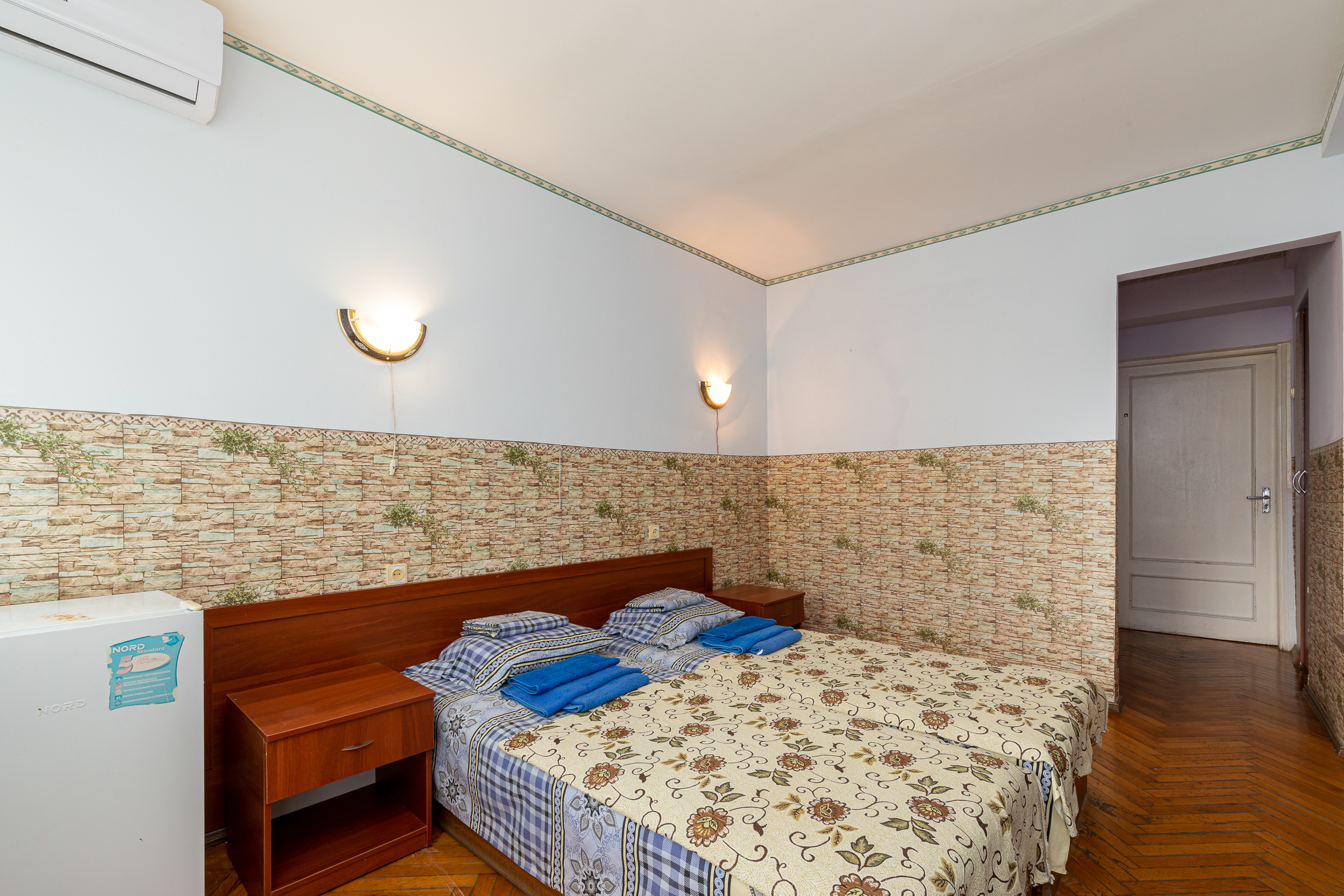 В номере: вешалка, зеркало, кровати односпальные /одна двуспальная кровать, прикроватные тумбочки, стол, стулья, шкаф, вентилятор