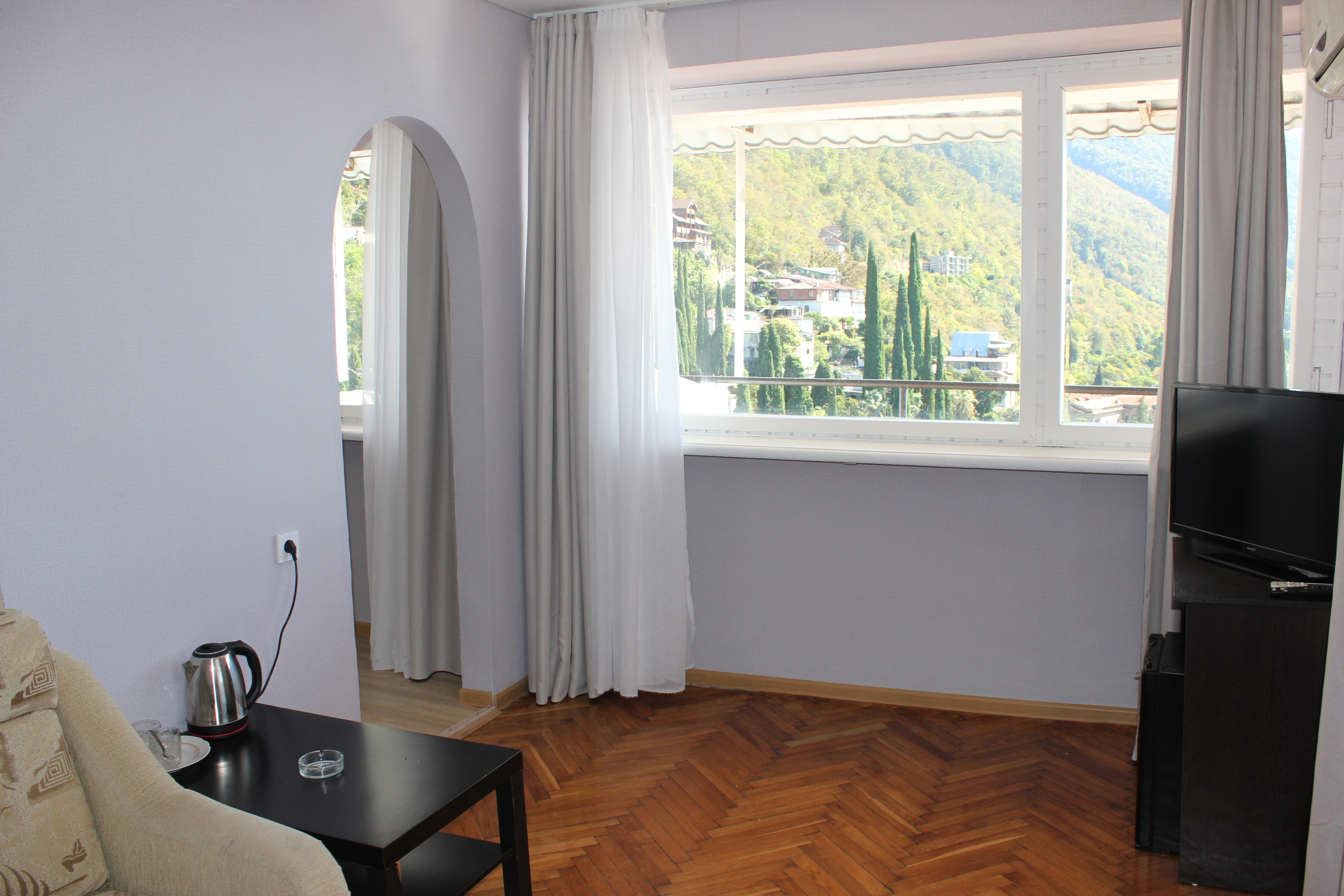 В номере: вешалка, диван, зеркало, кровать двуспальная, прикроватные тумбочки, стол, столик журнальный, стулья, шкаф, кондиционер, телевизор, холодильник, чайный набор посуды, электрочайник