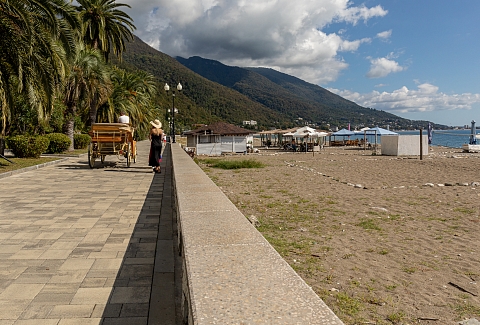 Поездом или самолетом – до г. Сочи (Адлер), далее на общественном транспорте или на такси до «Казачьего рынка» (8 км от ж/д вокзала, 15 км от аэропорта), затем пройти пешком около 500 м до пограничного поста на р. Псоу до границы России и Абхазии. После самостоятельного прохождения паспортного и таможенного контроля до места отдыха можно доехать на автобусе, маршрутном такси или воспользоваться услугами частных водителей.