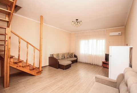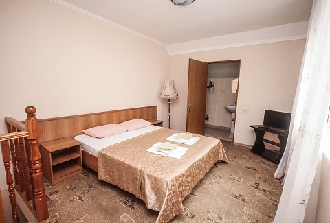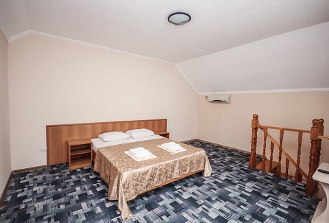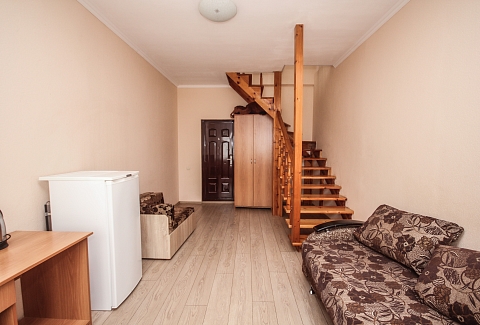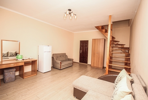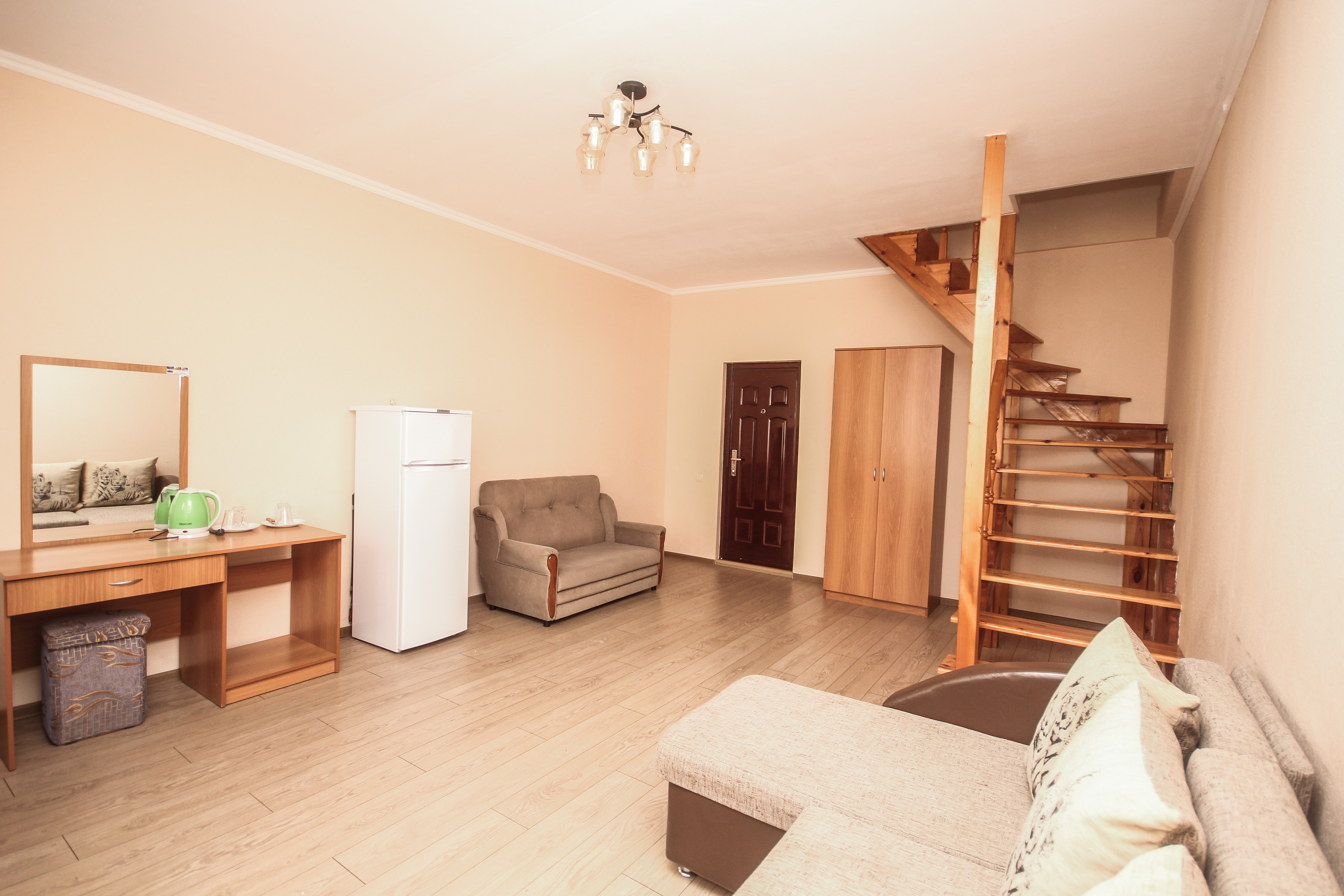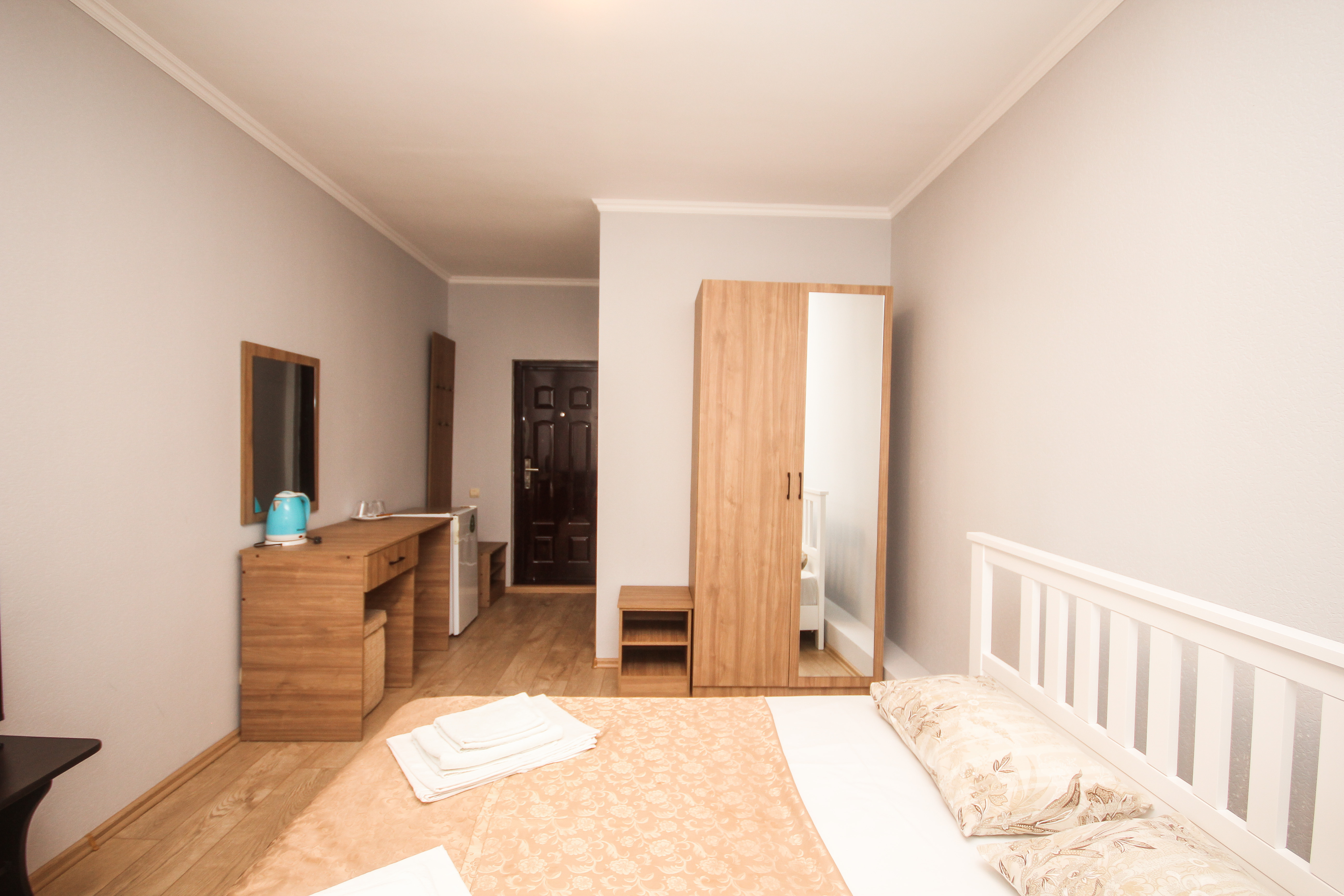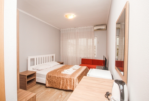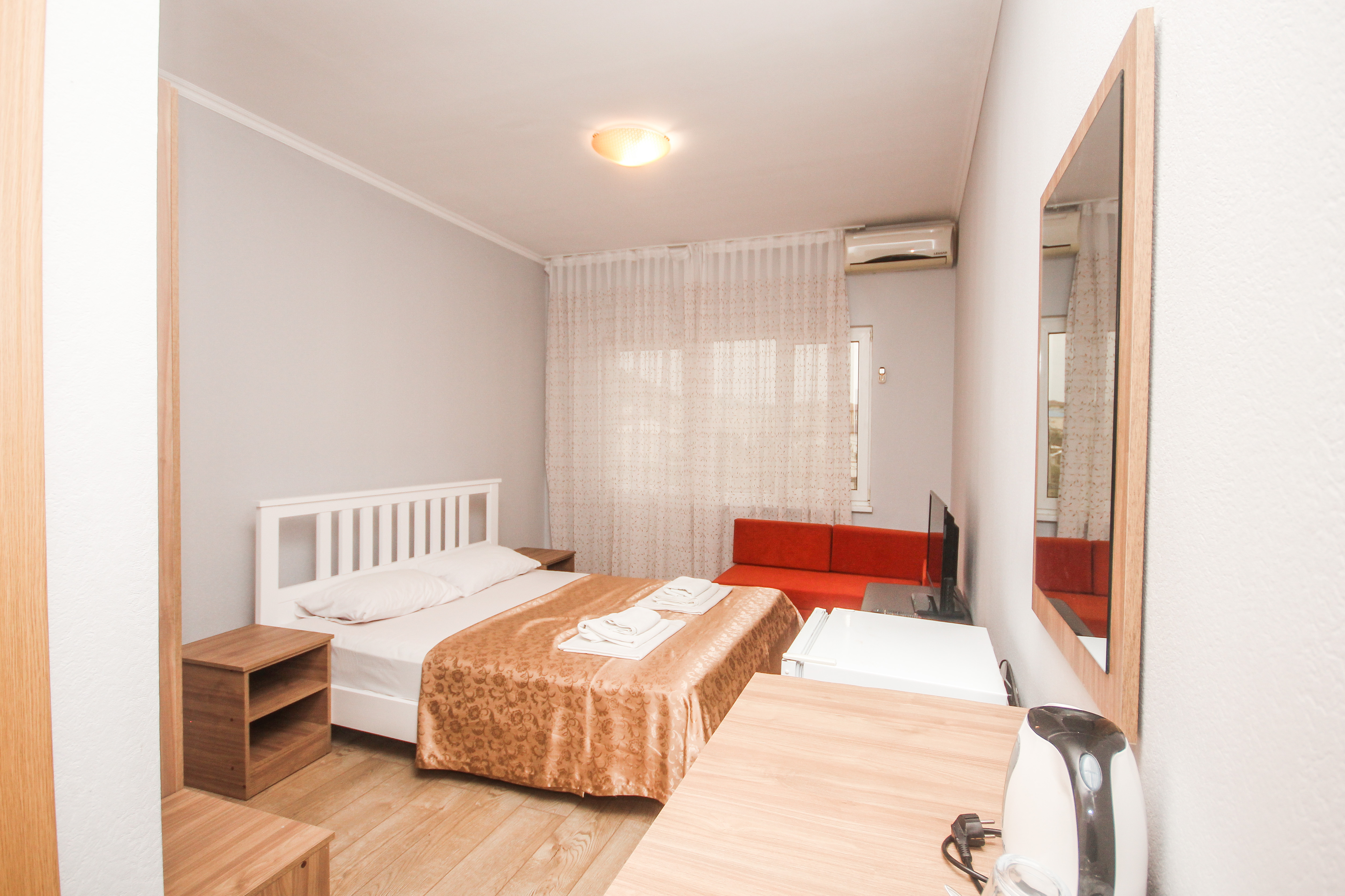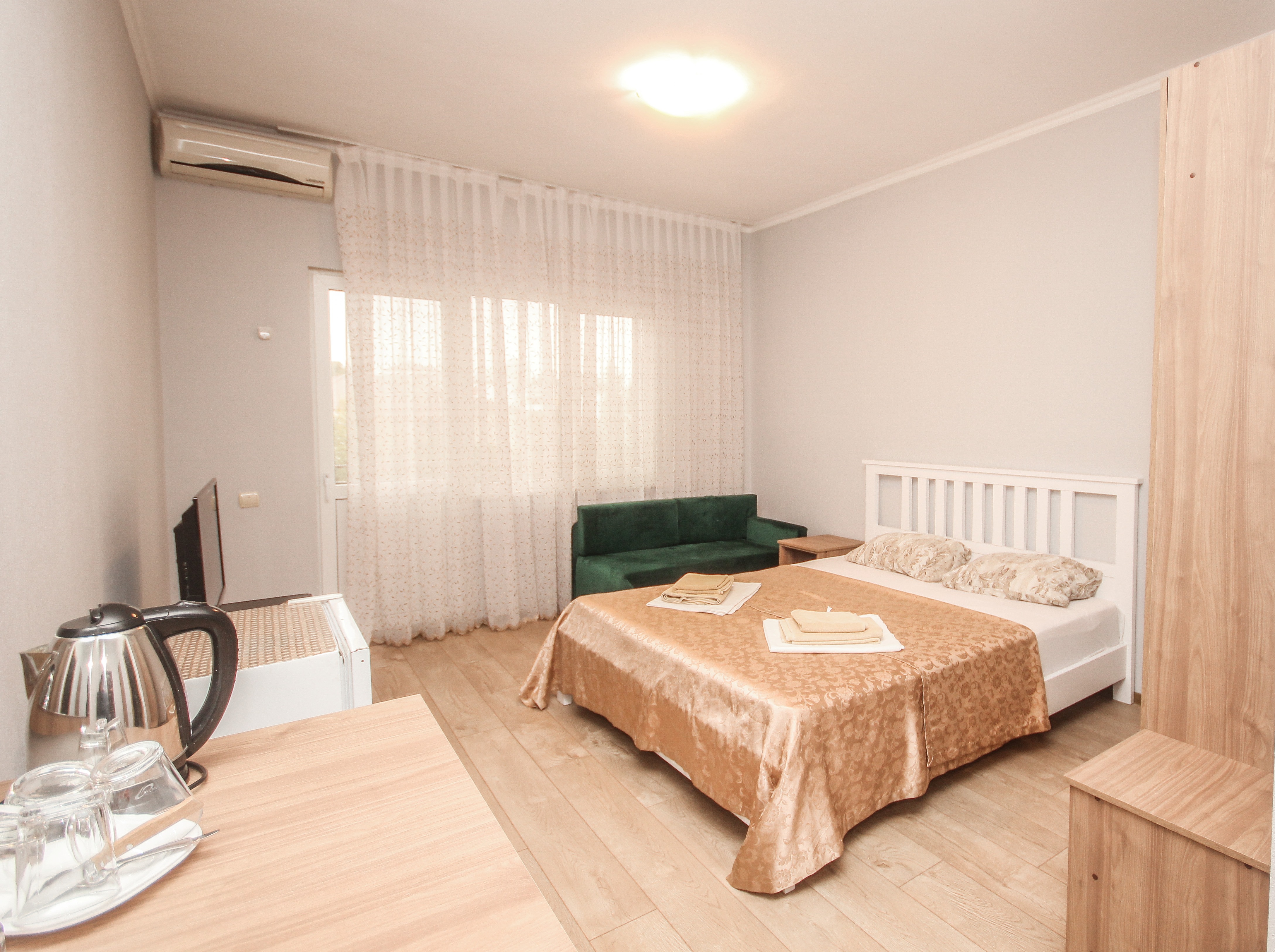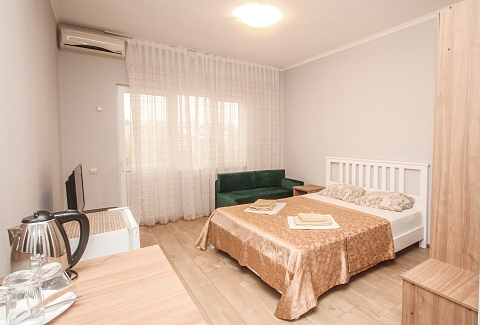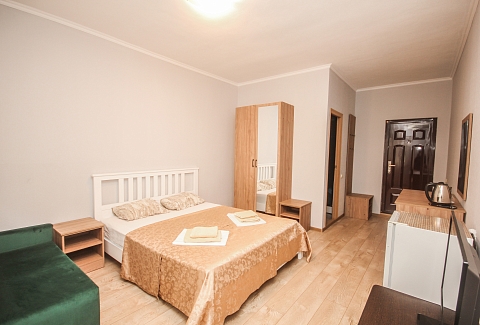 В номере: вешалка, диван, диван раскладной, зеркало, кровать двуспальная, кровать односпальная, прикроватные тумбочки, пуфик, стол, столик журнальный, тумба, шкаф, кондиционер, телевизор, холодильник, чайный набор посуды, электрочайник