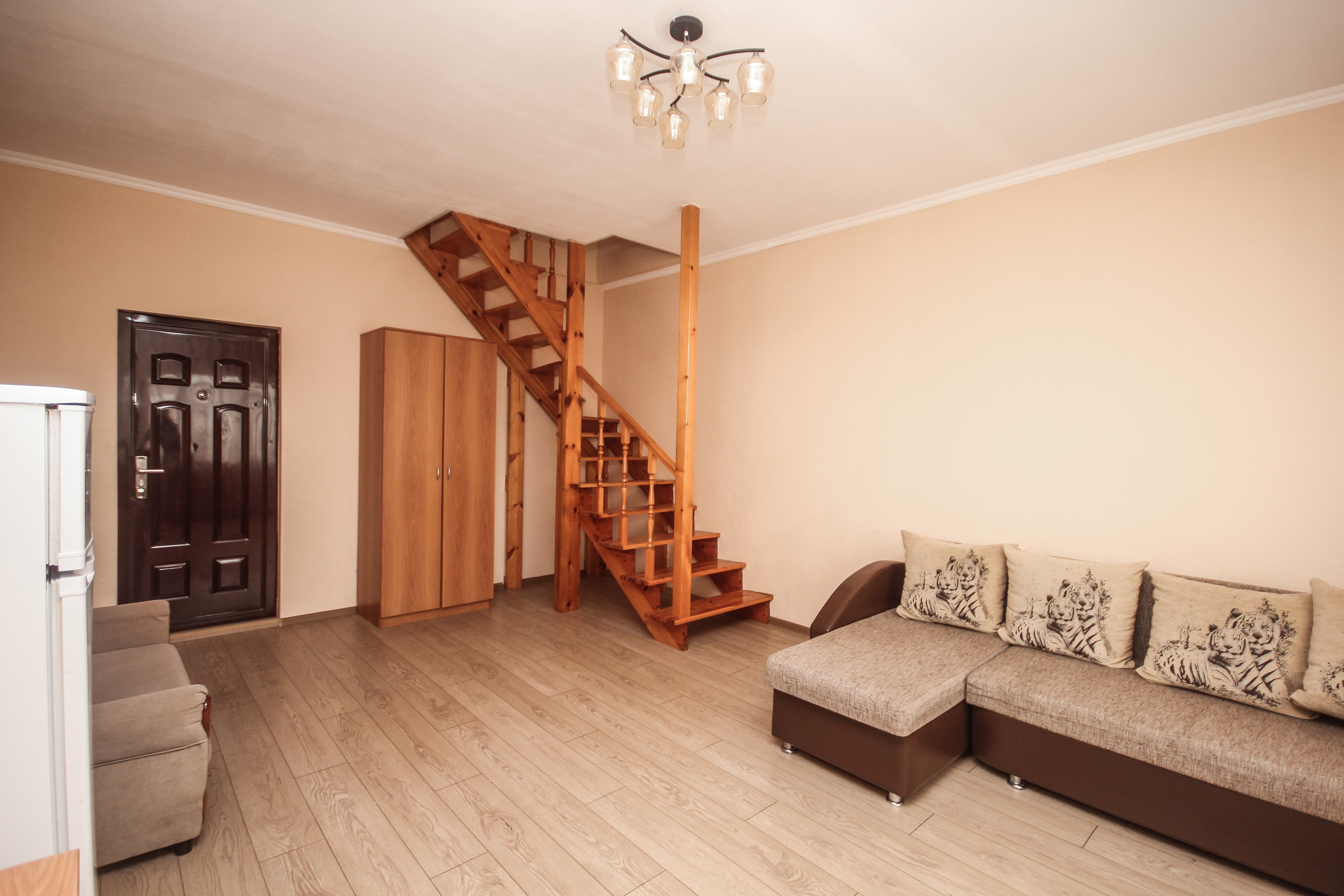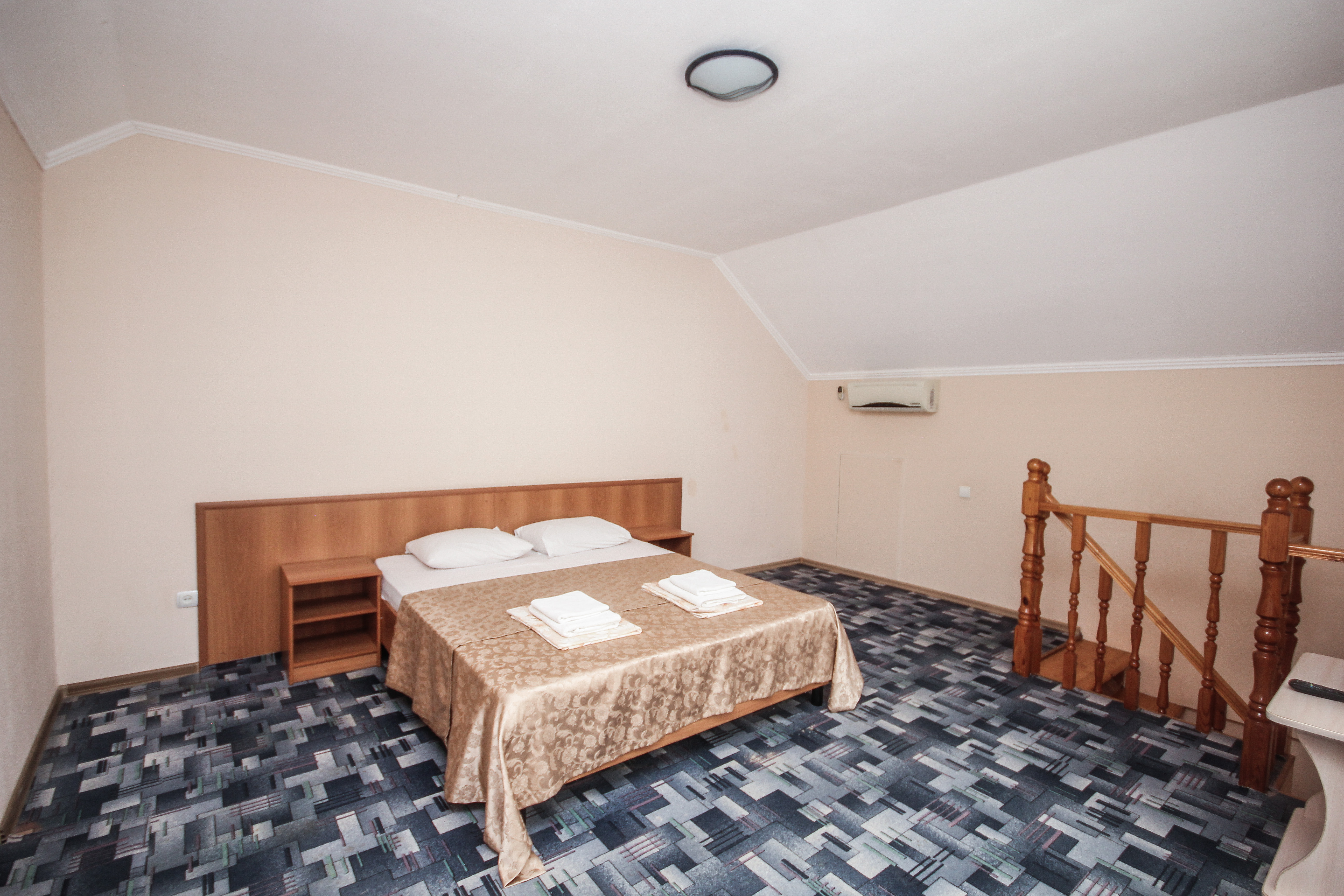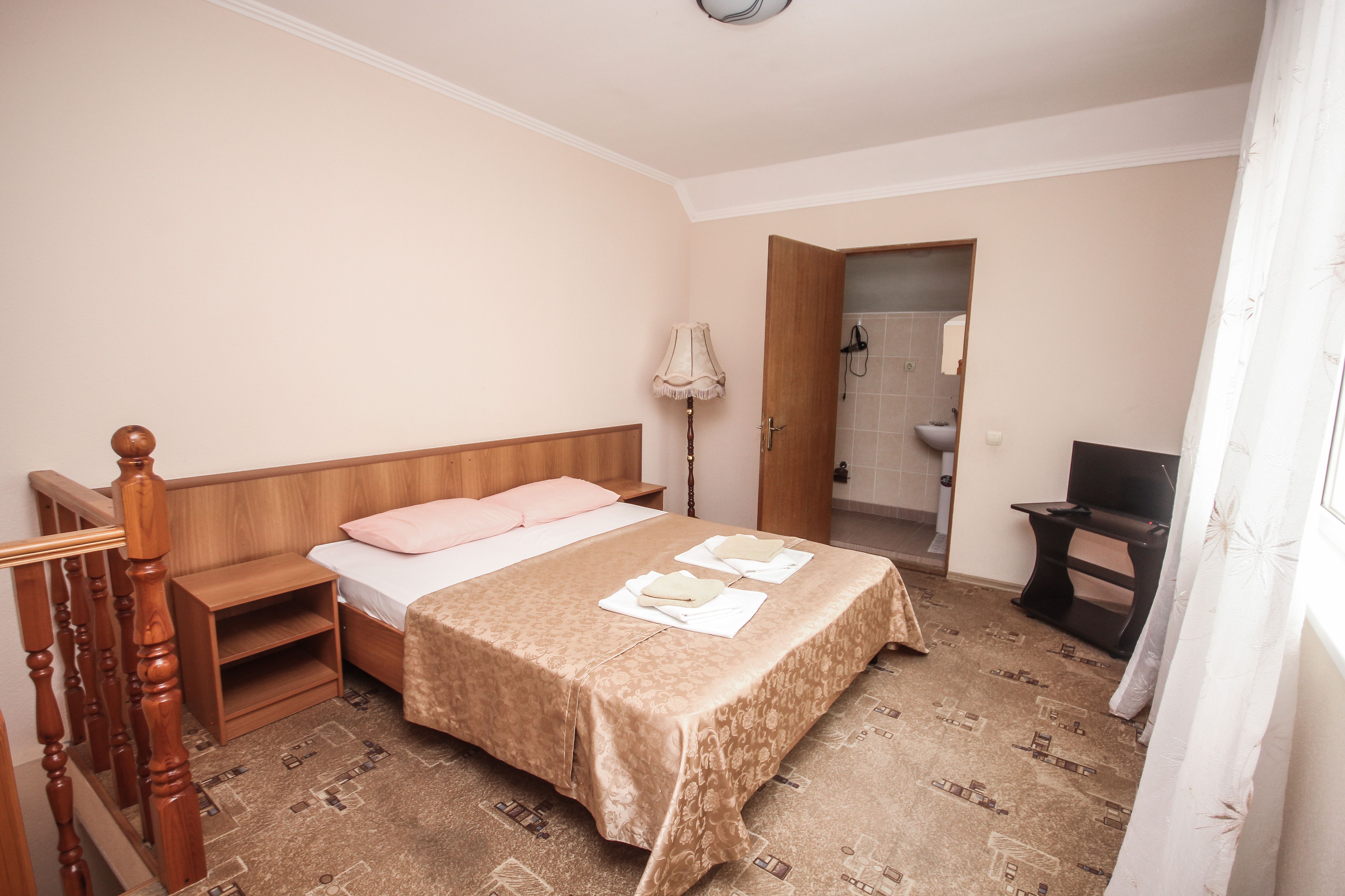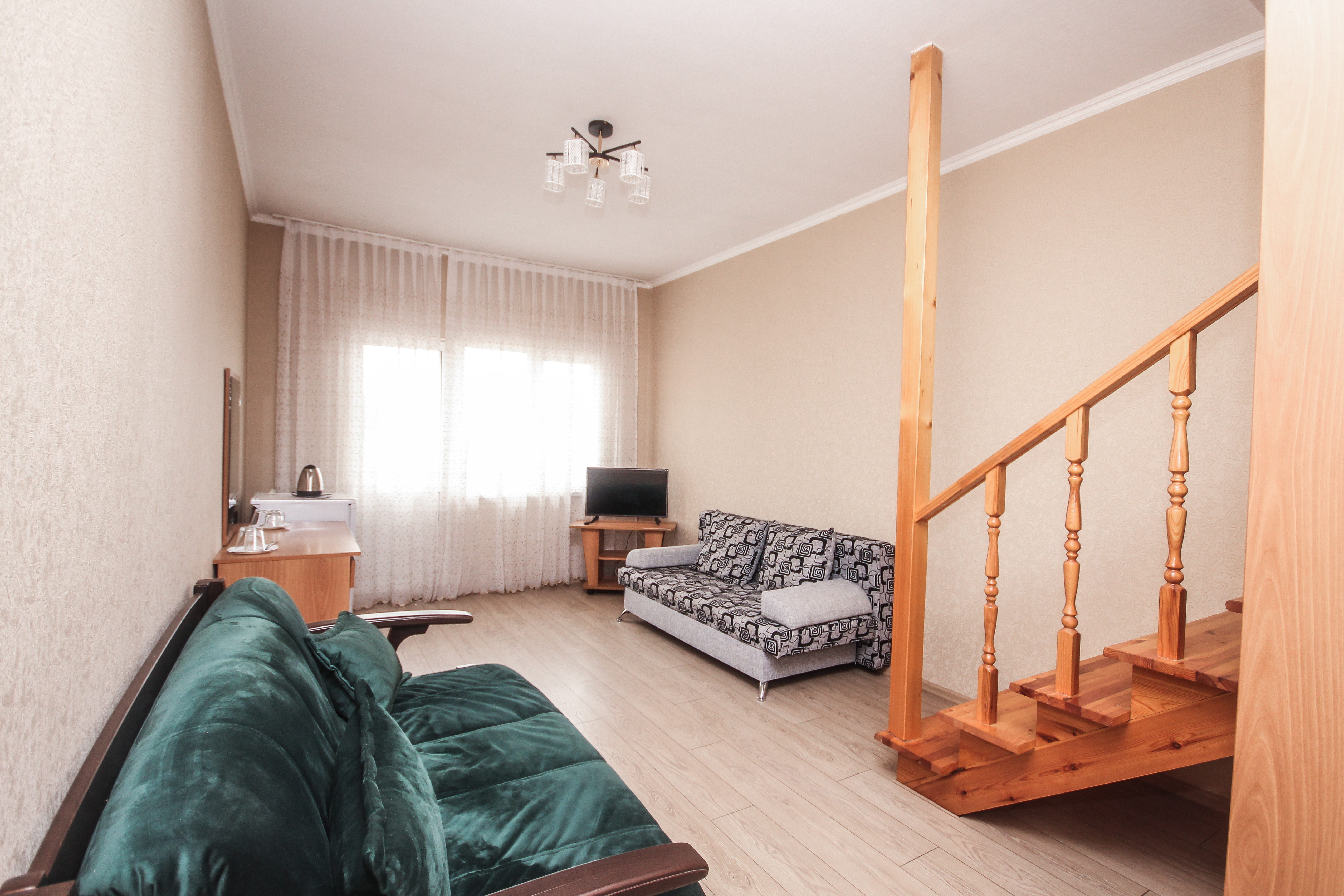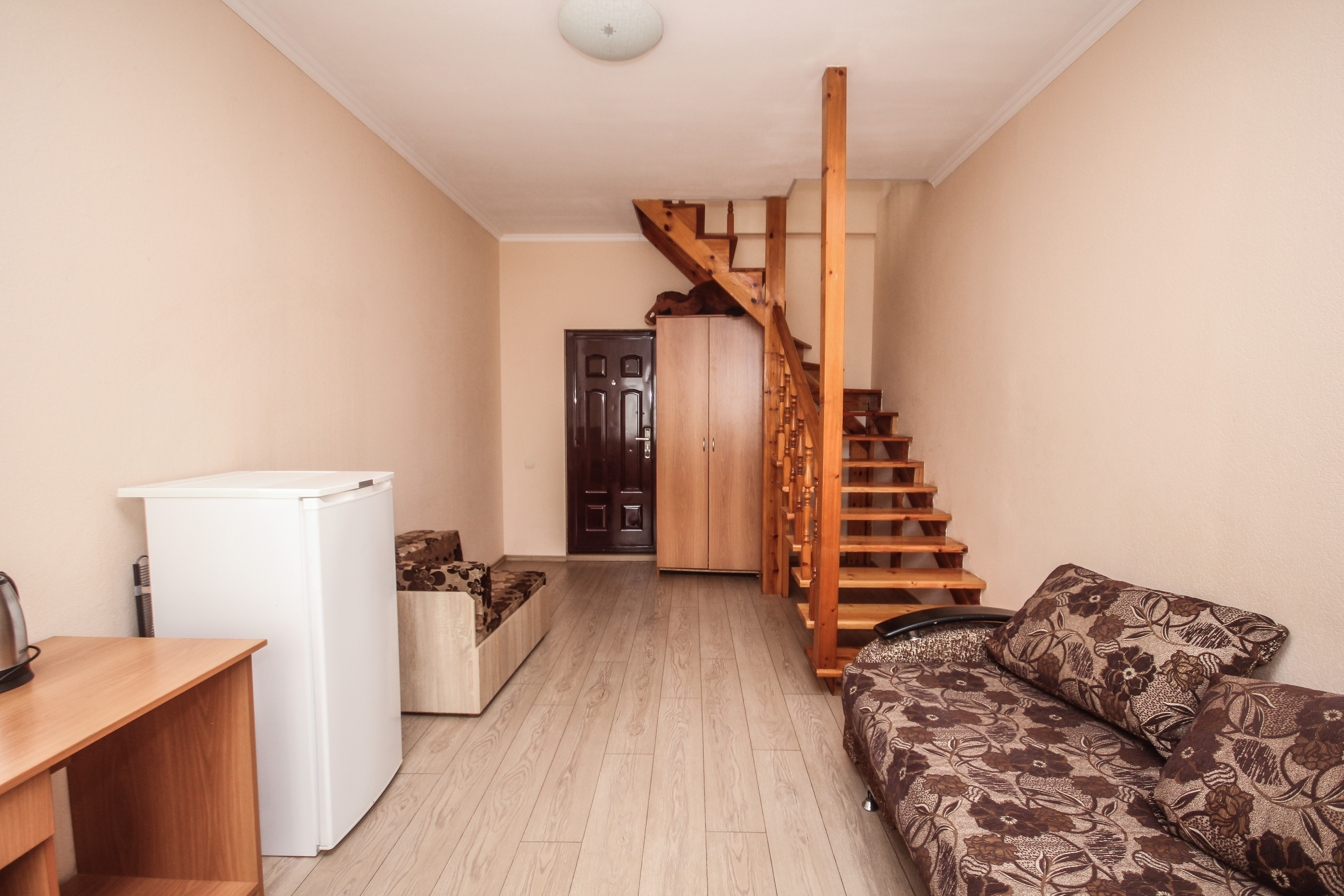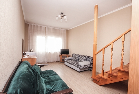В номере: вешалка, диван, диван раскладной, зеркало, кровать двуспальная, кровать односпальная, прикроватные тумбочки, пуфик, стол, столик журнальный, тумба, шкаф, кондиционер, телевизор, холодильник, чайный набор посуды, электрочайник