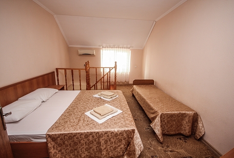 В номере: вешалка, зеркало, кровать двуспальная/ две полутороспальные кровати, кровать односпальная, прикроватные тумбочки, пуфик, стол, столик журнальный, шкаф, кондиционер, телевизор, холодильник, чайный набор посуды, электрочайник